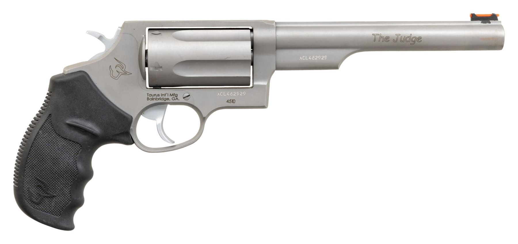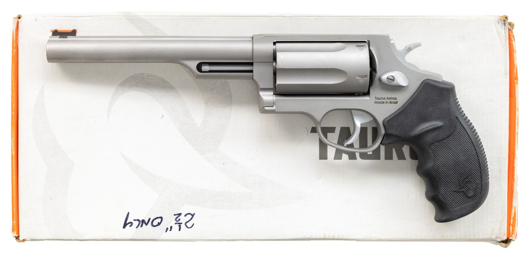 Cal. 45/410 (2 1/2". S# ACL482929. Bbl. 6 1/2". Fiber optic front sight. Fixed rear sight. 5-shot cyl. Stainless finish. Black rubber checkered grips with Taurus logos. UNATTACHED ACCESSORIES: matching numbered factory box in fair condition with manual & key. CONDITION: grips show some handling marks & wear. Metal shows moderate operational, carry handling wear. Action functions properly when hand cycled. Bright near excellent bore. (25-4914/MJC). MODERN. $350-550.