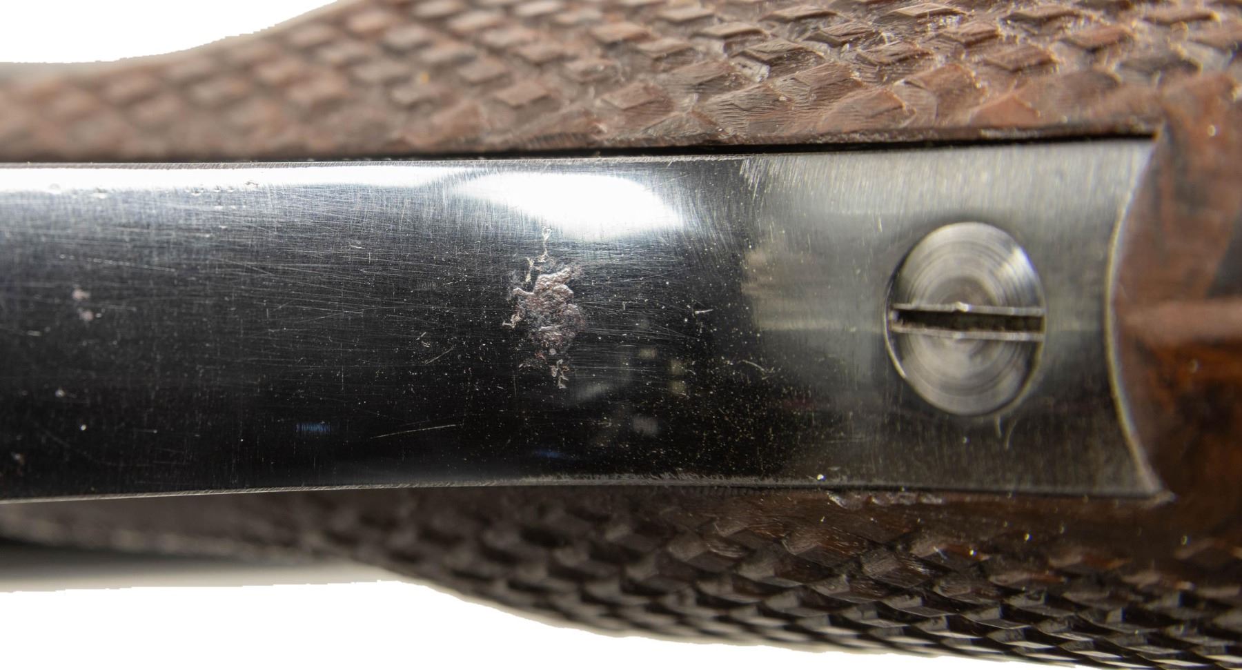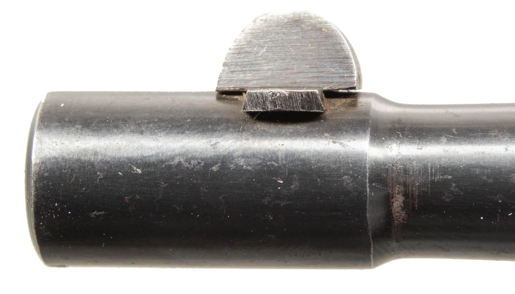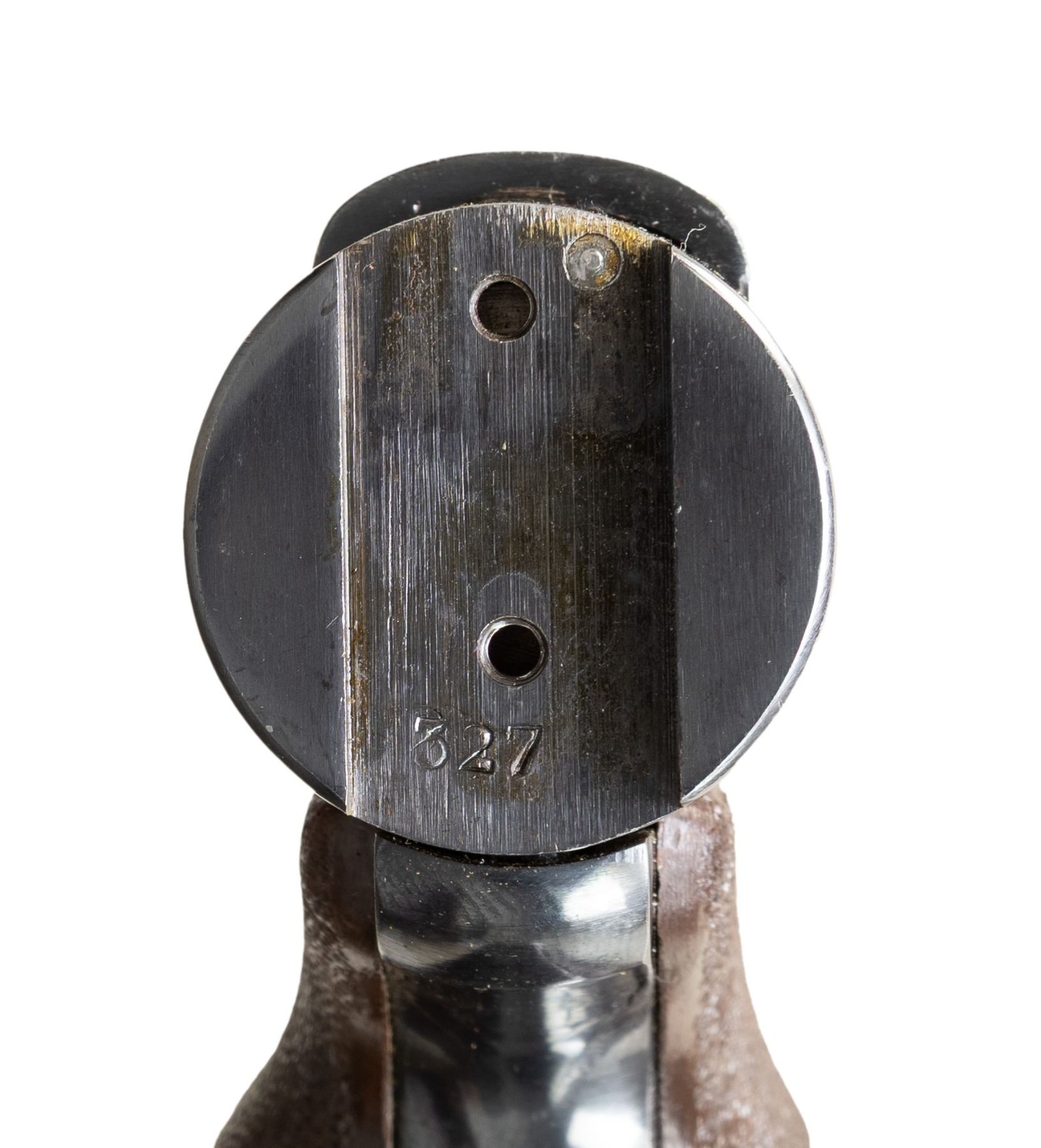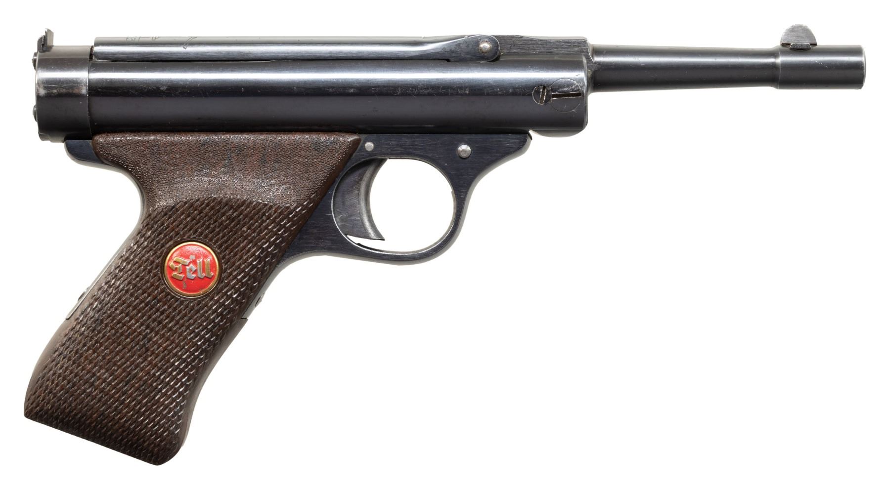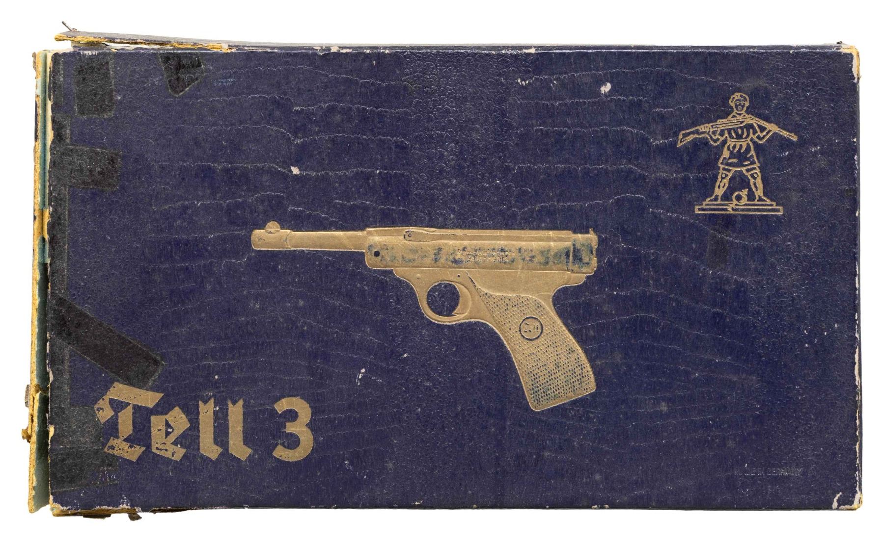 WITH ORIGINAL FACTORY BOX. Cal. .177. S# 327. Bbl. 5 1/16". 1 of only approx. 1,000 Tell Model 3 air pistols mfg. by Venus Waffenwerk circa. 1937-1940. The left side of the bbl. is marked "Kal. 4 1/2mm/ Cal. 177", with "VENUS-WAFFENWERK/ ZELLA-MEHLIS" above "MADE IN GERMANY" marked on the left side of the receiver. S# "327" is marked on the rear of the receiver, below the rear sight plate. Top of the cocking link is marked with a man and a break action (presumably) air rifle above "TELL/ MOD. 3". Metal components exhibit a blue finish overall. Frame is mounted with a 1-piece checkered and textured brown synthetic grip, each side inlaid with a gold and red medallion embossed "Tell". Thick dovetailed half-moon blade front sight with V-notch rear sight on adj. plate. UNATTACHED ACCESSORIES: original blue leatherette wrapped factory cardboard box. Box contains a full box of Milbro Jet .177 lightweight waisted pellets. CONDITION: metal components retain the vast majority of their original factory blue finish, exhibiting some light edge wear, some superficial handling marks, as well as some scattered spots of light surface oxidation overall. Underside of bbl. (at edge of muzzle) and underside of trigger guard each exhibit a small spot of mild surface oxidation. Bore is bright, exhibiting scattered spots of light to mild pitting, with patches of dark moderate pitting towards the center. Left side of bbl. exhibits a notable section of apparent pitting, creating a dark "hole" on one side. Proper manual mechanics. Grips are very good overall. Box is in poor condition, exhibiting tearing, most notably on the left side, with various taped repairs. Totaling an estimated 1,000 units produced, far fewer are estimated to have survived to the present day. An extremely scarce and sought after Venus Tell Model 3 air pistol. (02-26030/MLW). NON-GUN. $500-1,000.
