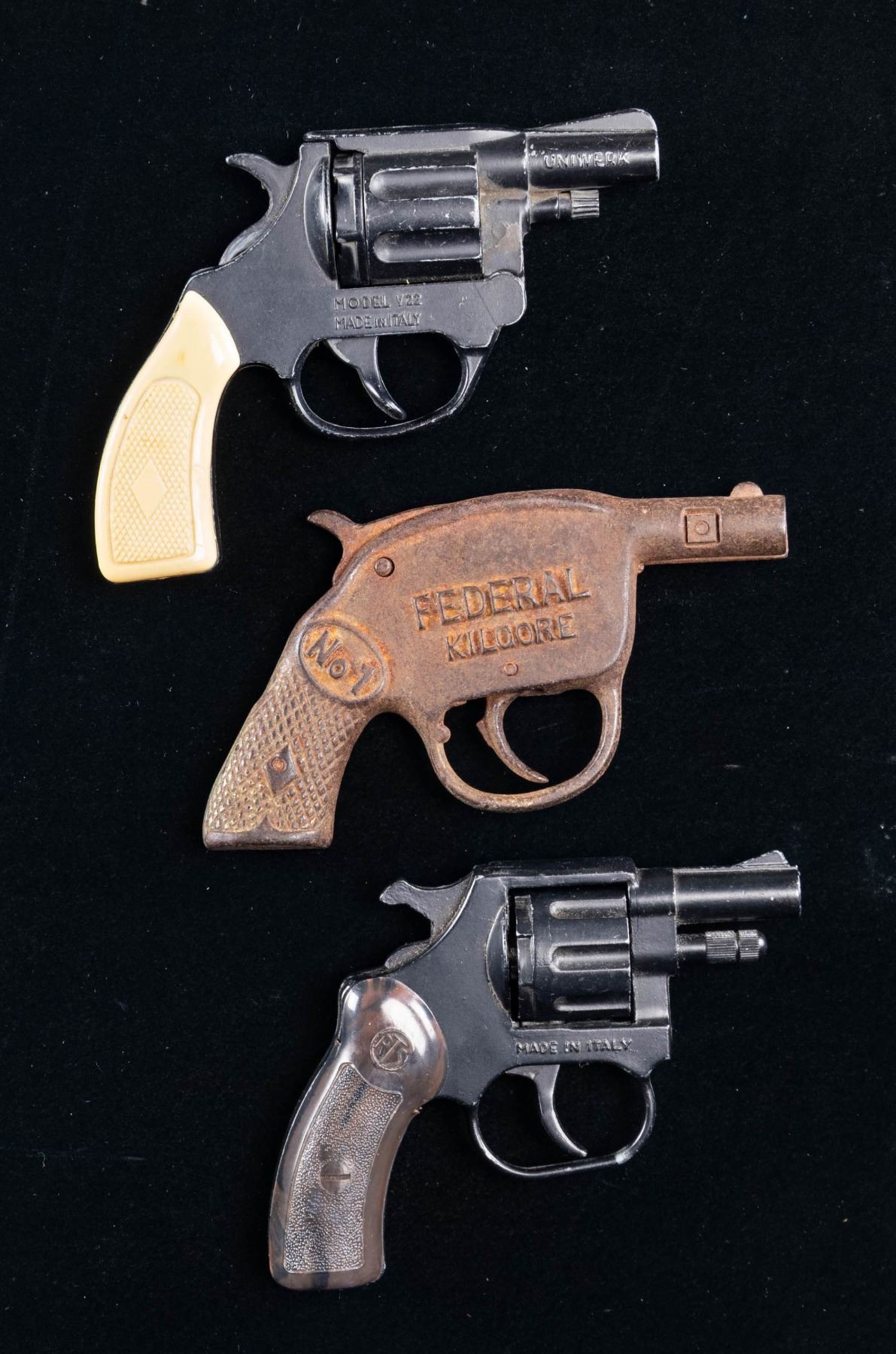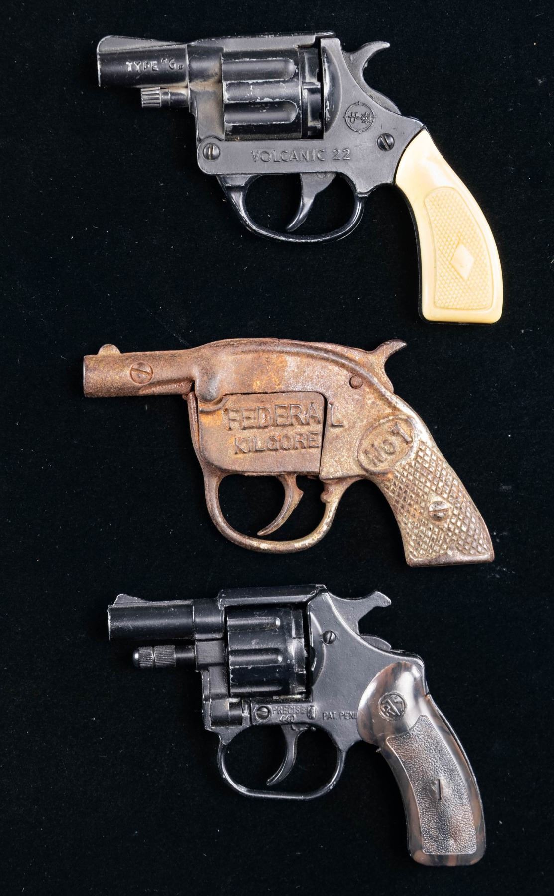 One cast iron "FEDERAL KILGORE", "VOLCANIC 22", and ‘PRECISE 440". CONDITION: fair to good overall. PROVENANCE: Estate Collection of Compton LaBauve Jr. (02-26492-1/JS). ANTIQUE. $50-100.