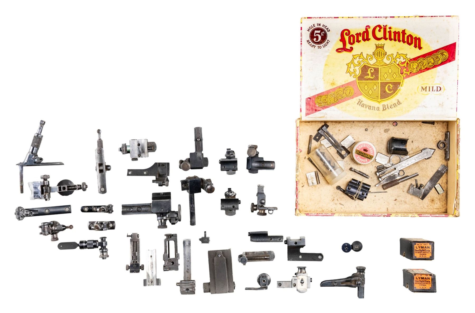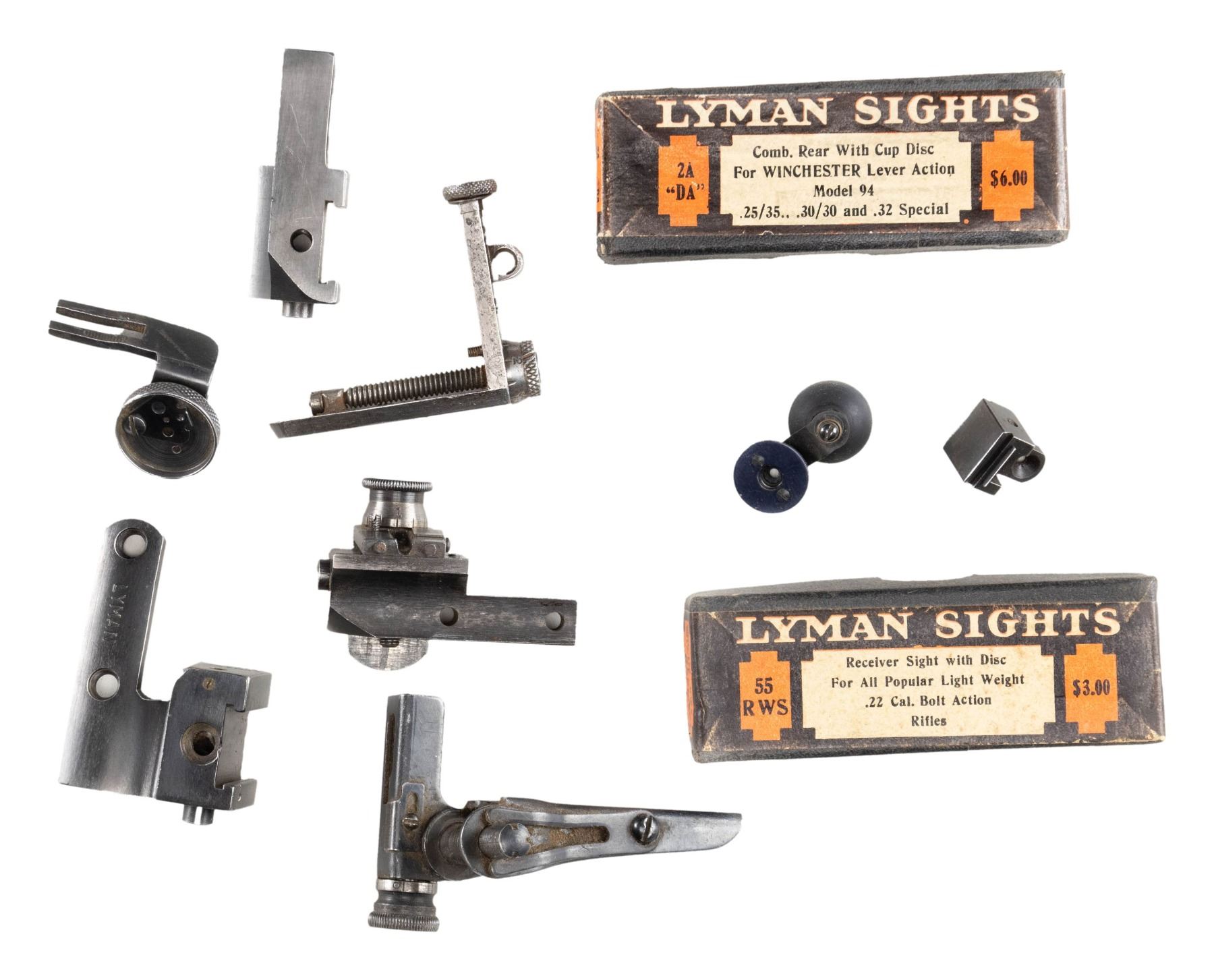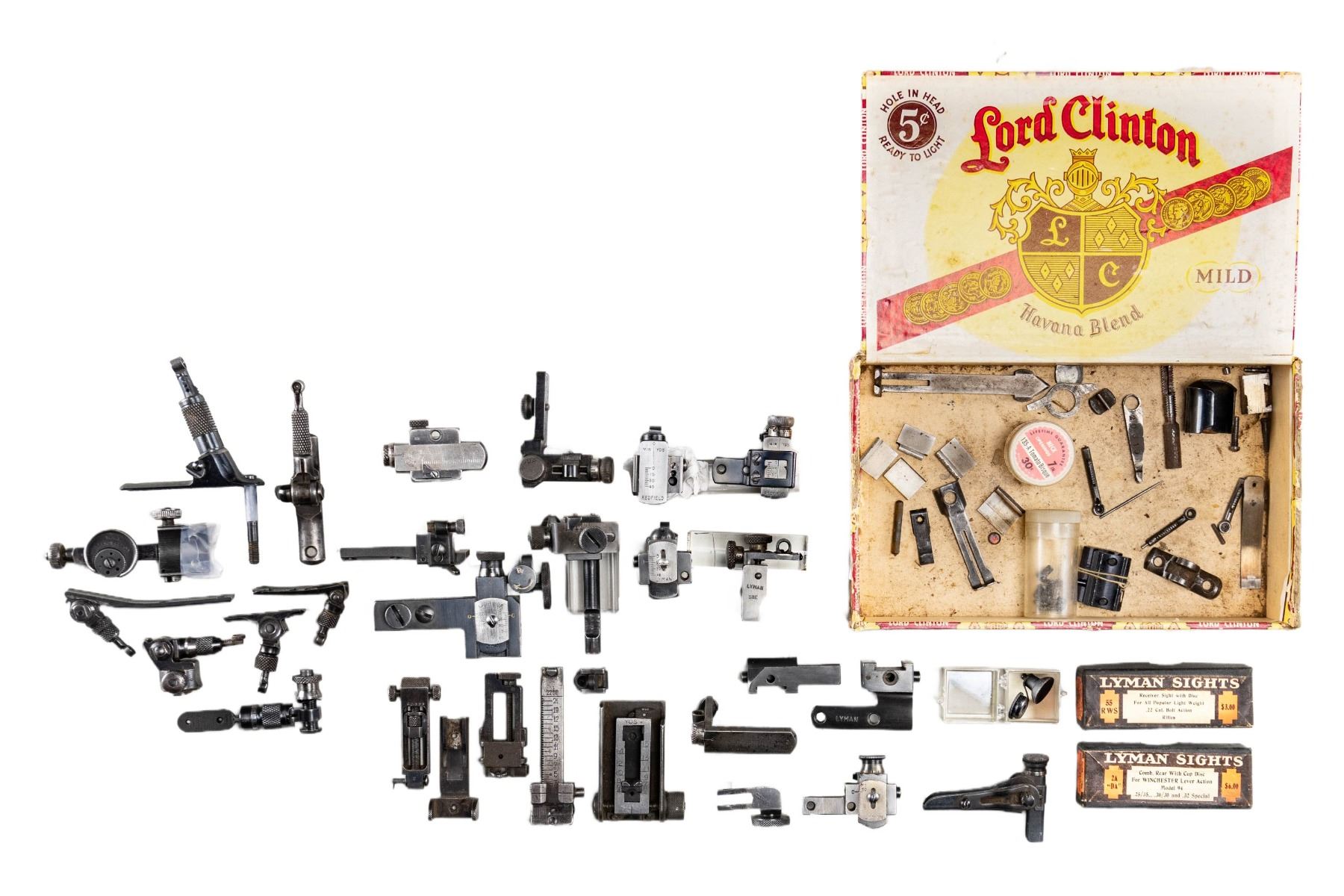 SIGHTS, ETC. All appear good to near excellent with dust present in corners of some. Missing mounting screws and discs unless noted. Considerable internet research done in addition to using sight reference books. Misc. parts listed at end. Major brands are BSA, Lyman, Marbles and Redfield. TANG SIGHTS: BSA No. 8 target sight with large disc having multi aperture feature and mounting screws; very good. Application is for small action Martini such as Canadian No. 12. / Lyman No. 15 marked "I" (Winchester Model 1876) and "N N" on underside ("N" is Win. Model 1886); near excellent with long tang screw only. / Lyman No. 2 Cocking Piece Combo sight for Springfield or Krag; very good. / Lyman Small Combo without lock plus marked "W61" on bottom; very good. / Lyman No. 1 with thin base, ring and 2.2" hole spacing (no code mark); good to very good. / Lyman No. 1 parts set marked "E" (Marlin 1889 & 1894); fair. Base with stem missing flip aperture and pivot assembly. / Marbles "S1" marked tang sight for Savage Model 99; looks near excellent but lever spring assembly needs "clocking". / MILITARY SIGHTS (VG unless noted): post assembly with micrometer windage and elevation plus unusual oval "lollypop" shaped matte finished top marked "LYMAN" with two aperture holes plus numbers from "10" to "0". Missing small set screw to secure windage knob. Like new condition; for Johnson 1941 Light Machine gun. / 1,300 yard marked, milled British No, 4 Mk I sight assembly. / US 1918 A2 BAR 1,500 yard sight with base. / M1 Carbine 2 position "L" rear sight. / Norwegian Krag matching numbered rear sight slide assembly. / Martini Cadet rear sight slide assembly with base having front part cut off. / RECEIVER SIGHTS: Lyman 525 having over-under disc (included) positions; very good. / Lyman No, 40 for Savage Model 340 (etc.) with disc; near excellent. / Lyman 52 Extension sight without base; very good. / Lyman 48 (early with leaf spring) internally marked "76" (assembly number) and "F" (Winchester 52 Sporter); good. Missing windage knob and end but will function via slot added to windage screw. Slide has 150 points but shortened very slightly so that 150 just barely shows. / Lyman 58E for Winchester Model 75; very good. / Lyman 57 WJS with coin slot knobs for many popular bolt action rifles; very good. / Redfield 70 Series marked "C" for Winchester Models 56, 57, 69, 72 and 75 Sporter; near excellent. / Redfield No. 75 (no code marking); very good plus. / Redfield 80 Series without letter code (for curved receiver); missing slide cover, otherwise very good. / PARTS: Merit Delux Optical Attachment for shooting glasses; near excellent in original plastic box. / Lyman 55RWS sight box; very good. \ Lyman 2A "DA" sight box; near excellent. / Mossberg S-100 receiver sight missing all of windage adjustment assembly except knob; good. / Lyman 57ES receiver sight base only; good. / Lyman 57RS receiver sight missing all of windage assembly; good to VG. / Lyman 57SA receiver sight base only; very good. / Lyman 48 slide assembly having 150 points; fair to good with cleaned legend oxidation. / Lyman basic receiver sight part missing base and clamp knob but has multi aperture target disc; very good. / stems, screws, sights and misc. pieces not worthy of listing (see last image group). PROVENANCE: Norman Olliff Estate. (02-25726/NW). $1,500-2,500.