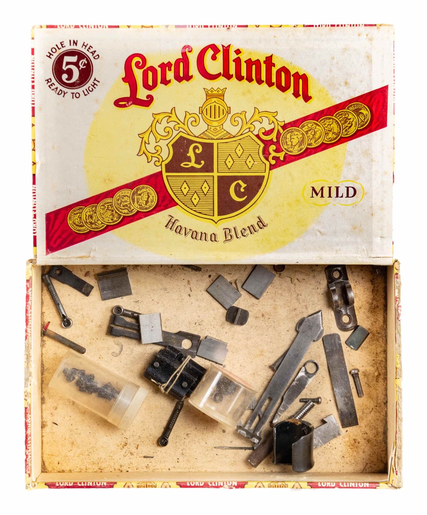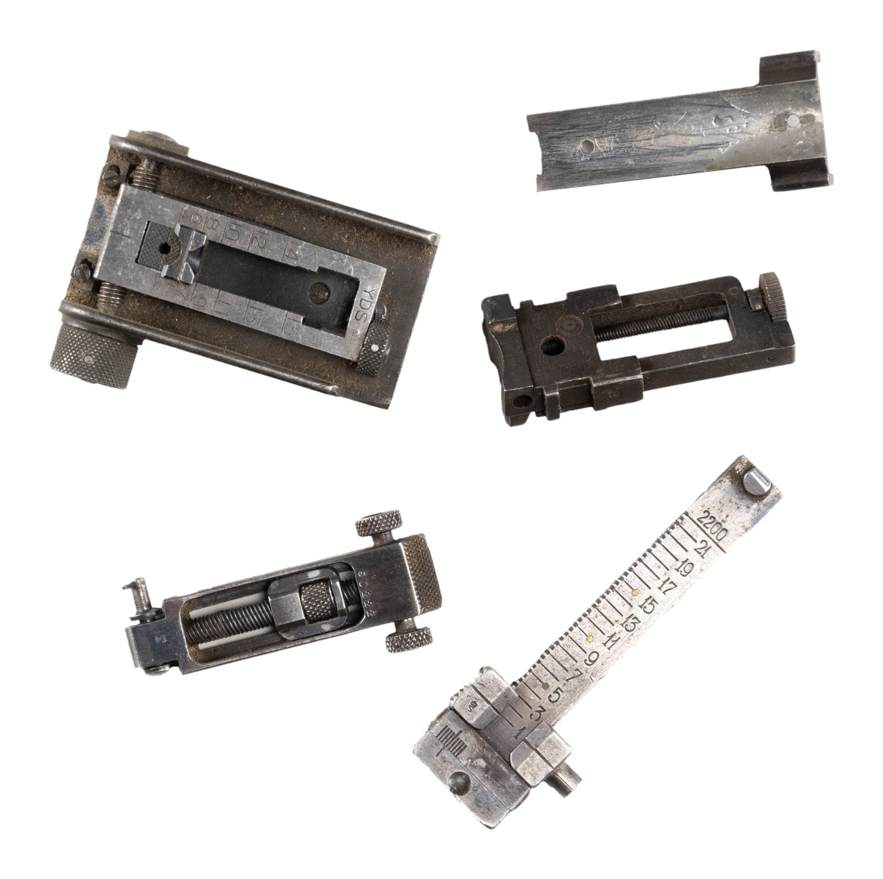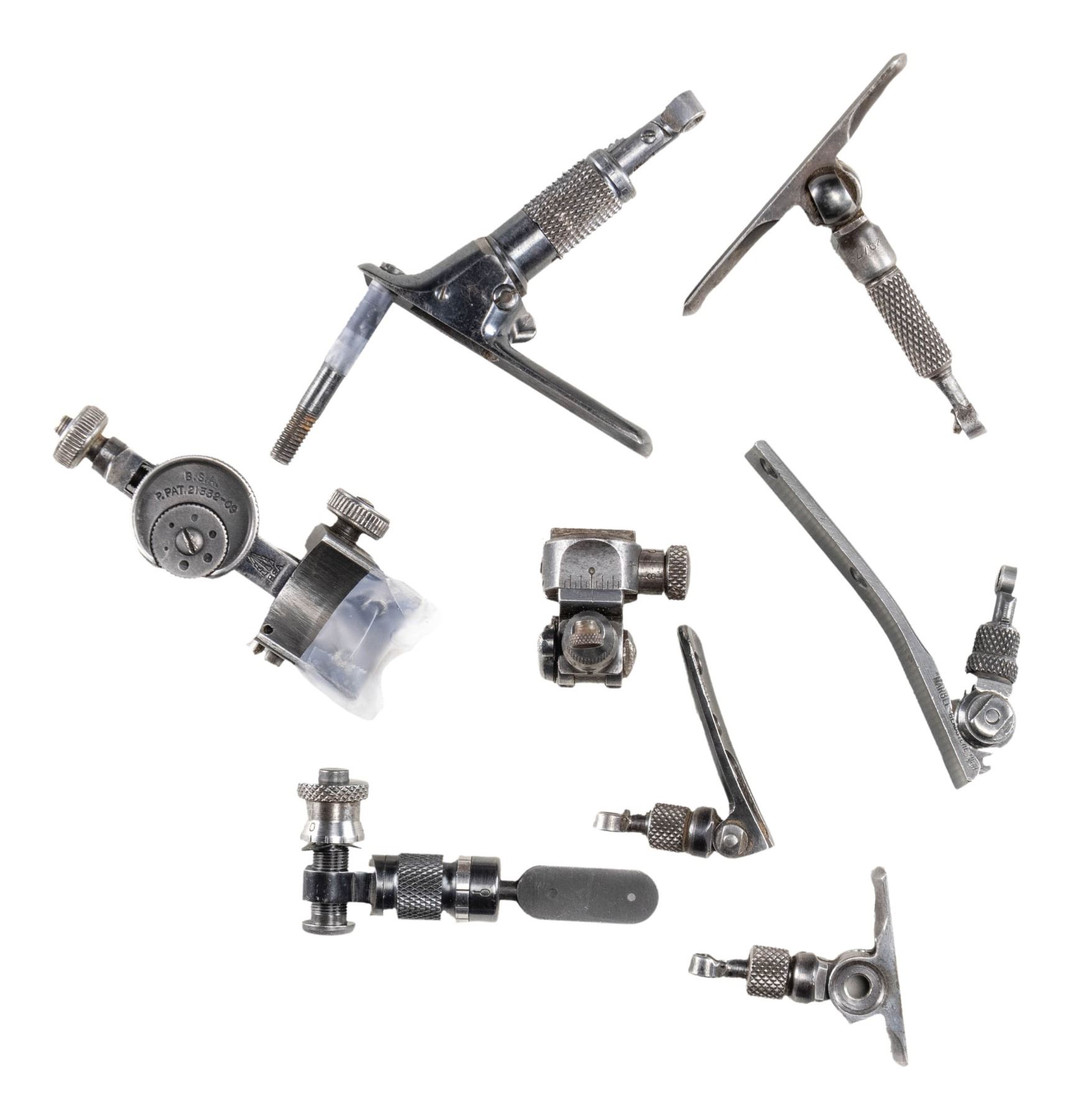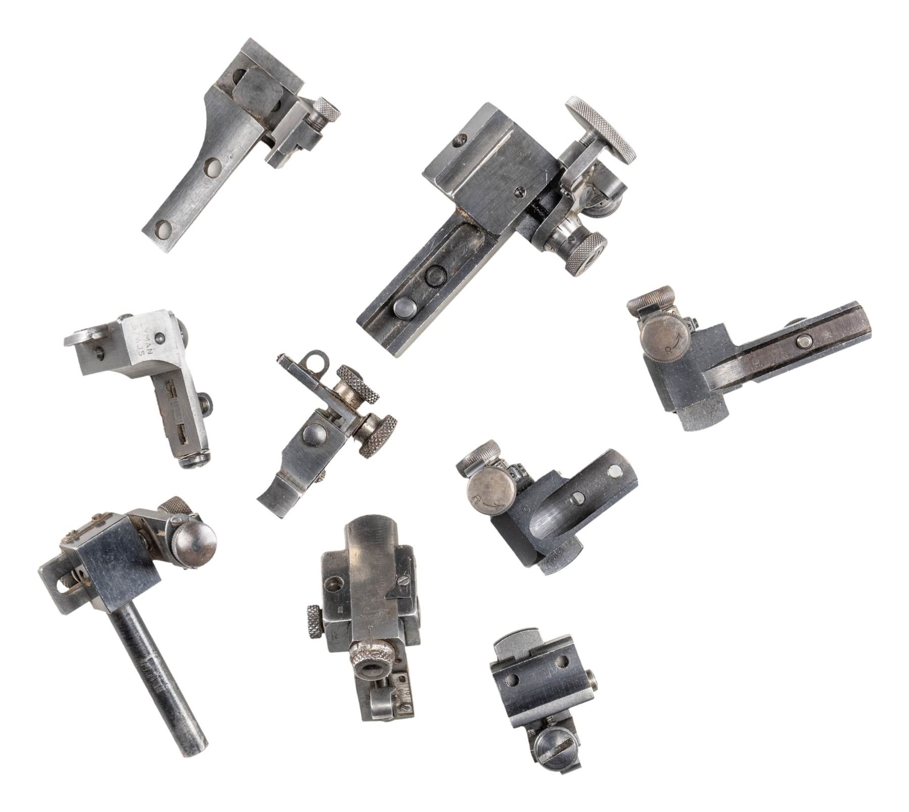 SIGHTS, ETC. All appear good to near excellent with dust present in corners of some. Missing mounting screws and discs unless noted. Considerable internet research done in addition to using sight reference books. Misc. parts listed at end. Major brands are BSA, Lyman, Marbles and Redfield. TANG SIGHTS: BSA No. 8 target sight with large disc having multi aperture feature and mounting screws; very good. Application is for small action Martini such as Canadian No. 12. / Lyman No. 15 marked "I" (Winchester Model 1876) and "N N" on underside ("N" is Win. Model 1886); near excellent with long tang screw only. / Lyman No. 2 Cocking Piece Combo sight for Springfield or Krag; very good. / Lyman Small Combo without lock plus marked "W61" on bottom; very good. / Lyman No. 1 with thin base, ring and 2.2" hole spacing (no code mark); good to very good. / Lyman No. 1 parts set marked "E" (Marlin 1889 & 1894); fair. Base with stem missing flip aperture and pivot assembly. / Marbles "S1" marked tang sight for Savage Model 99; looks near excellent but lever spring assembly needs "clocking". / MILITARY SIGHTS (VG unless noted): post assembly with micrometer windage and elevation plus unusual oval "lollypop" shaped matte finished top marked "LYMAN" with two aperture holes plus numbers from "10" to "0". Missing small set screw to secure windage knob. Like new condition; for Johnson 1941 Light Machine gun. / 1,300 yard marked, milled British No, 4 Mk I sight assembly. / US 1918 A2 BAR 1,500 yard sight with base. / M1 Carbine 2 position "L" rear sight. / Norwegian Krag matching numbered rear sight slide assembly. / Martini Cadet rear sight slide assembly with base having front part cut off. / RECEIVER SIGHTS: Lyman 525 having over-under disc (included) positions; very good. / Lyman No, 40 for Savage Model 340 (etc.) with disc; near excellent. / Lyman 52 Extension sight without base; very good. / Lyman 48 (early with leaf spring) internally marked "76" (assembly number) and "F" (Winchester 52 Sporter); good. Missing windage knob and end but will function via slot added to windage screw. Slide has 150 points but shortened very slightly so that 150 just barely shows. / Lyman 58E for Winchester Model 75; very good. / Lyman 57 WJS with coin slot knobs for many popular bolt action rifles; very good. / Redfield 70 Series marked "C" for Winchester Models 56, 57, 69, 72 and 75 Sporter; near excellent. / Redfield No. 75 (no code marking); very good plus. / Redfield 80 Series without letter code (for curved receiver); missing slide cover, otherwise very good. / PARTS: Merit Delux Optical Attachment for shooting glasses; near excellent in original plastic box. / Lyman 55RWS sight box; very good. \ Lyman 2A "DA" sight box; near excellent. / Mossberg S-100 receiver sight missing all of windage adjustment assembly except knob; good. / Lyman 57ES receiver sight base only; good. / Lyman 57RS receiver sight missing all of windage assembly; good to VG. / Lyman 57SA receiver sight base only; very good. / Lyman 48 slide assembly having 150 points; fair to good with cleaned legend oxidation. / Lyman basic receiver sight part missing base and clamp knob but has multi aperture target disc; very good. / stems, screws, sights and misc. pieces not worthy of listing (see last image group). PROVENANCE: Norman Olliff Estate. (02-25726/NW). $1,500-2,500.