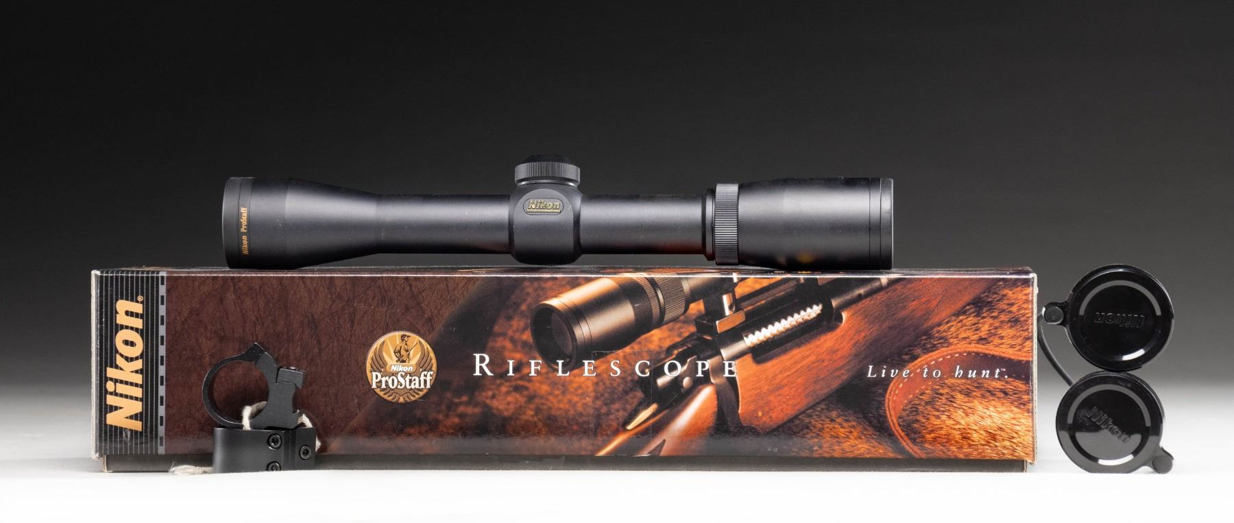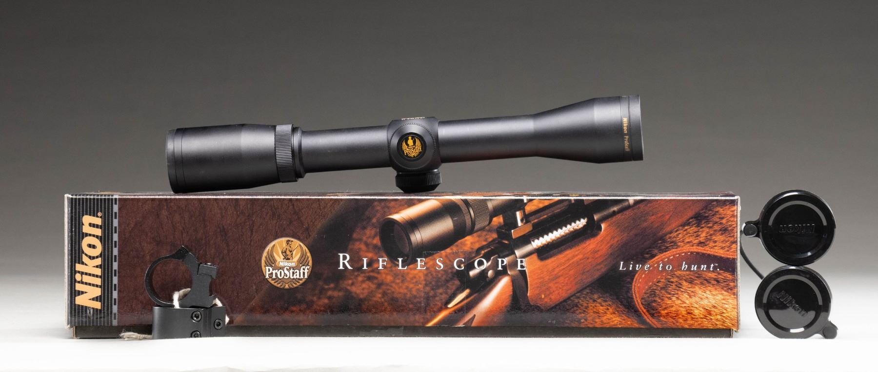 SCOPE WITH FACTORY BOX. ProStaff 4x32mm Classic (Item #: 6305) rifle scope mfg. by Nikon. Scope features a matte black finish with a Nikoplex reticle. Complete with Nikon lens covers. UNATTACHED ACCESSORIES: factory cardboard box containing factory paperwork and a set of unmarked scope rings. CONDITION: excellent, with a few minor superficial marks on the exterior from handling and storage. Scope retains a clear and sharp optic. Box shows some light exterior wear, but otherwise remains sound. (02-25959/MLW). NON-GUN. $50-75.
