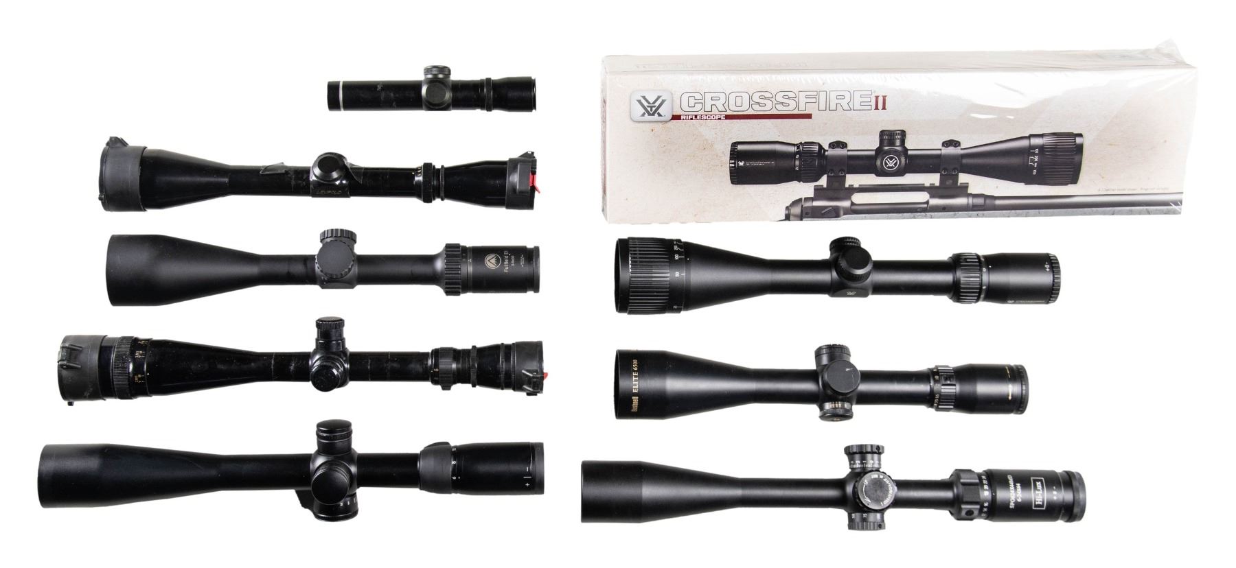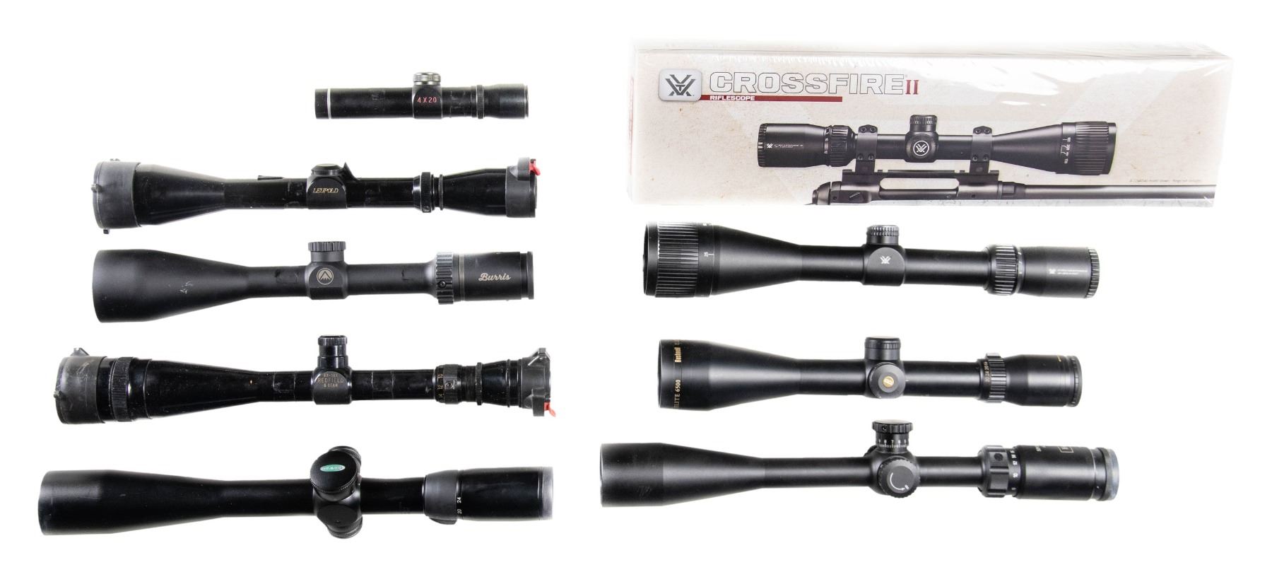 Lot of 9 assorted rifle scopes, including: 1) x1 sealed Vortex Crossfire II (Item #: CF2-31033) 6-18x44mm AO scope with Dead-Hold BDC reticle. 2) x1 Vortex Crossfire II (Item #: CF2-31045) 6-24x50mm AO scope with Dead-Hold BDC reticule. Scope remains in plastic packaging in its factory box. 3) x1 Weaver European Series Model 800725 6-24x42mm scope with Fine X-Hair reticle. Scope remains in plastic packaging in its factory box. 4) Leupold VARI-X II 3-9x scope. Complete with Butler Creek lens covers. 5) Burris Fullfield E1 3-9x50mm scope. 6) x1 Bushnell Elite 6500 (Model: 65-4305B) 4.5-30x50mm scope. Complete with unattached 2-piece scope rings and factory lens covers. 7) x1 Redfield 6 Star 6-18x scope. 8) x1 Hi-Lux Leatherwood (Model: SPG624X44MD) 6-24x44mm scope. Complete with lens covers. 9) x1 unmarked 4x20 scope. Complete with lens covers. CONDITION: boxed scopes are excellent. Loose scopes exhibit varying degrees of superficial handling marks, with all appearing to remain serviceable. (02-25751/MLW). NON-GUN. $800-1,200.
