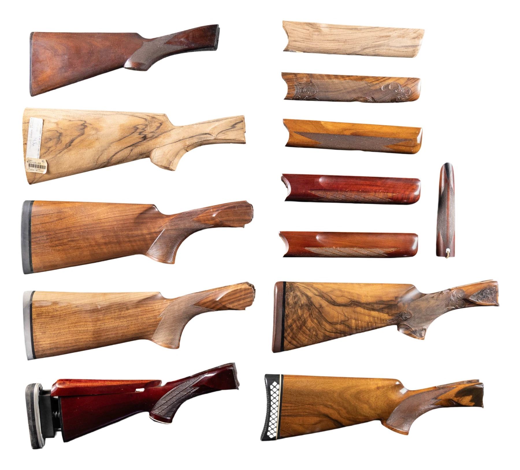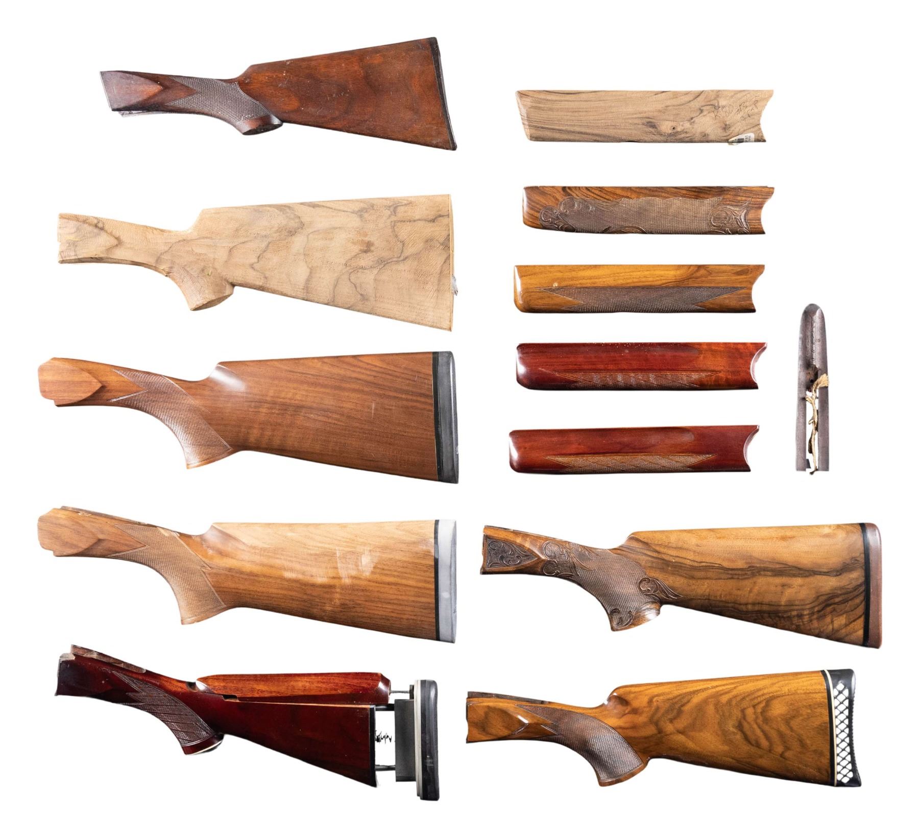 FOREARMS. No.1: Krieghoff Model 32 stock with lowered adjustable comb and adjustable recoil pad. Finish shows wear and handling marks. / No.2: Krieghoff K80 straight comb trap style stock. LOP is approximately 14 3/4" over a black ventilated White Line trap pad. Stock bolt is included. Left ear shows a large area of epoxy repair. Original finish shows scratches and marks. / No.3: Krieghoff K32 Custom stock and forearm set of fancy European walnut with hand checkering having elaborate carved borders. LOP is approximately 14 1/2" over a solid brown Decelerator pad. Wood has a non-gloss finish showing small scattered scratches and marks. / No.4: Krieghoff Model 32 Semi-Inlet #5 Skeet stock and forearm of fancy English walnut. Stock and forearm are unfitted and unfinished. / No.5: Krieghoff K80 forearm. Finish shows a few handling marks. / No.6: Krieghoff Model 32 forearm with red style finish showing moderate wear. / No.7: Krieghoff Model 32 forearm with red style finish showing light wear and scattered small marks. / No.8: Perazzi straight comb trap stock with original Perazzi solid black pad. Full length stock has good finish showing small handling marks. / No.9: Perazzi straight comb stock with solid black Perazzi pad. Stock appears to be full length with lowered comb with partially removed finish. Left panel of checkering has large scrapes rear the top. / No.10: Ithaca Flues Model 20 gauge pistol grip buttstock and splinter forearm, believed to be grade 2. S# 354070. Stock is full length with buttplate, grip cap is removed. Forearm is the Baker style for a non-ejector gun and has the ebony tip insert. Finish and checkering show moderate wear with scattered scratches and marks. Also included in the lot is a invitation to the duPONT / Krieghoff Annual Sporting Clays invitational shoot that took place at Vero Beach, Florida on February 13, 2002. PROVENANCE: Estate of Lloyd Robinson. (02-26051-2/DS). NON-GUN. $450-900.