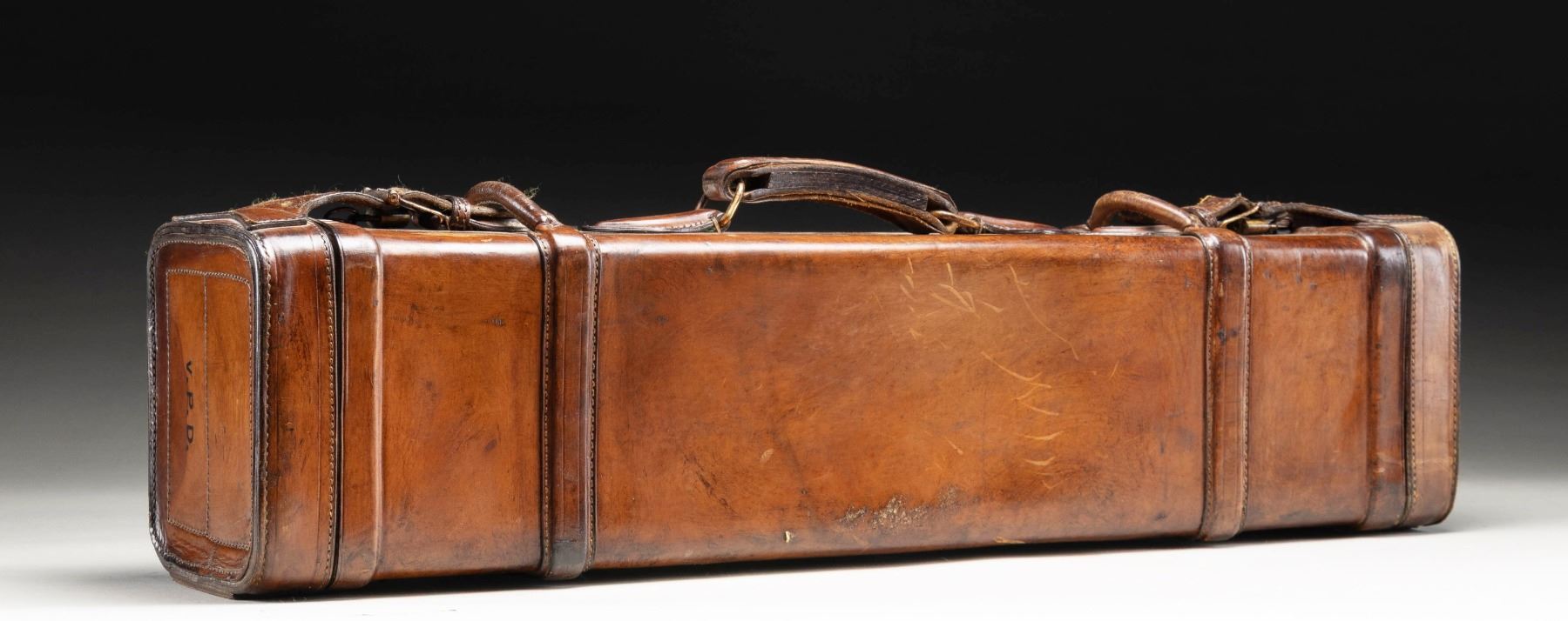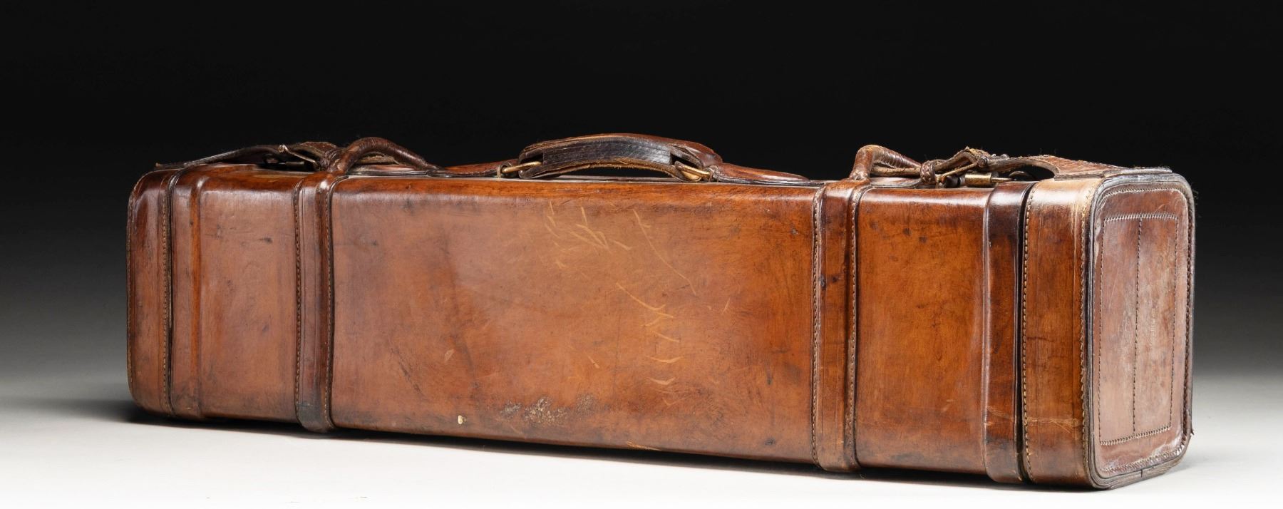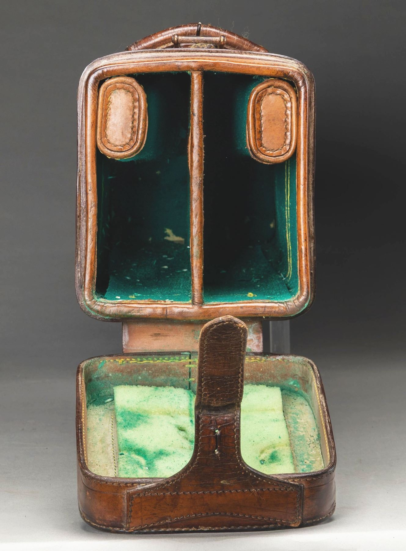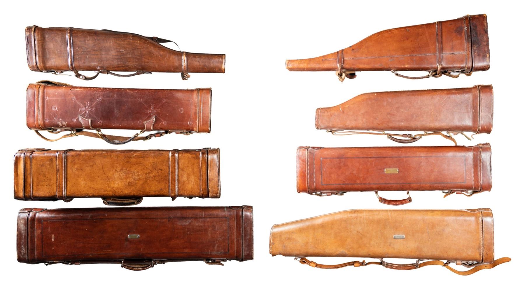 Also includes is 1 Pool cue case. CONDITION: cases are in good intact condition showing scuffs & cracking of leather. Interior shows fraying cloth. PROVENANCE: From the Private Collection of Berrien Moore III. (02-25884/MD). NON-GUN. $400-800.