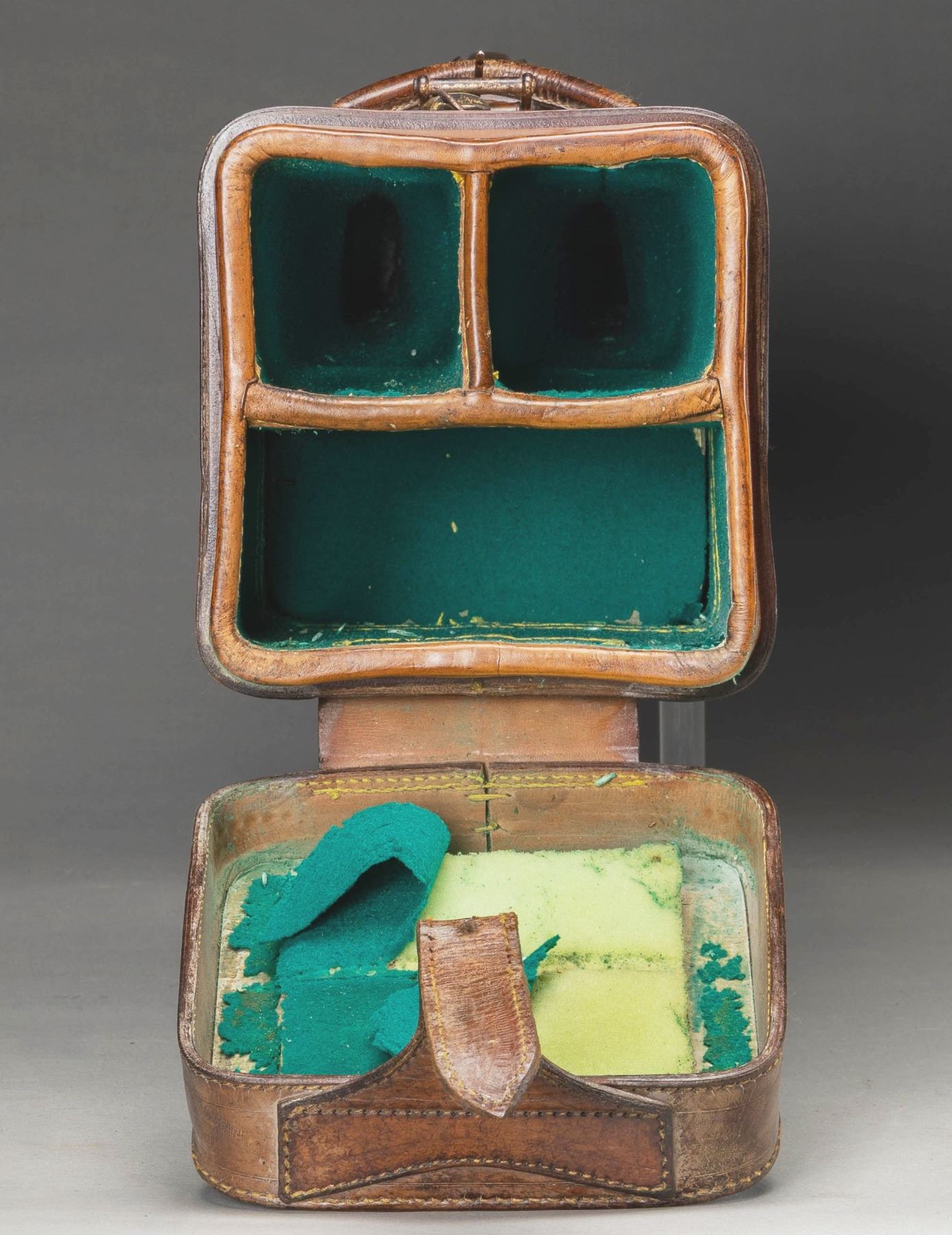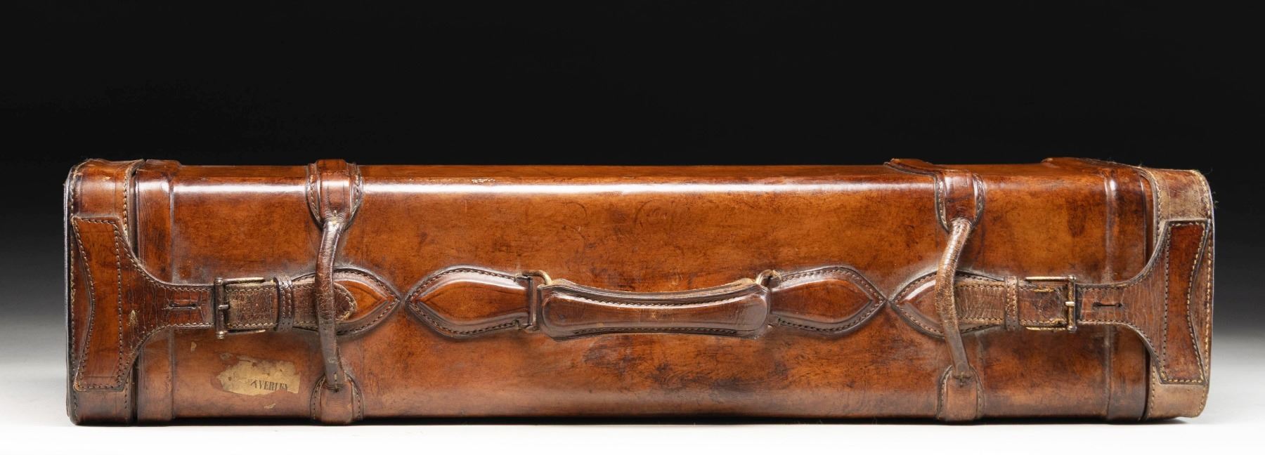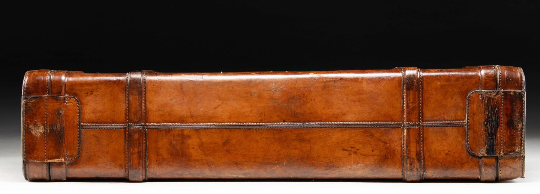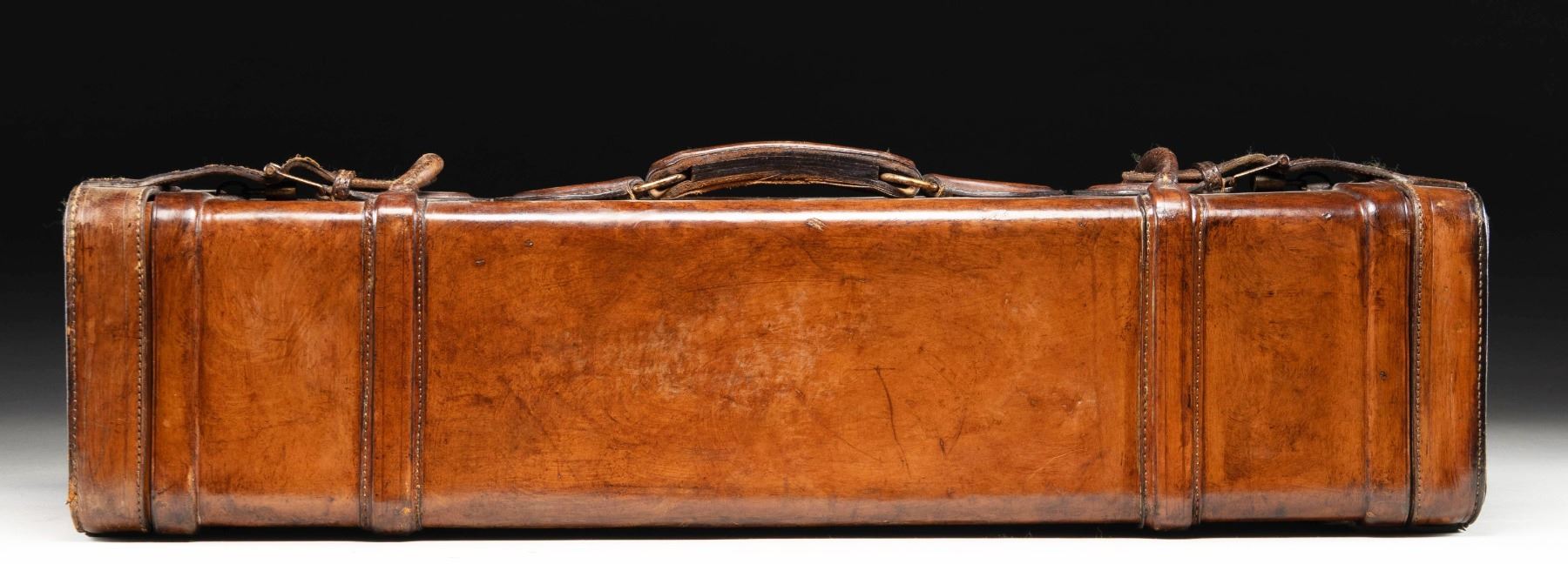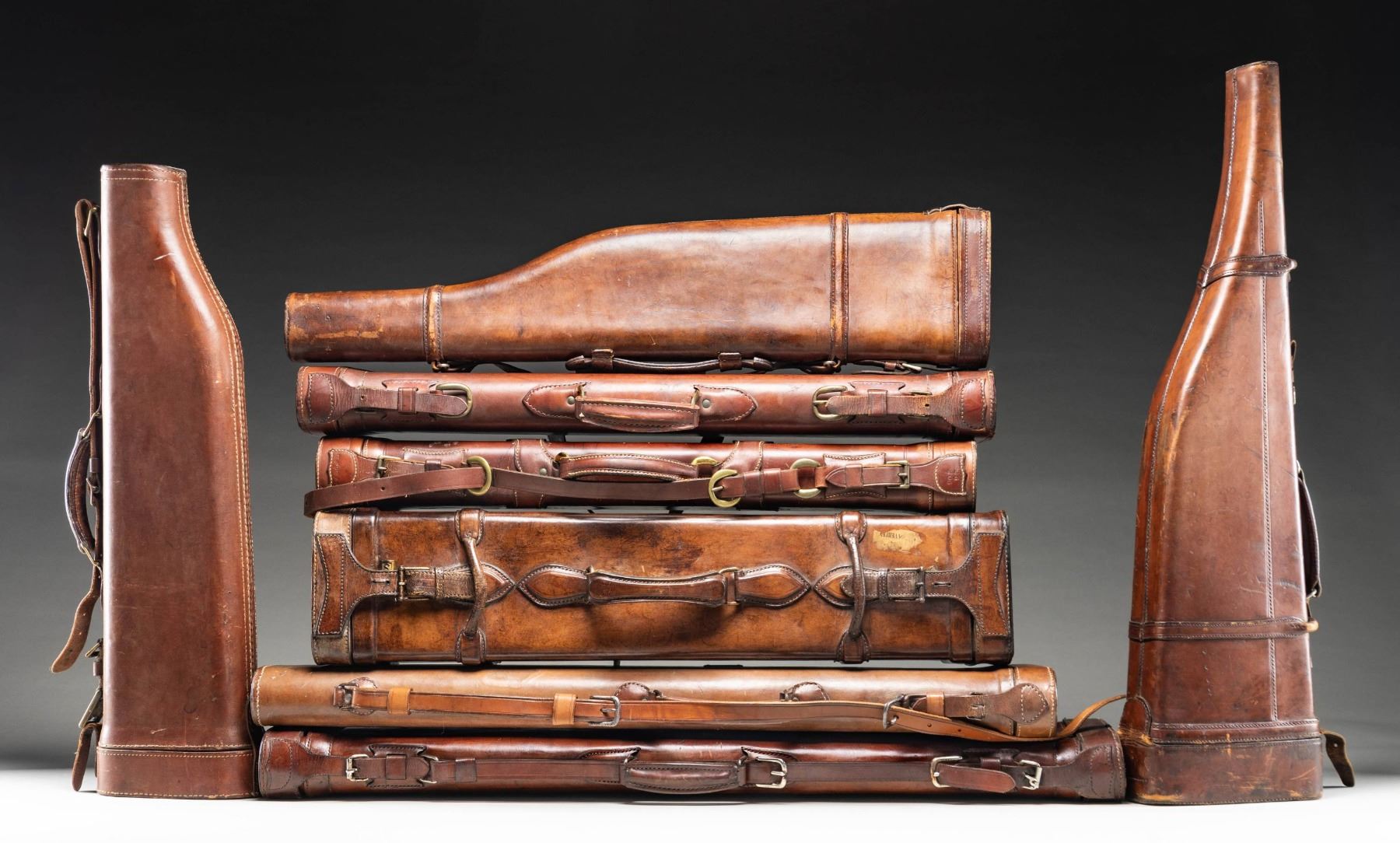 Also includes is 1 Pool cue case. CONDITION: cases are in good intact condition showing scuffs & cracking of leather. Interior shows fraying cloth. PROVENANCE: From the Private Collection of Berrien Moore III. (02-25884/MD). NON-GUN. $400-800.