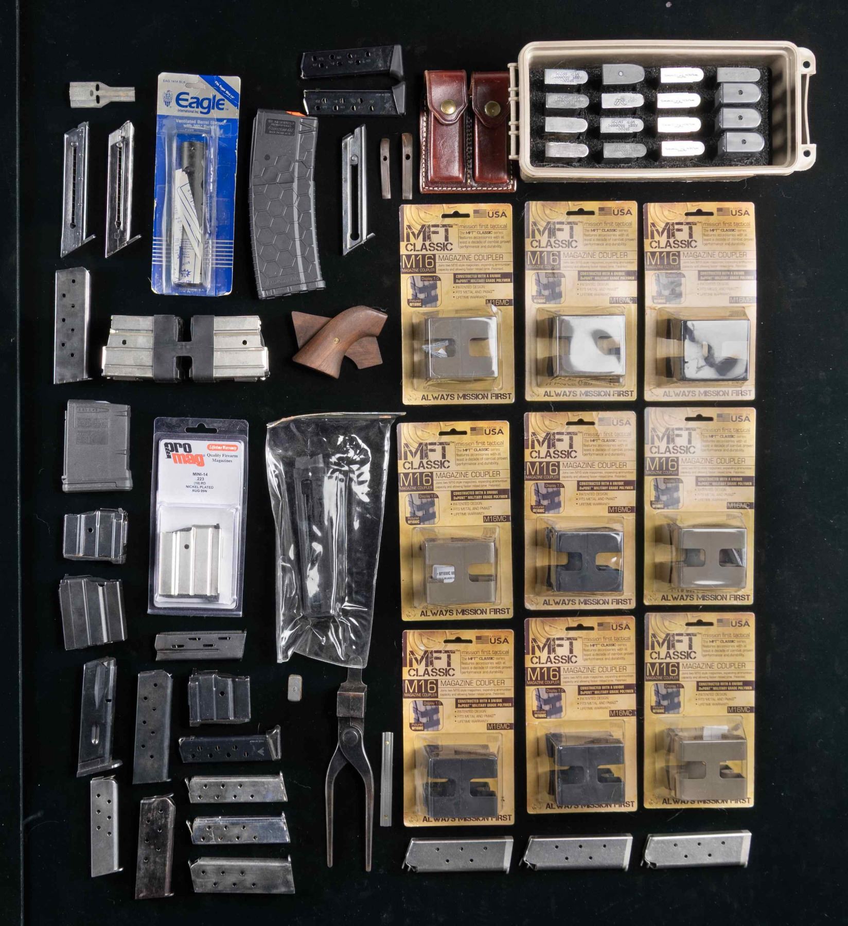 Lot of assorted mags. and accessories, including: 1) x8 Ruger Mini-14 mags. x5 ProMag stainless steel 10-rd. mags. (x4 in 4-mag coupler, x1 in factory packaging), x1 unmarked blued steel 10-rd. mag., and x2 Ruger factory blued steel 5-rd. mags. 2) x2 black polymer AR-15 mags. x1 MAGPUL PMAG 10-rd. 5.56x45mm NATO mag., x1 Hexmag HX-AR Series 2 10-rd. (resembles 30-rd. mag., but blocked at 10-rds.). 3) x9 Mission First Tactical M16MC 4-mag. couplers. 4) x1 Carl Walther Uzi 10-rd. .22 LR mag. 5) x19 assorted 1911 .45 ACP mags. from a variety of mfgs., including x1 Colt Ace .22 LR mag. Mags. are housed within a brown synthetic ammo can. 6) x2 (apparent) Colt Model 1900 8-rd. .38 ACP blued steel reproduction mags. 7) x1 Colt Huntsman 10-rd. .22 LR mag. with x2 grooved brown synthetic Huntsman grip adapters. 8) x2 High Standard .22 LR 10-rd. mags. (x1 2-tone Model B mag., x1 unidentified model). 9) x2 Colt Model 1902 Sporting / 1903 Pocket Hammer 7-rd. .38 ACP mags. marked "CAL. 38/ COLT" on the floorplate. 10) x2 Colt Model 1903 8-rd. .32 ACP mags. Mags. have been refinished in nickel plating. 11) x1 reproduction Colt Model 1908 7-rd. .380 ACP mag. 12) x1 Savage Model 1907 10-rd. .32 ACP mag. Mag. exhibits a reapplied blue finish. 13) x3 MEC-GAR Walther PP/PPK 8-rd. .380 ACP mags. x2 housed within a 2-cell Triple K brown leather pouch. 14) x1 unidentified (possibly CZ 75) 19-rd. mag. 15) Winchester .38 WCF bullet mold. Right side of mold is marked "MANUFACTURED BY THE/ WINCHESTER REP. ARMS CO./ NEW HAVEN. CONN. U.S.A.". Mold exhibits a blue finish overall. 16) x1 pair of reproduction plain wood Colt Single Action Army grips with brass screw. 17) x1 Eagle International Ruger Mini-14 ventilated bbl. shroud. CONDITION: items are good, exhibiting some scattered marks from handling and storage. Vintage mags. exhibit varying degrees of wear, with some exhibiting scattered spots of oxidation and pitting, but otherwise appearing sturdy and serviceable. (02-25806/MLW). NON-GUN. $300-600.