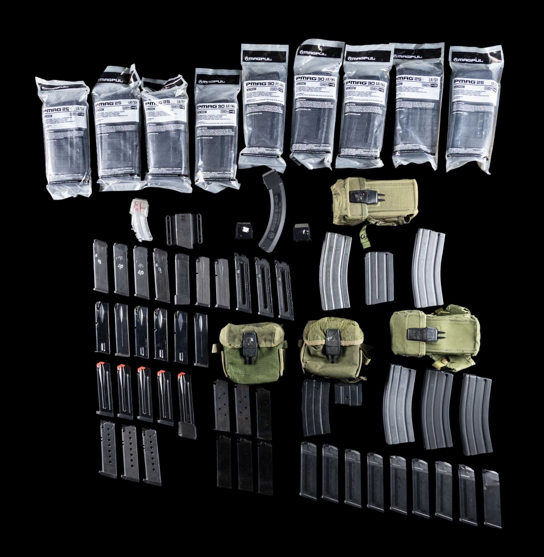 Lot of assorted rifle and pistol mags., including: 1) x4 MAGPUL PMAG AR/M4 Gen 3 30-rd. 5.56x45mm NATO black polymer mags. with viewing windows. x3 mags. sealed, x1 opened in factory packaging. 2) x5 aluminum AR-15 30-rd. mags. x1 Colt, x2 Okay Industries, and x2 Adventure line. Mags. are housed within 2 3-cell green nylon pouches. 3) x1 aluminum Colt AR-15 5-rd. mag. with matte black enamel type finish. 4) x5 MAGPUL PMAG LR/SR 25-rd. 7.62x51mm NATO black polymer mags. with viewing windows. x4 sealed, x1 opened in factory packaging. 5) x2 Ruger Mini-14 blued steel mags. x1 20-rd. and x1 5-rd. 6) x4 Ruger 10/22 mags. x2 standard factory 10-rd., x1 factory BX-25 25-rd., and x1 Butler Creek transparent synthetic 10-rd. 7) x9 Glock 21 10-rd. .45 ACP mags. 8) x2 Glock 23 14-rd. .40 S&W mags. 9) x1 non-caliber marked Glock 14-rd. 9x19mm Parabellum mag. 10) x2 ProMag Glock 16-rd. 9x19mm Parabellum mag. 11) x3 Tactical Solutions TSG-22 Glock 10-rd. mags. 12) x2 Sig Sauer P229-1 15-rd. 9x19mm Parabellum mags. 13) x3 Sig Sauer P220-1 8-rd. .45 ACP mags. 14) x6 blued steel 7-rd. 1911 mags. x2 marked with assembly # and Check-Mate Industries mfg. code, x4 unmarked. 15) x6 blued steel Taurus PT92/PT99 15-rd. mags. x1 mag. with Ramline floorplate. 16) x5 Heckler & Koch VP9/P39 mags. x4 17-rd. mags. and x1 20-rd. mag. CONDITION: mags. exhibit some scattered superficial marks from handling, storage, but all otherwise appear sturdy and serviceable. (02-25521/MLW). NON-GUN. $400-600.