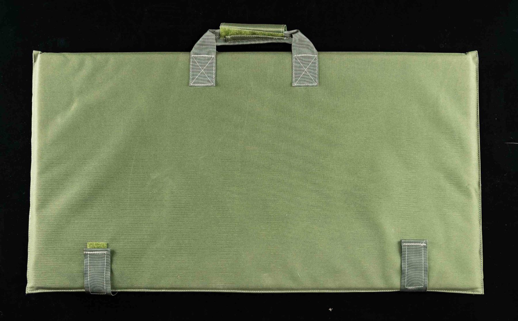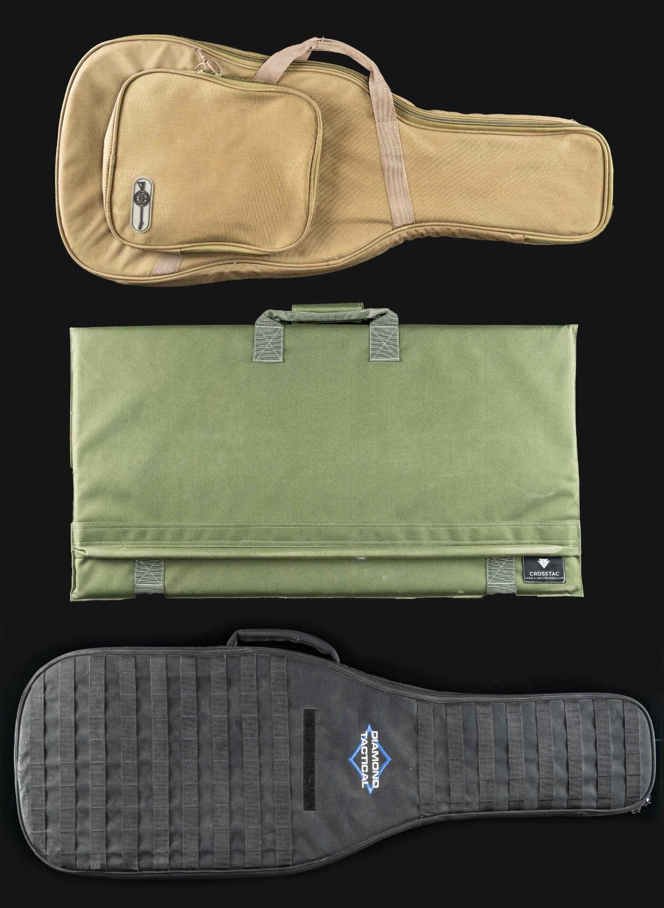 MAT. 1) Diamond Tactical TACC-1 black nylon guitar case. Padded interior with neck cradle. Exterior with molle webbing on lid. 2) LWRC discreet guitar style rifle case. Coyote nylon construction, with interior featuring padding and velcro straps. 3) Unmarked OD nylon and foam velcro foldout shooting pad. CONDUTION: items are good, with some minor exterior wear. (02-25808/MLW). NON-GUN. $300-400.