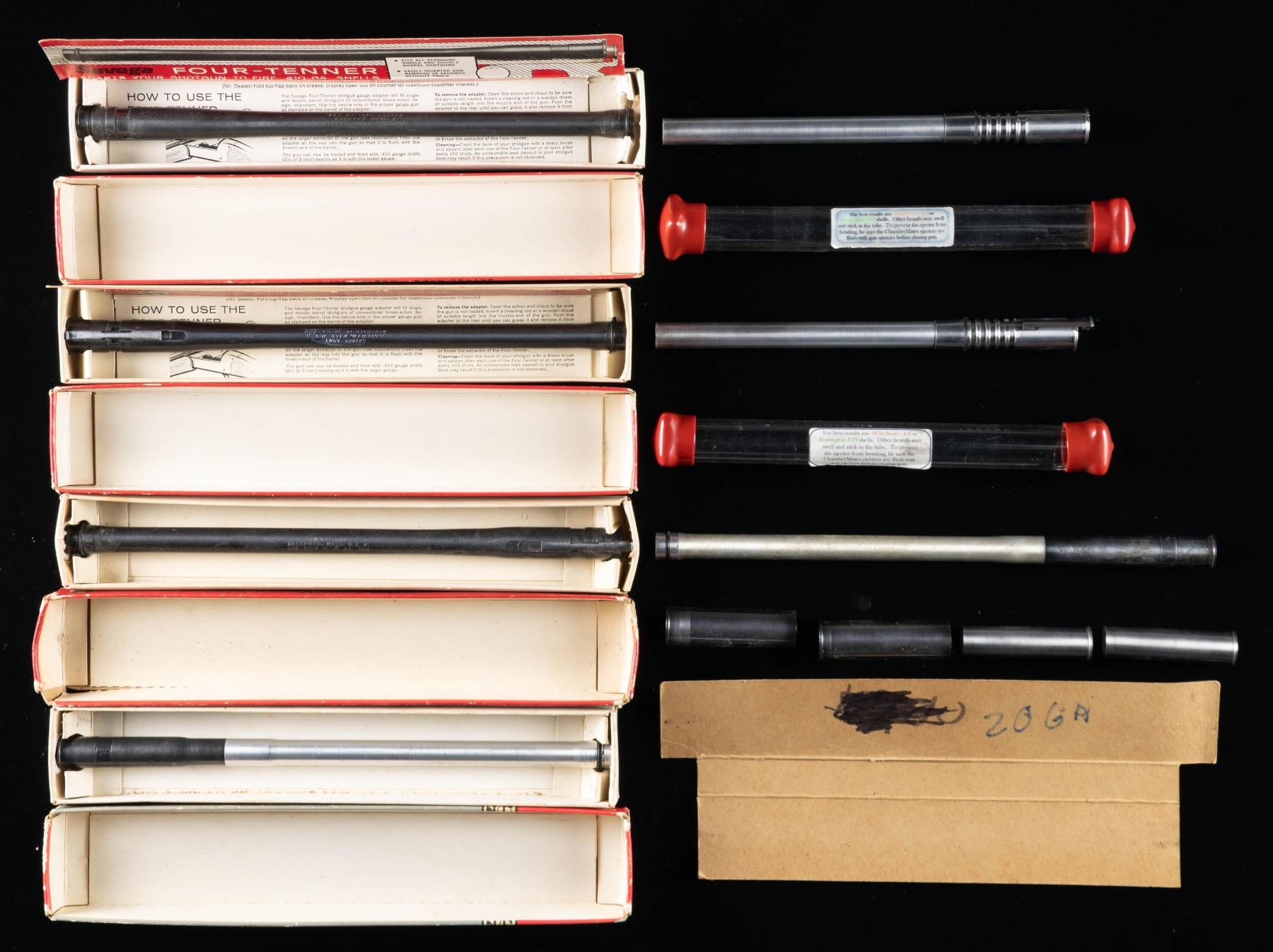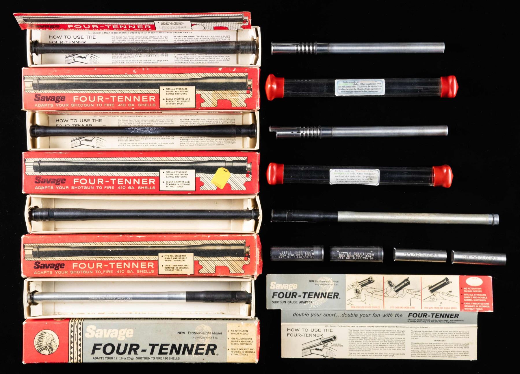 1) 3- Savage "Four-Tenners" 16 gauge to .410; in original boxes. CONDITION: very fine. 2) 2- Savage "Four-Tenners" 20 gauge to .410; 1 in original box, other with partial box. CONDITION: very fine; with some corrosion on unboxed unit. 3) High quality pair of 20 gauge to .410 chamber adapters. Unknown maker. CONDITION: lightly used. 4) Pair of "Little Skeeters" 10 gauge to 12 gauge. CONDITION: good. 5) Pair of "GAUGE MATE SILVER" 20 to 28 gauge. CONDITION: good. PROVENANCE: From the Private Collection of Berrien Moore III. (02-25878/MGM). $200-300.