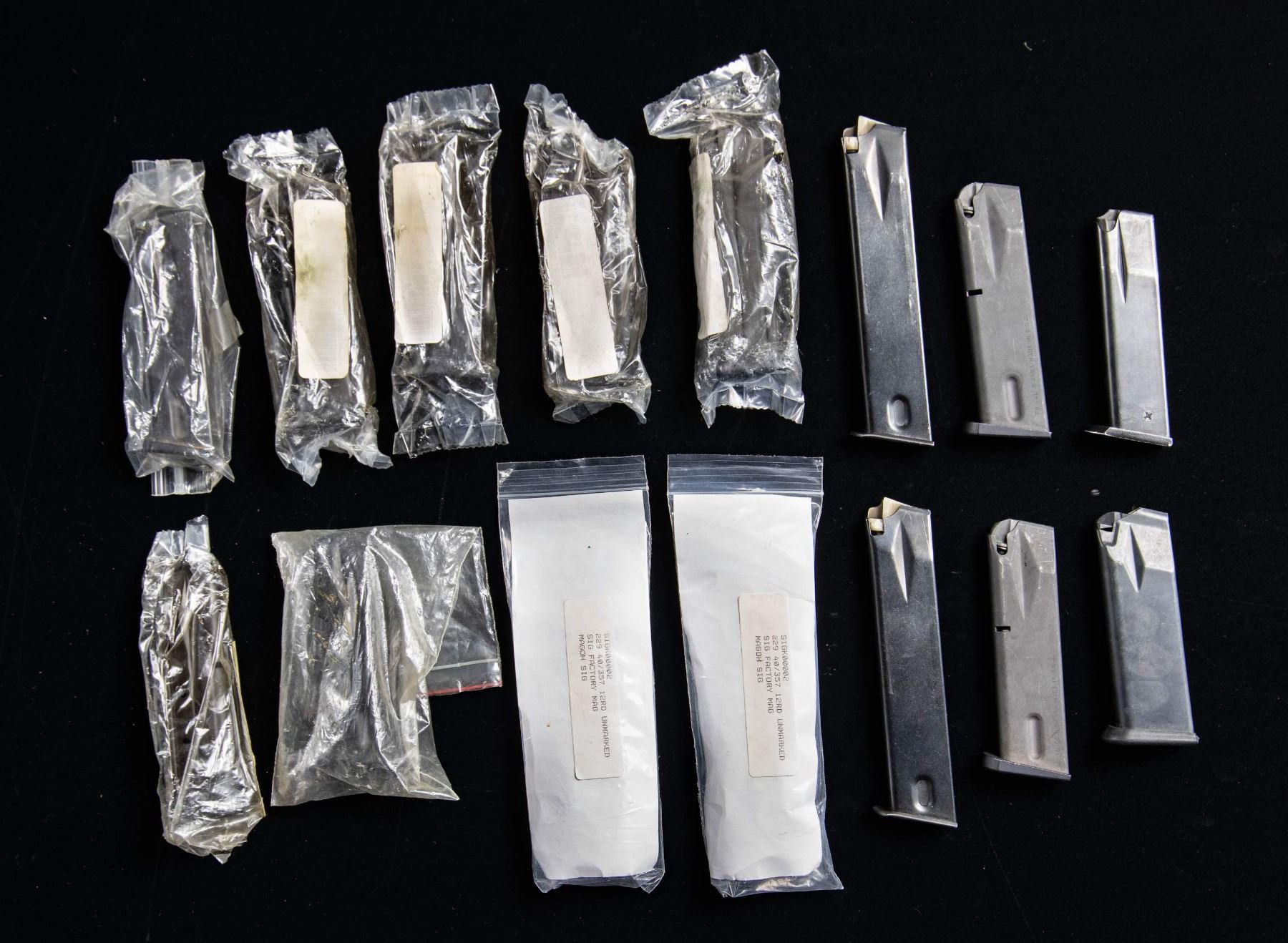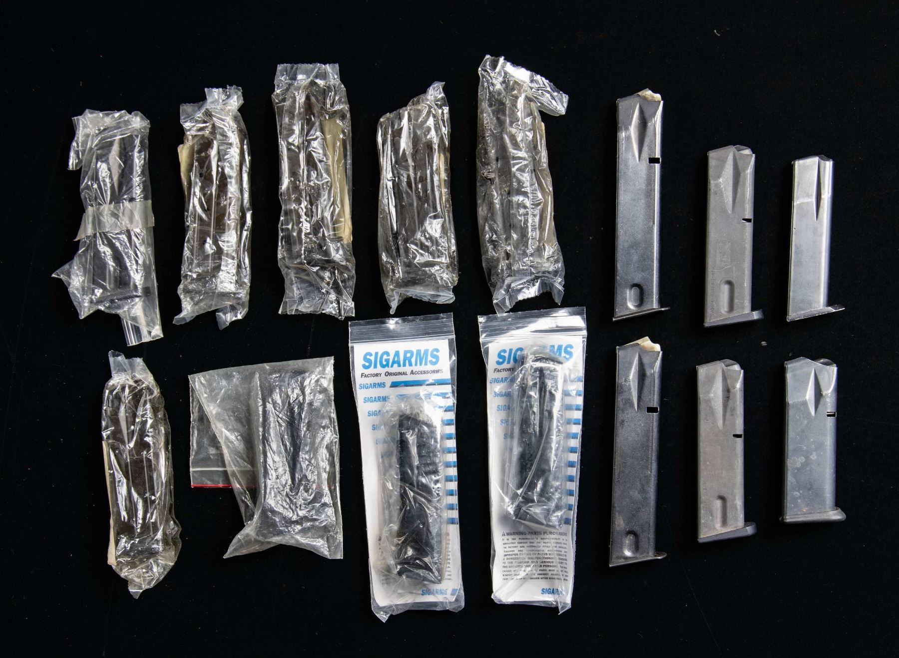 Lot of assorted pistol mags., including: 1) x5 sealed Sig Pro 15-rd. 9x19mm mags. 2) x1 Sig P228 13-rd. 9x19mm mag. 3) x2 SIG P229 23-rd. .40 S&W / .357 SIG mags. 4) x3 Beretta M9/92FS 15-rd. 9x19mm mags. 5) x1 Para Ordnance 12-rd. .45 ACP mag. 6) x3 unidentified mags. CONDITION: mags. are good to very good, exhibiting some superficial marks from handling and storage. (02-25482/MLW). NON-GUN. $100-200.