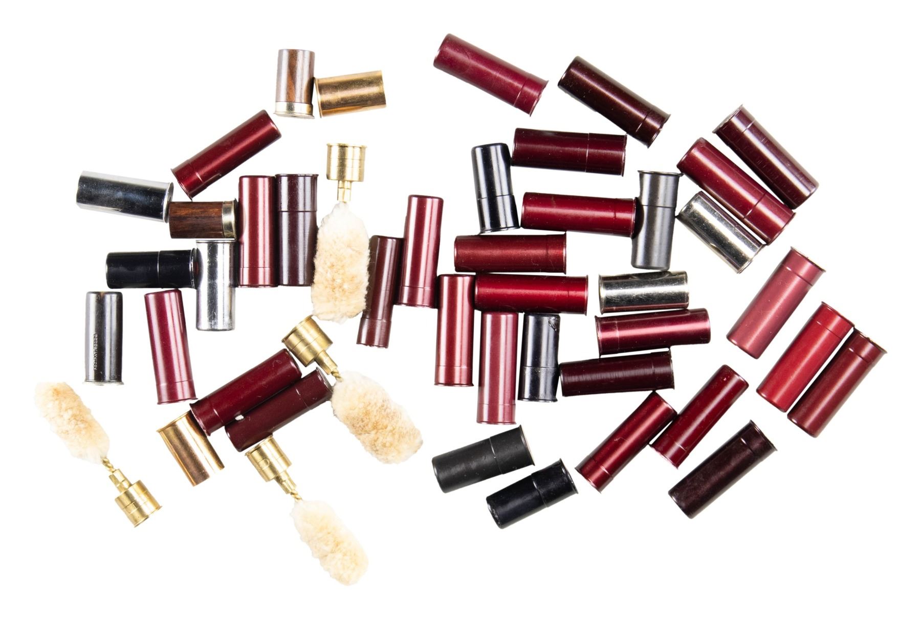 Lot of assorted shotgun snap caps, including: 1) x2 A-ZOOM 20 GA snap caps. 2) x4 A-ZOOM 16 GA snap caps. 3) x16 A-ZOOM 12 GA snap caps. 4) x4 A-ZOOM 10 GA snap caps. 5) x4 GaugeMate 12 GA snap caps. 6) x2 GuageMate 10 GA snap caps. 7) x2 Traditions 12 GA snap caps. 8) x2 CBC 12 GA snap caps. 9) x5 non-maker marked 12 GA snap caps. 10) x4 shotgun bore brushes. CONDITION: snap caps are very good overall, exhibiting some minor wear from use and some superficial handling marks. PROVENANCE: From the Private Collection of Berrien Moore III. (02-25865/MLW). NON-GUN. $20-30.