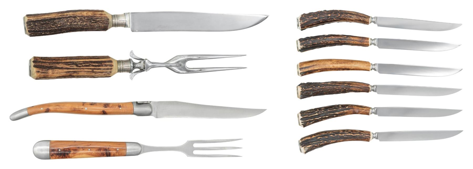 1) Laguiloe Carving Knife & Fork Set. Mfg. in France & made of stainless steel w/ juniper scales. Comes in cardboard box. CONDITION: appears near excellent.