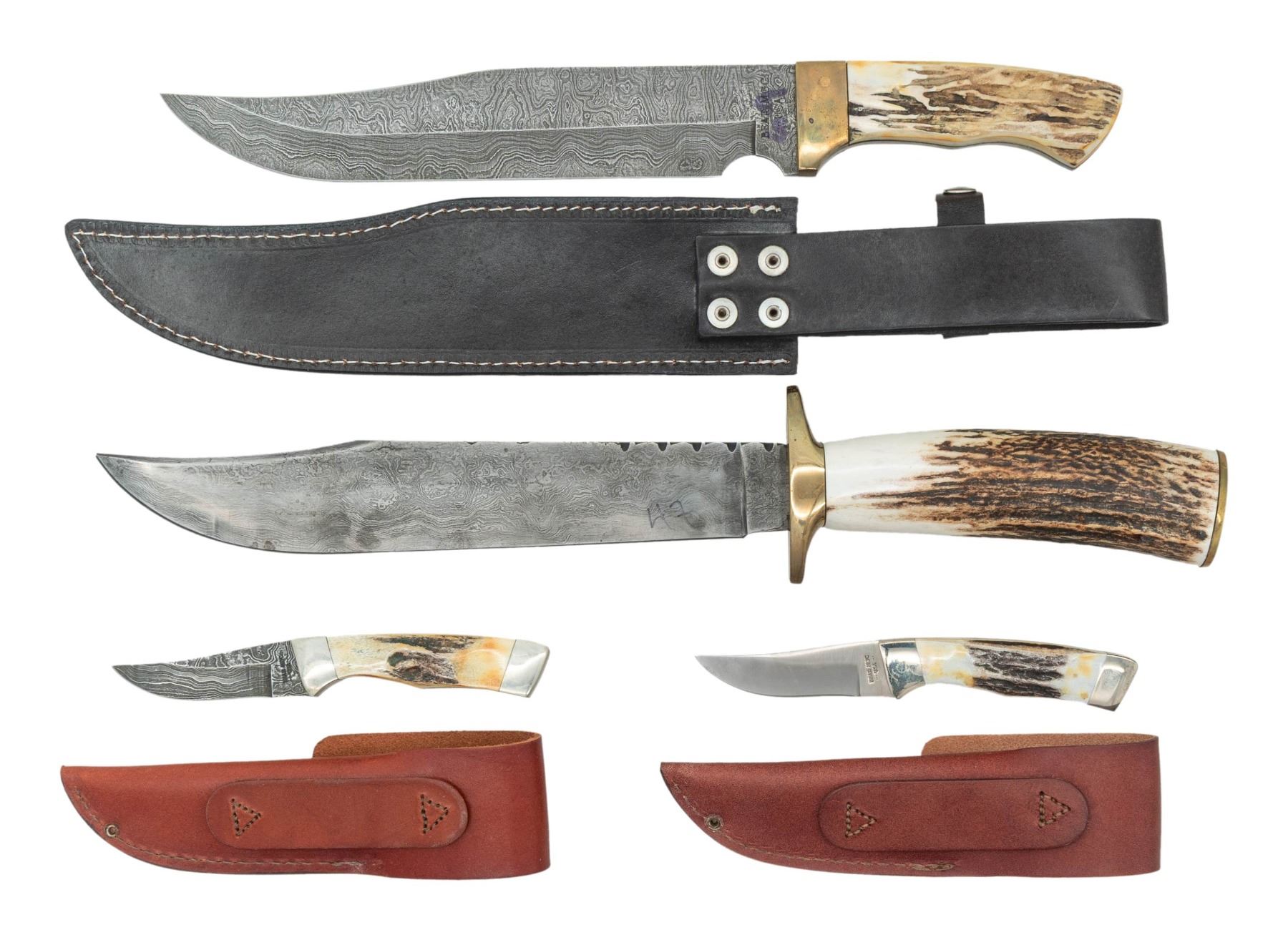 16" stag grip Damascus clip point bowie, 15" stag grip damascus clip point bowie in box, 6.5" damascus skinning knife in box, 6.5" skinning knife in box. CONDITION: 16" very good, other 3 knives fine in original boxes and sheaths. (02-25904/JS). NON-GUN. $300-400.