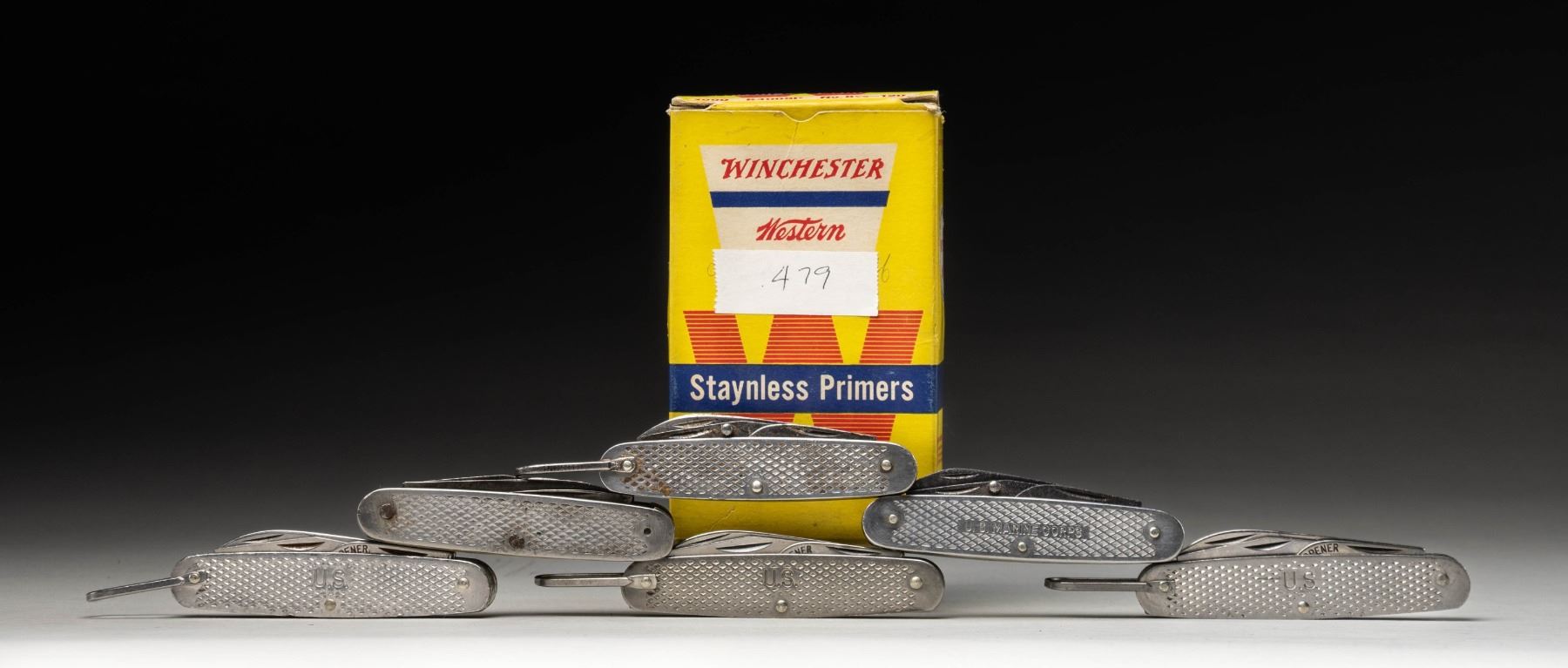 2 Unmarked having similiar style. CONDITION: The 3 US marked knives are in very good condition. The USMC marked knife is fair condition with oxidation & corrosion on blades. The 2 other knives in good condition showing patina & light pitting. PROVENANCE: Norman Olliff Estate. (02-25722/MD). NON-GUN. $50-75.