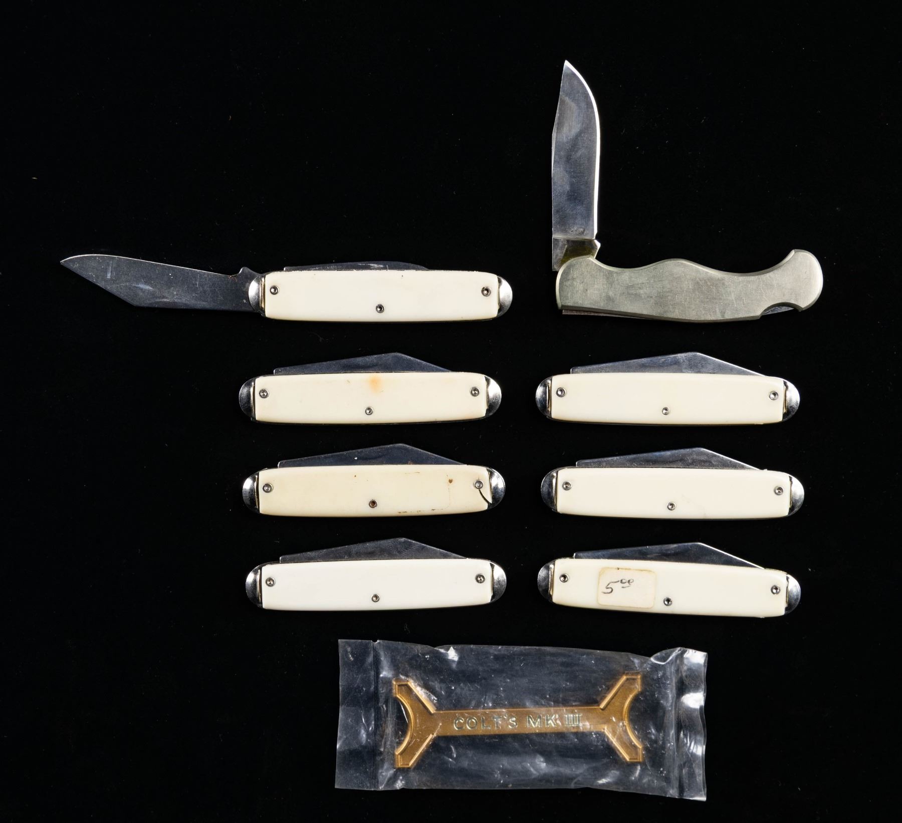 POCKET KNIVES. Lot of assorted firearms mfg. branded knives, including: 1) x6 2-blade pocket knifes. Side of primary blades are marked "U.S.A.". 2-piece smooth white synthetic grip scales, each left scale marked with brand name (x1 Smith & Wesson, x2 Marlin, x3 Savage, x1 Colt). CONDITION: knives are good, showing some scattered handling marks and spots of light surface oxidation on blades. Grip scales exhibit an aged appearance, with x1 Savage marked knife's scales having faded to a yellow patina and exhibiting a crack on either panel. 2) x1 Colt stainless steel single blade pocket knife. Left side of grip frame is marked with the stylized "COLT" logo. Left side of ricasso is marked "TAYLOR/ SURGICAL JAPAN". CONDITION: good, with some light superficial handling marks and spots of light oxidation. 3) x1 bronze colored synthetic "trigger finger exerciser". 1 side is marked "COLT'S MK III", with "TRIGGER FINGER EXERCISER" marked on the obverse. CONDITION: near new, remaining sealed in original factory plastic packaging. PROVENANCE: Norman Olliff Estate. (02-25659/MLW). NON-GUN. $25-50.