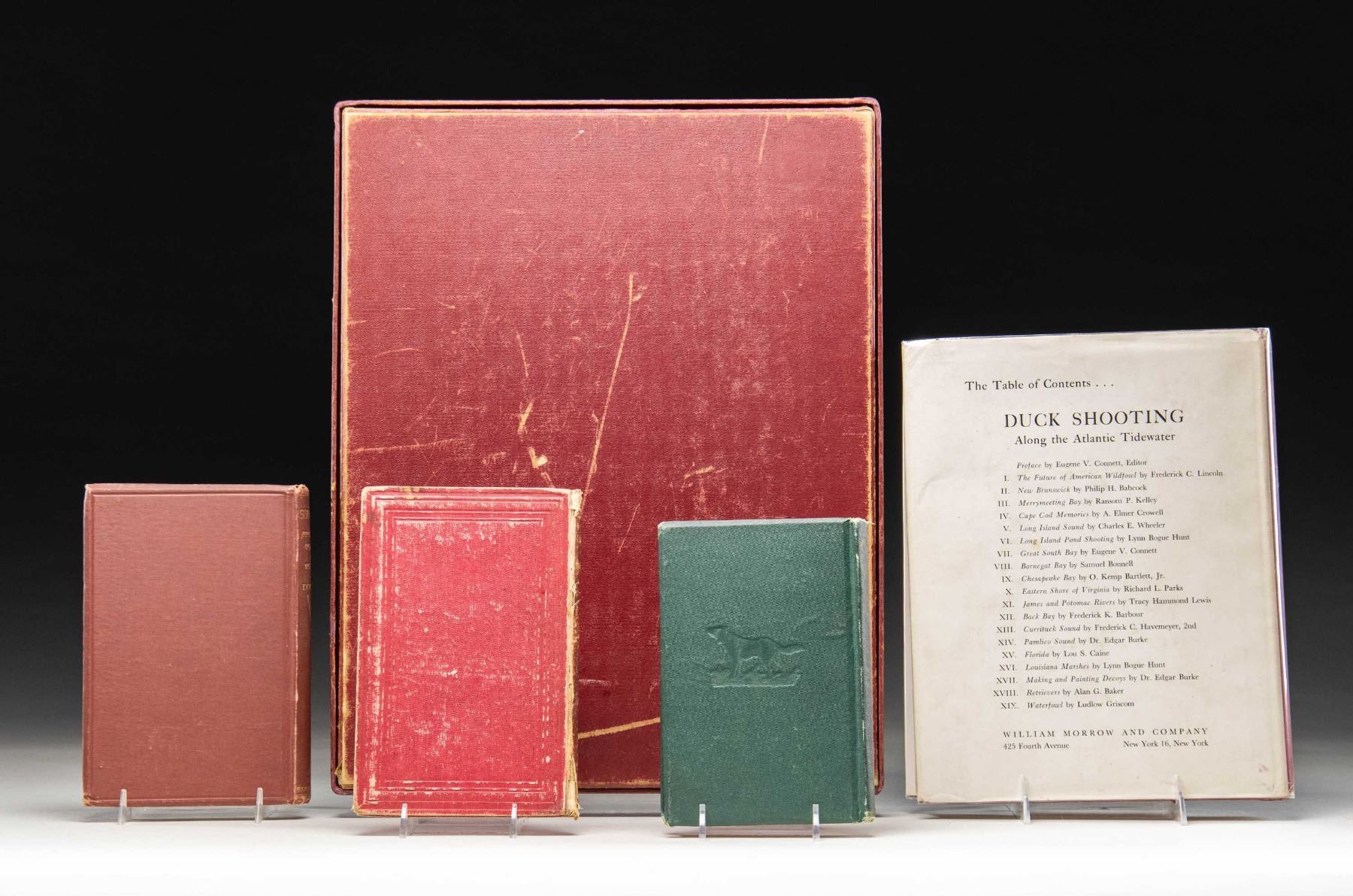 RELATED BOOKS. Lot of 5 antique sporting / hunting related books, including: 1) Duck Shooting: Along the Atlantic Tidewater", edited by Eugene V. Connett. 2) "Shooting Simplified" by J.D. Dougall. 3) "On the Wing: A Book for Sportsmen" by John Bumstead. Interior of first page of book exhibits a former owner's name above the year "1927" in pencil, with "Will J. McKee/ Indianapolis/ October 30. 1875." handwritten in ink on the following page. 4) "Shooting: Its Appliances Practice and Purpose" by James Dalzeil Dougall. 5) "Roland Clark's Etchings" by the Derrydale Press with copyright date of 1938. Book is housed within its original cardboard case with a lid label that reads "ROLAN/ CLARK'S/ ETCHINGS/ THE DERRYDALE PRESS/ Copy Number 533". Book cover is comprised of red fabric and khaki canvas. CONDITION: books are good, showing general wear with age related discoloration present on the paper and some tearing at the spines at the paper. "Shooting Simplified" shows moderate exterior wear. with a section of the front pages in "On the Wings" having disconnected from the spine. "Roland Clark's Etchings" box shows mild exterior wear and some water related staining, with a tear at one corner of the box body. The book itself is excellent, remaining in its apparent original wax paper wrapping. PROVENANCE: From the Private Collection of Berrien Moore III. (02-25877/MLW). NON-GUN. $300-500.