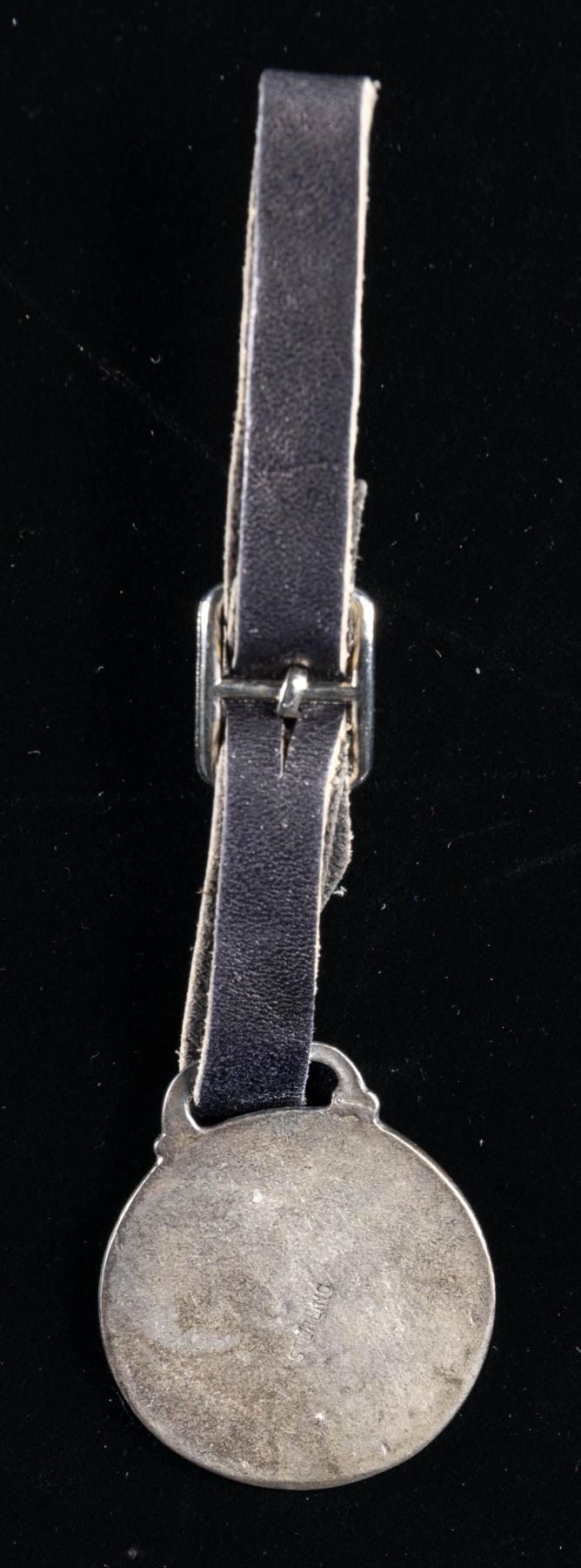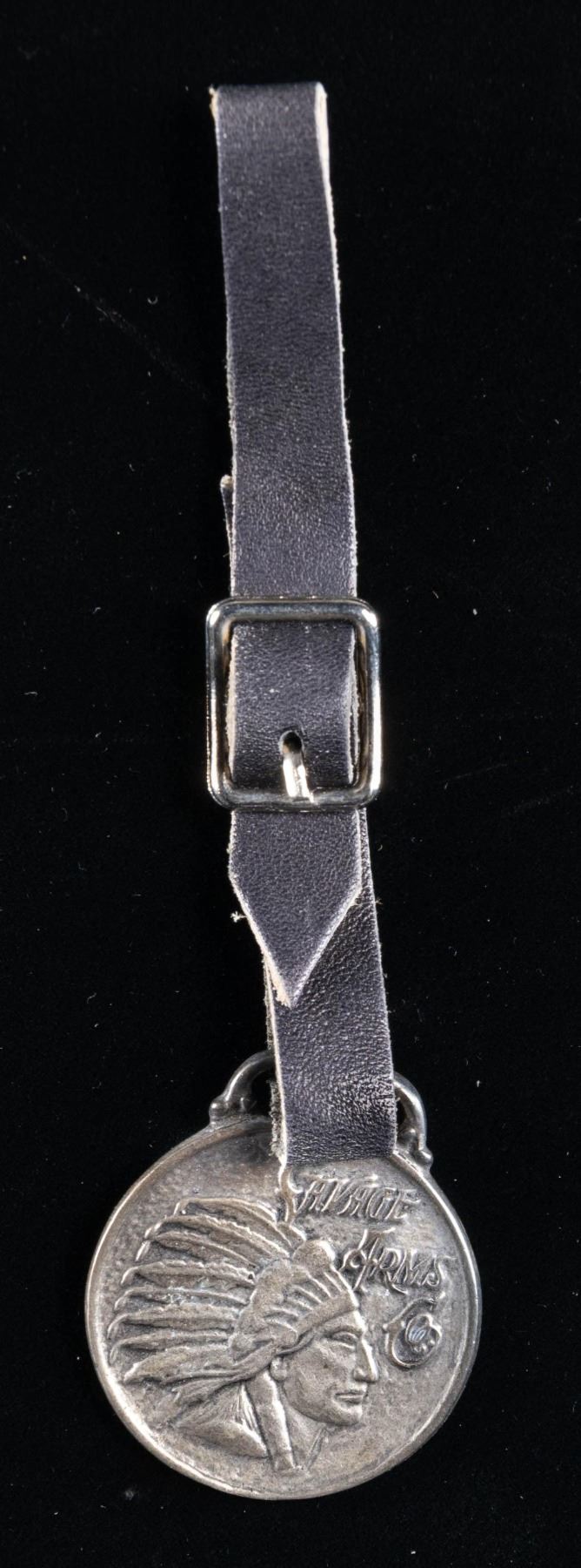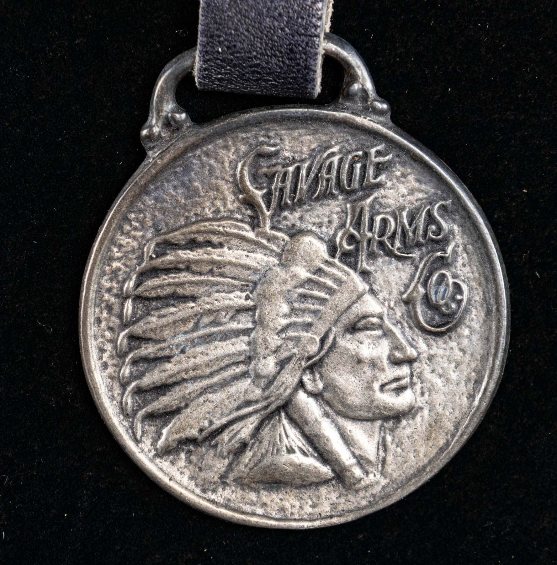 1.75" Diameter "STERLING" marked FOB has Savage Arms Co. logo on front. Comes with leather strap. CONDITION: very good overall showing patina. PROVENANCE: Norman Olliff Estate. (02-25655/MD). NON-GUN. $10-20.