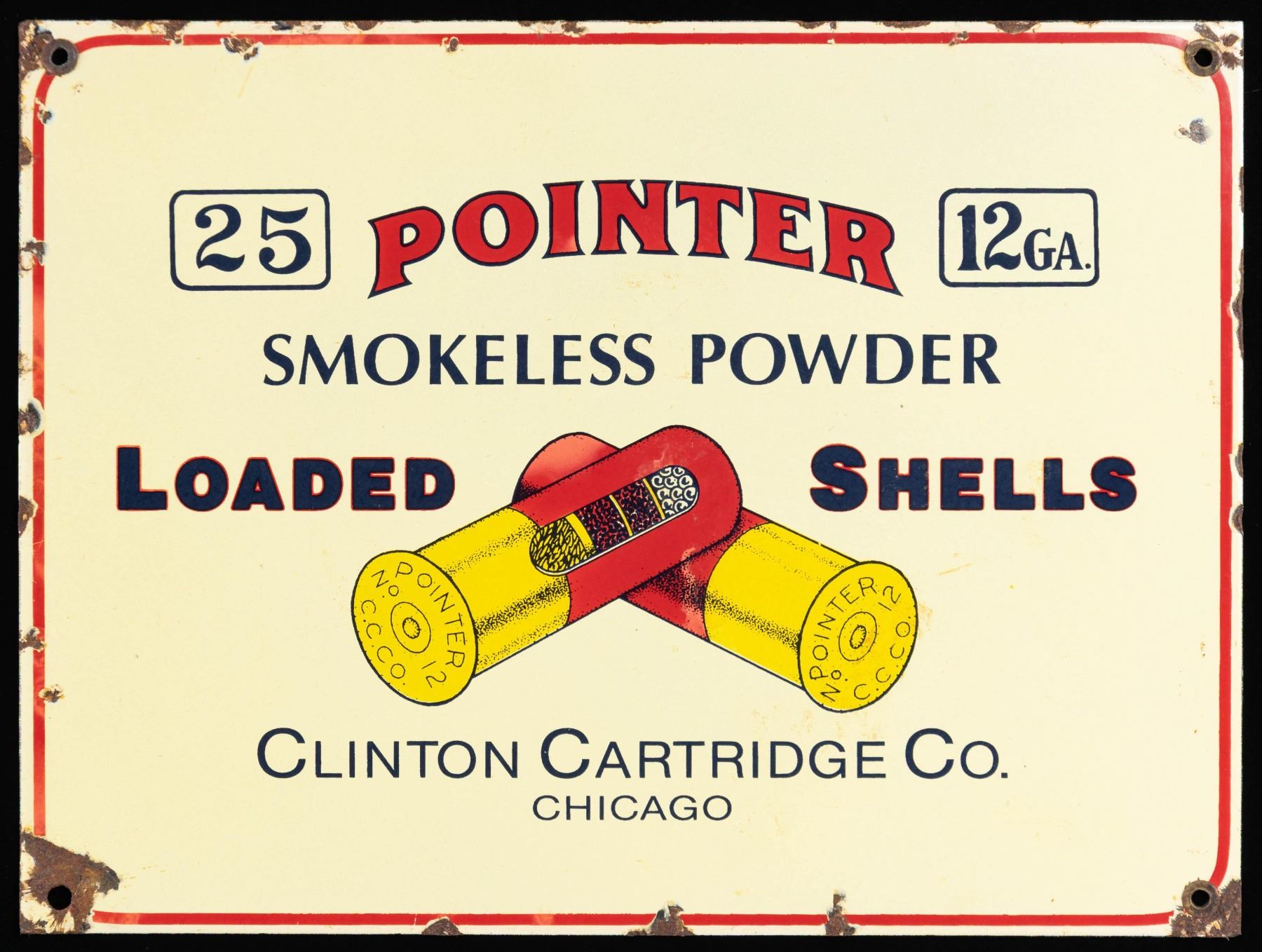 12" X 9" reprinted ad. of Clinton Cartridge Co. Pointer 12 Ga. shot shells. CONDITION: sign mostly intact & shows good colors with oxidation & marks. PROVENANCE: Norman Olliff Estate. (02-25682/MD). NON-GUN. $20-30.