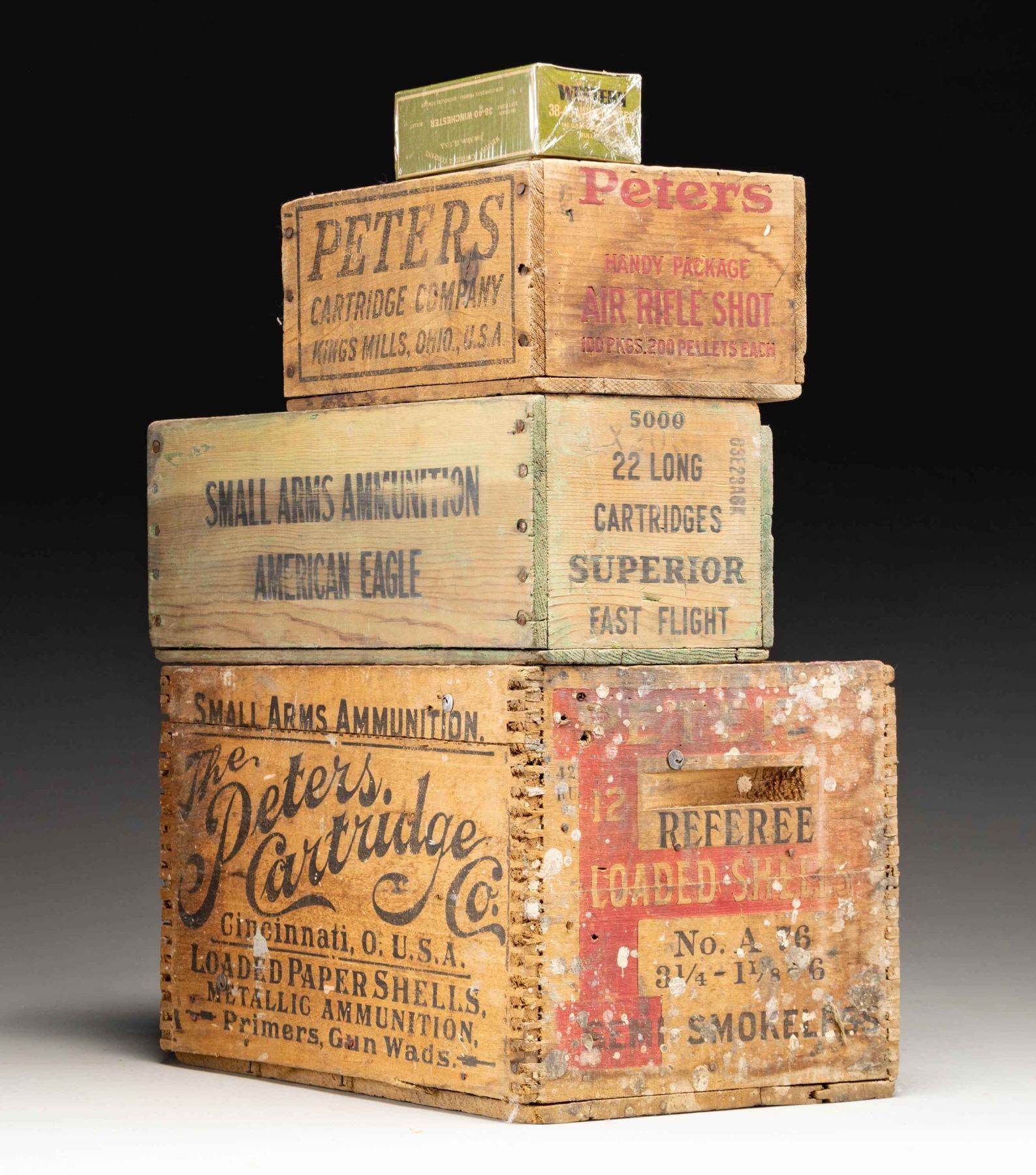4) Misprinted Western box. Box shows 38-40 on sides & top w/ 44-40 on bottom. Box wrapped in cellophane. CONDITION: box in good condition showing fading colors. PROVENANCE: Norman Olliff Estate. (02-25708/MD). NON-GUN. $50-150.