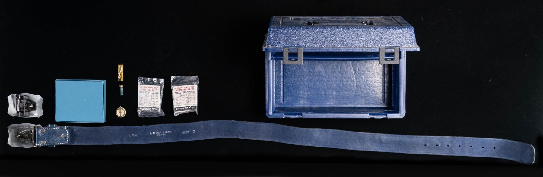 MEMORABILIA. Lot consists of: 1) Blue synthetic Peters ammunition box. 2) Peters belt buckle adorn with a brass mallard above a banner that reads "FINE AMMUNITION SINCE 1887" and "PETERS". Rear is marked "PETERS CARTRIDGE DIVISION/ Copyright Remington Arms Company, Inc., 1975". Complete with original blue leatherette wrapped box. 3) Blue leather belt with identical buckle as referenced in item #2. Belt features light floral and foliate scroll tooling along the exterior, with "ML 38-40", "HAND TOOLED & STAINED/ STEERHIDE", and "9892 43" marked on the interior in silver characters. 4) x2 Remington Dupont / Peters 5mm Remington Rim Fire Magnum clasps. Clasps remain sealed in their original plastic packaging, with factory cards detailing 38 grain Power-Lokt Hollow Point ammunition specifications. 5) Peters shotgun shell cuff link. Green synthetic hull with brass base marked "REMINGTON" above "12" and "GA" above "PETERS". 6) Peters shotgun shell clasp. Blue transparent hull with polished brass base marked "PETERS" on side. 7) Peters advertising button pin. Disc shaped button marked "SHOOT" above a shotgun shell and "PETERS/ SHELLS". Rear markings indicate Bastian Bros. mfg. CONDITION: items remain good to very good overall, with some exhibiting age related discoloration overall. (02-25650/MLW). NON-GUN. $50-100.