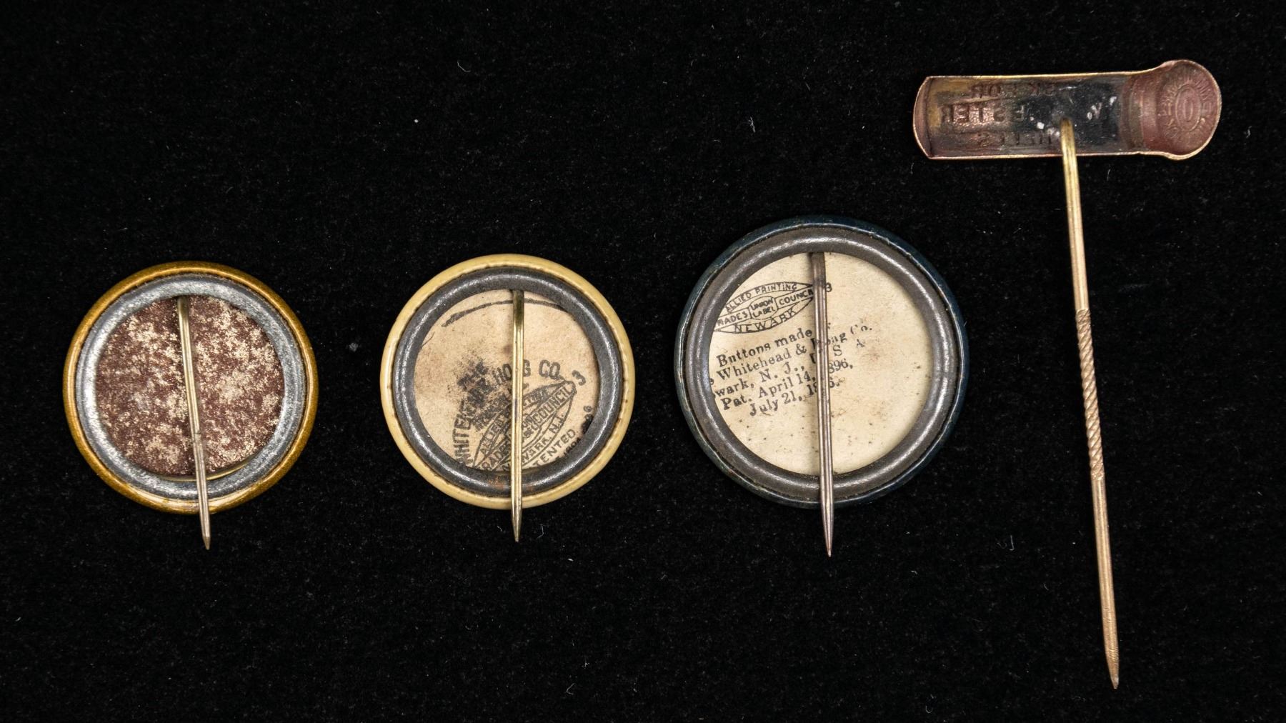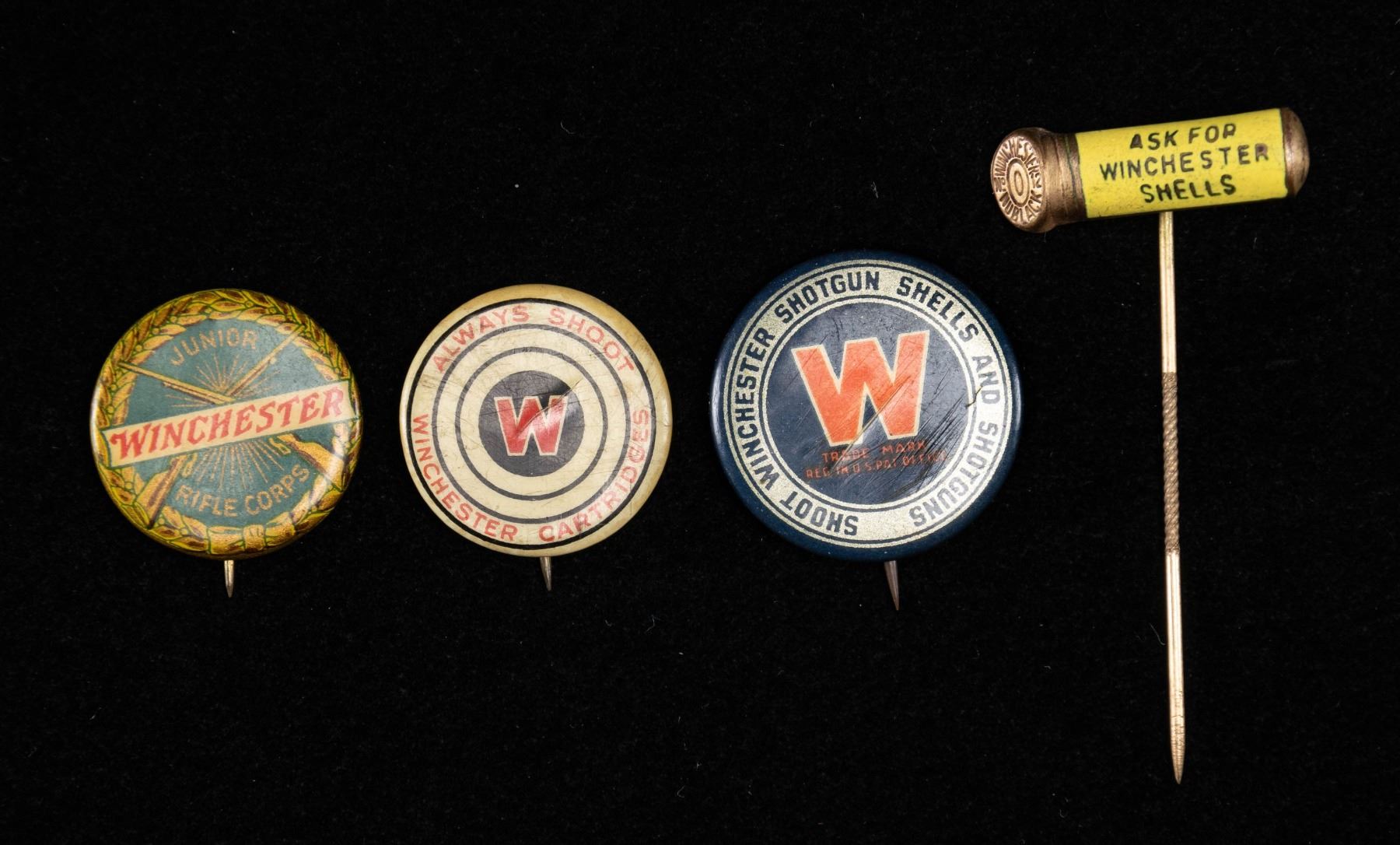 Lot of 4 Winchester advertising pins, including: 1) Shotgun shell shaped Winchester advertising pin. Brass construction with yellow hull marked "ASK FOR/ WINCHESTER/ SHELLS". Base of rim is marked "WINCHESTER/ NO. 12/ NUBLACK". 2) Disc shaped Winchester advertising pin. Pin is painted blue, with "SHOOT WINCHESTER SHOTGUN SHELLS AND SHOTGUNS" in a silver band around the exterior, with a red Winchester "W" marked at the center. 3) Disc shaped Winchester advertising button. Pin is painted white, featuring concentric black rings, with "ALWAYS SHOOT" and "WINCHESTER CARTRIDGES" marked in the outer ring. Center is marked with a red Winchester "W". 4) Disc shaped Winchester Junior Rifle Corps pin. Pin is painted blue, featuring a gold wreath around the circumference, with 2 gold crossed rifles beneath the Winchester trademark logo marked at the center, "JUNIOR" marked at the top, and "RIFLES CORPS" marked at the bottom. CONDITION: pins show age related discoloration and some superficial handling marks, but otherwise remain sound. PROVENANCE: Norman Olliff Estate. (02-25662/MLW). NON-GUN. $50-100.
