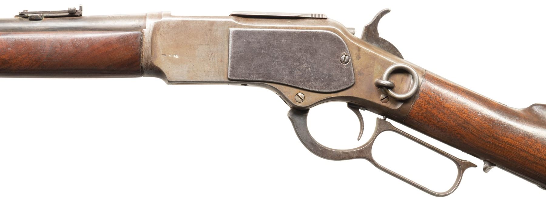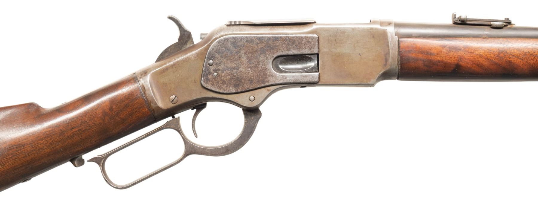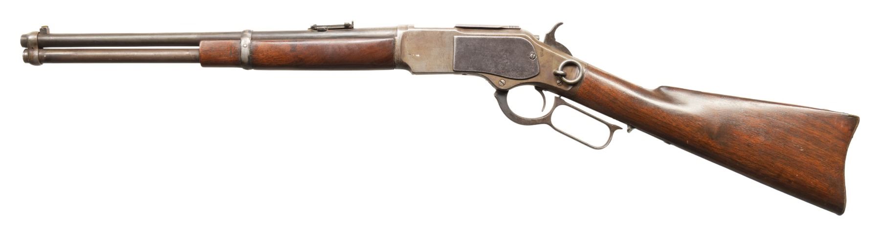 CARBINE IN "TRAPPER" CONFIGURATION. Cal. 44 WCF. S# 293389B. Bbl. 16 3/16". Model 1873 lever action rifle mfg. by Winchester in 1889. Top of the rnd. bbl. is marked with a (apparent) later added Winchester 2-line address, with a later added "44 W.C.F." marked on the left towards the breech. Upper receiver tang is marked "MODEL 1873". Sanded and refinished single band fastened plain wood forearm and straight grip buttstock with carbine buttplate. Brass blade front sight with dovetailed carbine ladder rear sight graduated 0-20. Left side of the receiver is fitted with a saddle ring and staple. Bbl. has been shortened and bored out to .44 W.C.F. Bolt face has been shaved down to accommodate caliber conversion. CONDITION: metal components have largely faded to gray, exhibiting traces of apparent reapplied bluing remaining in some areas, areas of light surface oxidation and pitting, as well as scattered handling marks overall. Mirror bore, exhibiting an area of light oxidation towards the muzzle, while retaining sharp albeit shallow rifling throughout. Wood furniture shows some scattered marks and impressions from handling and storage, but otherwise remains sturdy and serviceable. (01-28202/MLW). ANTIQUE. $700-1,000.