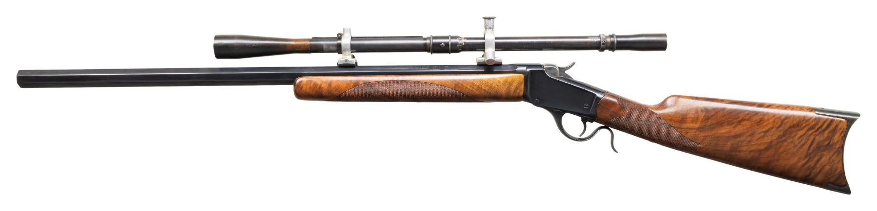BLOCK RIFLE. Cal. 256 Win. Mag. S# 3593. Bbl. 26" by McGowen measuring .95" full length except for flare at receiver. Mfg. 1886 with flat mainspring action; matching assembly numbers on tangs. Highly figured stock set with curved borderless fine checkering of the highest order; polished and blued crescent buttplate plus glass bedded forend. The caliber is based on a 357 Mag. case necked to .257" and factory loaded with 60 grain hollow point bullets; notably offered in Marlin Model 62 rifle, Ruger Hawkeye pistol and Universal Ferret carbine. Fitted with Fecker crosshair reticle target scope of about 10 power (unmarked) with serial number 8948; Fecker target rings at proper 7.2" spacing and no recoil spring. Metal surfaces are highly polished with breech block and hammer in the white. CONDITION: exterior of scope shows its age with brown patina, some peppery oxidation and finish loss. Optics are clear with a hint of wave in the horizontal crosswire to the right of center. Buttplate has prior pitting evident under its bluing. Locking lugs of action have grey patina spots visible only with action open. Balance of condition is near excellent with a simply spectacular stock set having two very small dents on left side of buttstock along with an extremely small old chip at top right front. (01-29026/NW). ANTIQUE. $800-1,200.
