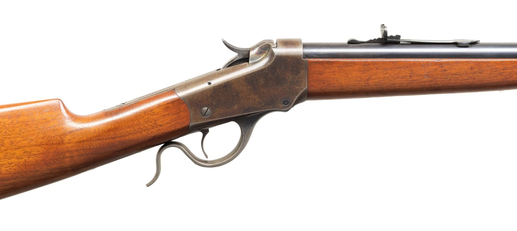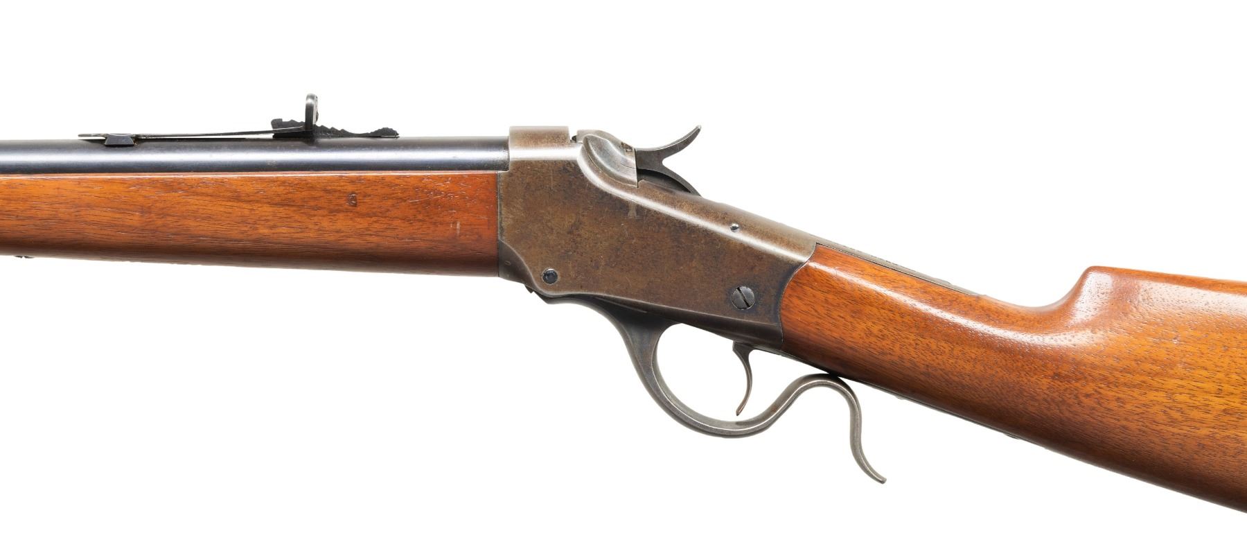 BREECHLOADING RIFLE. Cal. 25-25 S. S# 114710. Bbl. 30". Model 1885 Low Wall single shot breechloading rifle mfg. by Winchester in 1919. Top of the rnd. bbl. is marked with Winchester's 2-line mfg. and patent information, with the cal. designation "25-25.S." marked towards the breech. Underside of bbl. is marked with the cal. designation and a triad of factory proofs, with "NEW" stamped within the dovetail. Upper receiver tang is marked with the Winchester trademark logo. Metal components exhibit a blue finish overall, save for on the case colored breechblock and lever. Lightly sanded and refinished ebony inlaid schnabel tip forearm and straight grip buttstock with crescent steel buttplate. Dovetailed blade front sight with dovetailed semi-buckhorn V-notch rear sight. CONDITION: receiver retains fair amounts of its original factory blue finish, exhibiting wear and thinning overall that is fading to brown patina, with scattered superficial handling marks and spots of light surface oxidation. Bbl. retains the majority of its original blue finish, save for a large area of wear and thinning fading to gray patina, exhibiting light to mild pitting and patches of dark discoloration. Breechblock and lever retain traces of their original case colored finish. Brilliant mirror bore, exhibiting a few small scattered spots of light pitting, while retaining well defined rifling throughout. Proper manual mechanics. Wood furniture shows some some superficial marks and minor impressions from handling and storage, but otherwise remains sound. PROVENANCE: Estate of Groves Herrick. (25-5666/MLW). CURIO. $600-900.