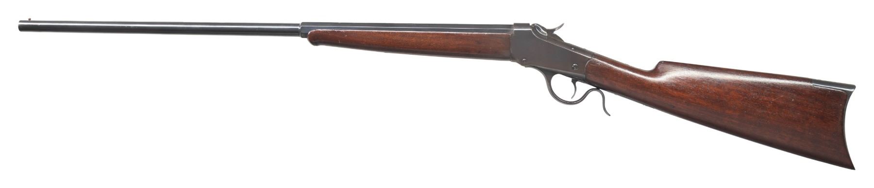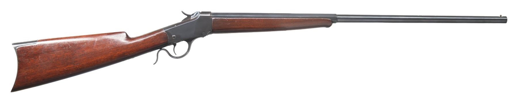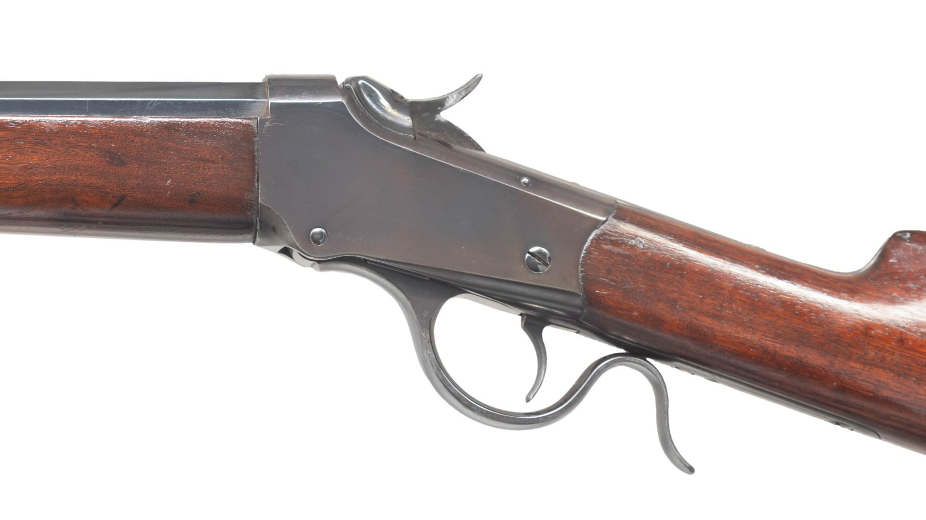 BREECHLOADING SHOTGUN. Cal. 410. S# 47722. Bbl. 25 3/8". Originally mfg. as a Model 1885 Low Wall single shot rifle chambered in .25 R.F., this example was later converted to fire .410 GA ammunition. The top of the half octagonal bbl. is marked with Winchester's mfg. information, with "55" and "25 R.F." marked towards the breech. Metal components exhibit a high polish reapplied blue finish overall. Plain wood schnabel tip / ebony tipped forearm with straight grip stock featuring a plain steel buttplate. Wood furniture has been lightly sanded and revarnished at one time. Front sight dovetail has been fitted with a brass bead sight. Rear sight dovetail has been filled with a blank, which features a brass band across the center. CONDITION: metal components retain the vast majority of their reapplied blue finish, exhibiting some scattered spots of light to mild pitting beneath the finish. Bright bore, exhibiting a dark streak of machining marks. Proper manual mechanics. Wood furniture shows scattered marks and minor impressions from handling and storage, with small minor cracks present on the buttstock that stem from the receiver tangs. (01-26696/MLW). ANTIQUE. $400-600.