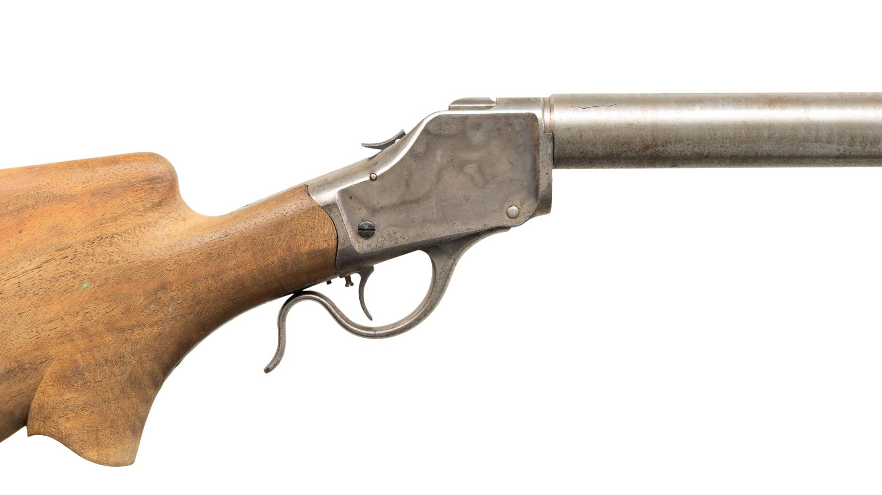 RIFLE. Cal. 38-55 WCF. S# 75841. Bbl. 30 1/16". Model 1885 High Wall single shot rifle originally mfg. by Winchester in 1896. Custom heavy rnd. bull bbl. is devoid of any identifying markings. Lower receiver tang is marked with Winchester's patent information, followed by the S#. Custom unfinished perch belly pistol grip buttstock with large right hand cheekpiece and finely checkered steel buttplate. Forearm is absent. Top of the bbl. is drilled and tapped with 4 screw holes for scope block attachment. Upper receiver tang is drilled and tapped with a plug screw, likely for a previously mounted tang sight attachment, with an additional screw present on the lower receiver tang. Receiver features an adj. trigger and a contemporary coil spring. CONDITION: receiver and lever retain scant traces of their apparent original factory case colored finish, with the balancing having fading to gray patina, exhibiting scattered spots / patches of light surface oxidation and age related discoloration. Receiver exhibits a couple of patches of surface level grind marks on the tangs. Bbl. exhibits consistent light surface oxidation and discoloration overall, with some scattered scratches. Mirror bore, retaining well defined rifling throughout. Proper manual mechanics. Stock is very good, as unfinished, showing some discoloration around the upper edges at the buttplate. Buttplate exhibits scattered patches of light to mild surface oxidation, with the balance of oxidation present towards the peak. A high quality customized Model 1885 High Wall that will make for an attractive rifle once properly finished! (01-29023/MLW). ANTIQUE. $200-300.