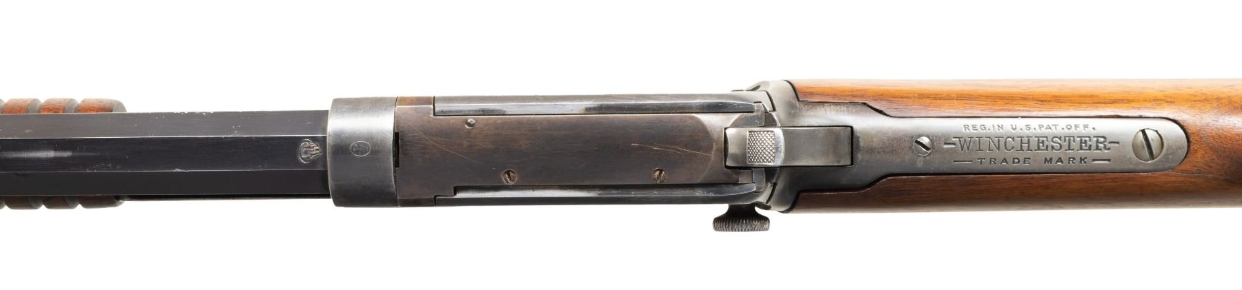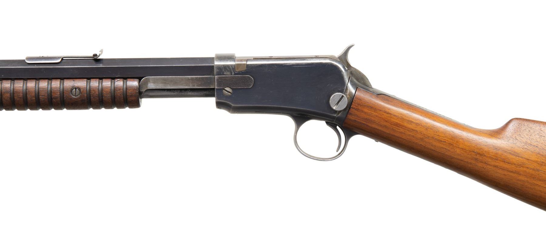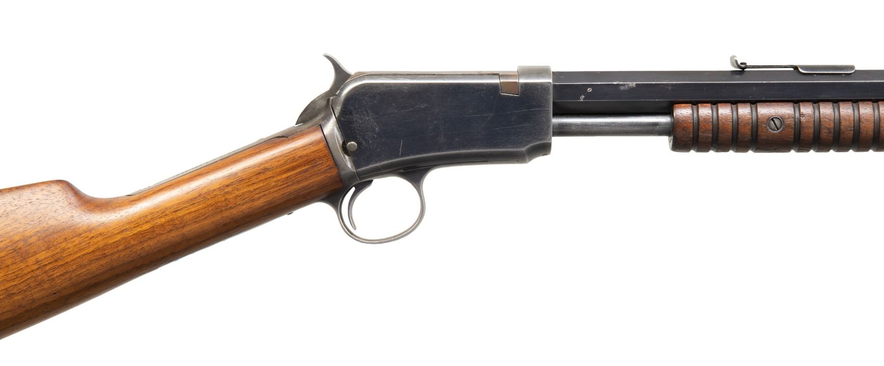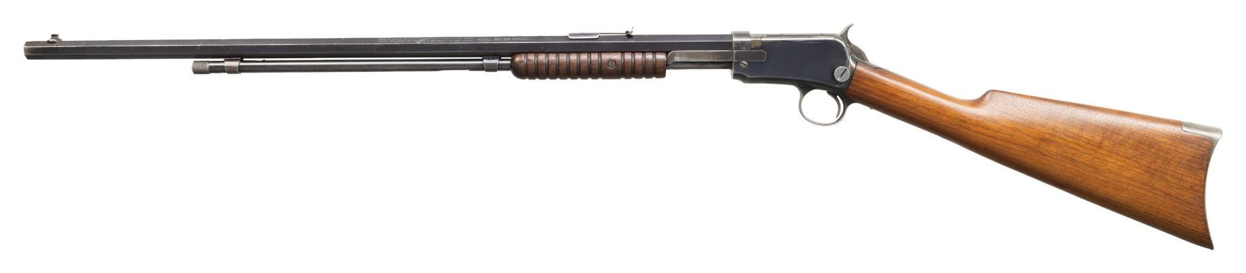 Cal. 22 Short. S# 421557A. Mfg. approx. 1910. Replacement oct. 24" bbl. w/ blade front & replacement rear sight. Takedown action. Grooved walnut forearm. Replacement walnut stock w/ original crescent buttplate; stock has large caps to top tang. CONDITION: Good blue finish with dents, marks & carrying wear. Good appearing wood finish with handling marks. Very good rifling. PROVENANCE: Estate Collection of John "Jack" Dhooghe. (25-5556/MD). CURIO. $300-500.