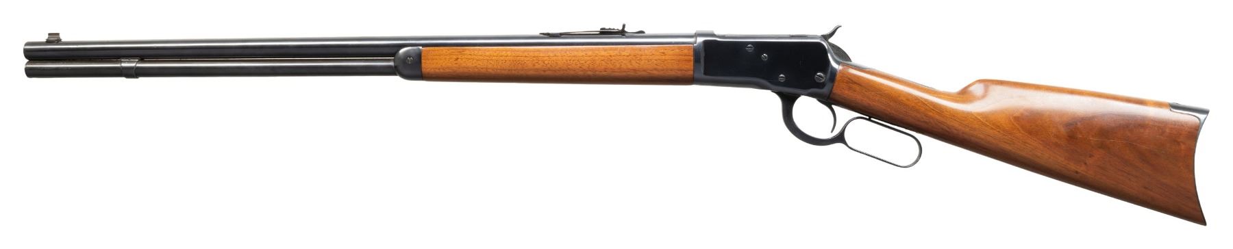 Cal. 38 WCF. S# 108213. 24 1/4". Model 1892 lever action rifle mfg. by Winchester in 1896. Top of the rnd. bbl. is marked with Winchester's 2-line address, with the cal. designation marked towards the breech. Upper receiver tang is marked "MODEL 1892/ -WINCHESTER-" above patent information. Metal components exhibit a reapplied blue finish overall. Lightly sanded and refinished plain wood forearm and straight grip buttstock with crescent steel buttplate. Contemporary aftermarket dovetailed brass beaded blade front sight with dovetailed V-notch rear sight. CONDITION: metal components retain virtually all of their reapplied blue finish, exhibiting some scratches and handling marks, with scattered spots of light to mild pitting present beneath the bluing. Forward area of mag. tube (ahead of band) exhibits scattered spots of light surface oxidation. Dark pitted bore, retaining fair to good rifling throughout. Proper manual mechanics. Wood furniture shows scattered superficial marks and a few minor impressions from handling and storage, but otherwise remains sound. (01-28186/MLW). ANTIQUE. $500-700.