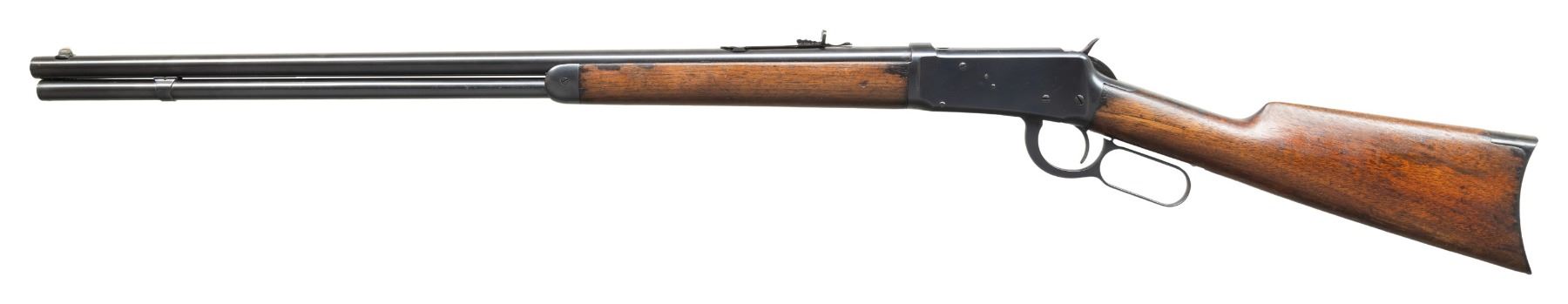 Cal. 38-55. S# 368846. Bbl. 26". Model 1894 lever action rifle mfg. by Winchester in 1906. Top of the rnd. bbl. is marked with Winchester's 2-line mfg. and patent information, with the cal. designation marked towards the breech. Metal components exhibit a professionally reapplied blue finish overall. Plain wood forearm and straight grip buttstock with crescent steel buttplate. Dovetailed German silver blade front sight with dovetailed semi-buckhorn V-notch rear sight. CONDITION: metal components retain the vast majority of their reapplied blue finish, exhibiting areas of light pitting and some scattered spots / patches of mild pitting beneath the bluing. Most edges remain sharp, with factory markings remaining largely intact. Bore exhibits consistent mild pitting, as well as scattered spots and patches of moderate pitting, while retaining good, albeit worn rifling throughout. Proper manual mechanics. Wood furniture shows scattered marks and impressions from handling and storage, with scattered patches of darker discoloration. Buttstock exhibits a 3/8" gouge along the toeline, a chip on the wrist along the upper receiver tang, as well as some scattered spots of finish loss, but otherwise remains sound. (25-6780/MLW). CURIO. $700-1,000.