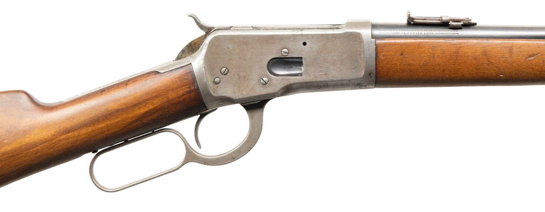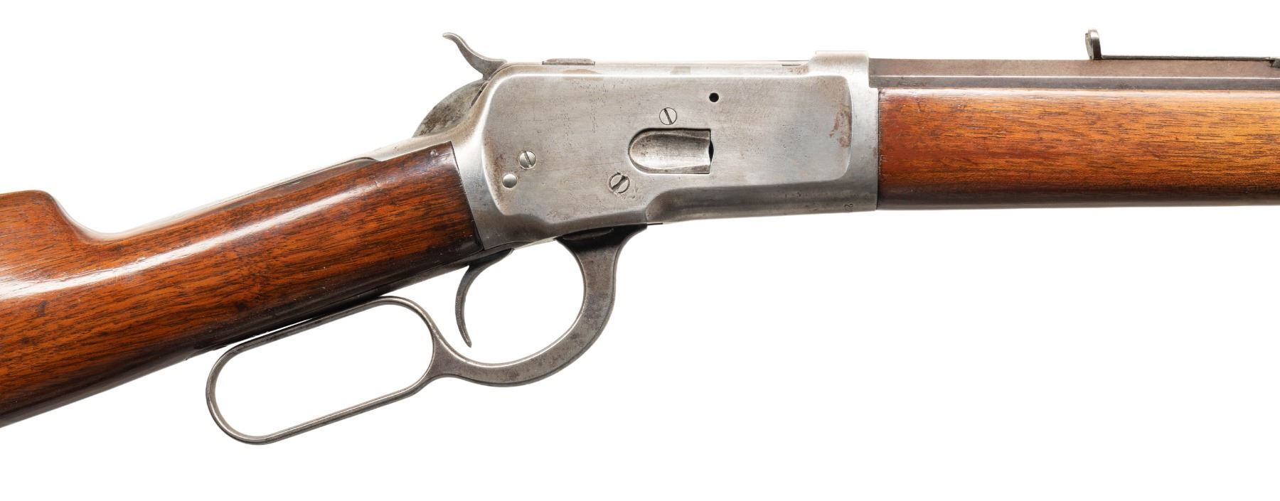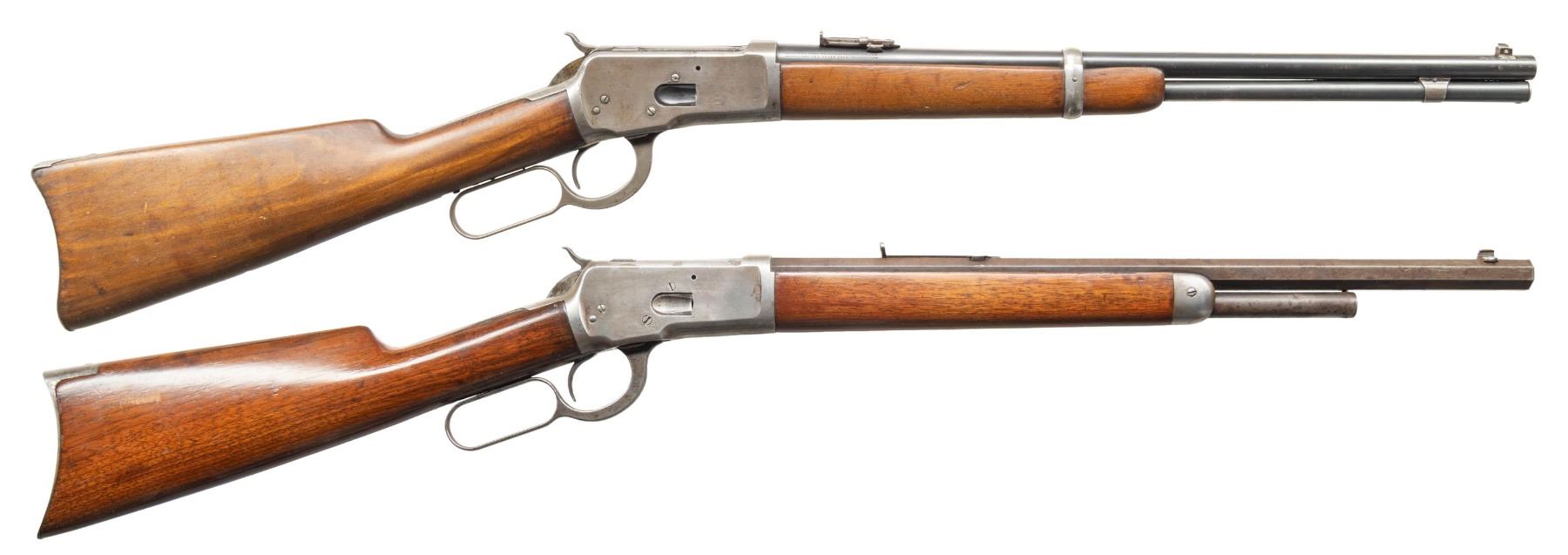 RIFLES. 1) WINCHESTER MODEL 92 LEVER ACTION SADDLE RING CARBINE. Cal. 25-20. S# 577592. Bbl. 18 1/2". Model 92 lever action saddle ring carbine mfg. by Winchester in 1910. Left side of the bbl. exhibits standard factory markings denoting the model and cal. designations, with Winchester's mfg. information marked on the right. Bbl. and mag. tube exhibit a blue finish overall. Sanded and refinished plain wood single band fastened forearm and straight grip stock with carbine buttplate. Ground blade front sight (base brazed into dovetail) and dovetail carbine ladder rear sight. Left side of receiver features a saddle ring staple and ring. CONDITION: receiver, lever, bbl. band, mag. tube band, and buttplate have been cleaned at one time, having faded to a mottled gray patina with scattered spots of light surface oxidation and pitting overall. Bbl. retains the majority of its original factory blue finish, showing some light wear and thinning fading to gray patina, as well as some scattered superficial handling marks and spots of light surface oxidation. Mag. tube shows streaks of wear fading to gray patina and scattered handling marks. Mirror bore, exhibiting some scattered spots of light pitting towards the muzzle, while retaining strong rifling throughout. Proper manual mechanics. Wood furniture shows scattered marks and impressions from handling and storage, but otherwise remains sound. (25-5341/MLW). 2) WINCHESTER MODEL 1892 LEVER ACTION RIFLE. Cal. 38 WCF. S# 286205. Bbl. 18 5/8". Model 1892 lever action rifle mfg. by Winchester in 1905. Top flat of the octagonal bbl. is marked with Winchester's 2-line mfg. and patent information, with the cal. designation marked towards the breech. Sanded and refinish plain wood forearm and straight grip buttstock with crescent steel buttplate. Aftermarket dovetailed blade front sight (bead absent) and dovetailed U-notch rear sight (elevation slide absent). Bbl. and mag. tube have been shortened, with the factory mag. tube band's dovetail having been filled in. Left side of the receiver exhibits an added hole. CONDITION: receiver has been heavily cleaned at one time, exhibiting a gray patina with cleaning striations and scattered spots/patches of light surface oxidation and pitting present overall. Remaining metal components have faded to a dark gray patina, exhibiting scattered spots and patches of dark oxidation. Bore exhibits scattered patches of dark mild to moderate pitting, while retaining fair to good rifling throughout. Proper manual mechanics. Wood furniture shows scattered marks and impressions from handling and storage, but otherwise remains sound. (25-5497/MLW). BOTH CURIO. $900-1,400.
