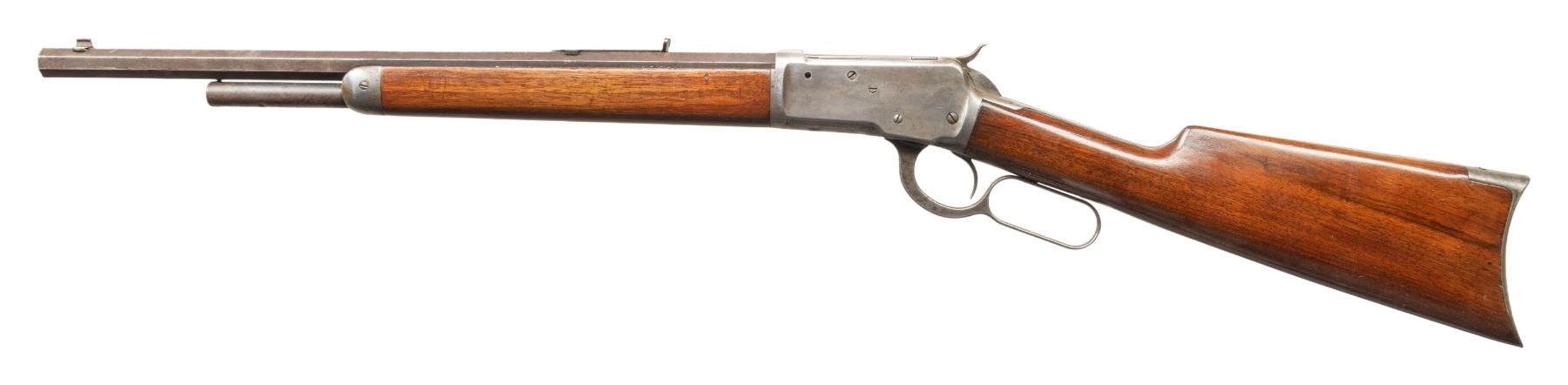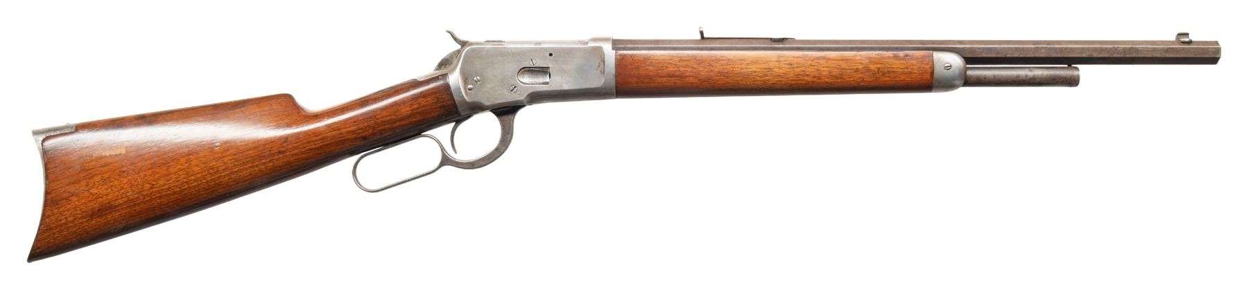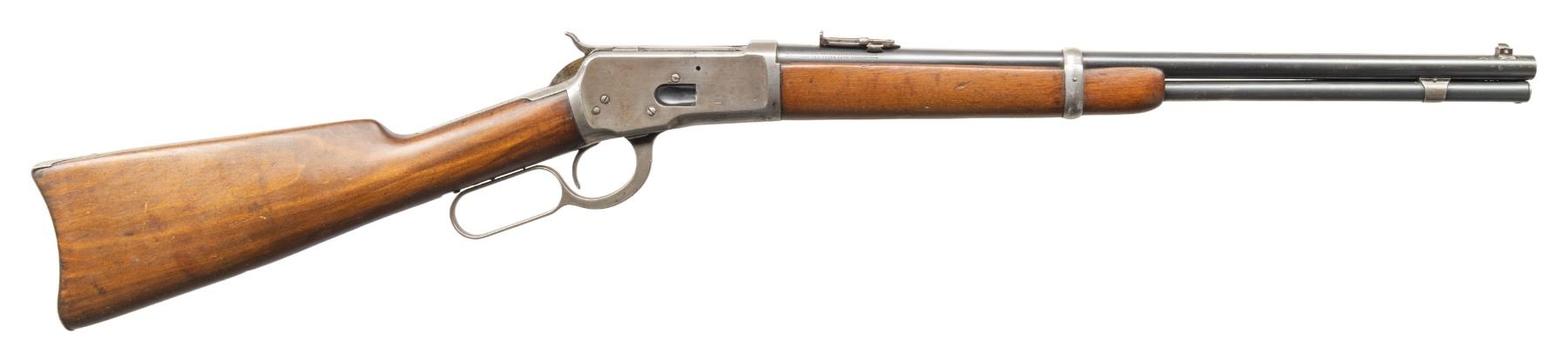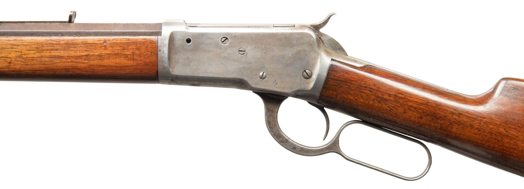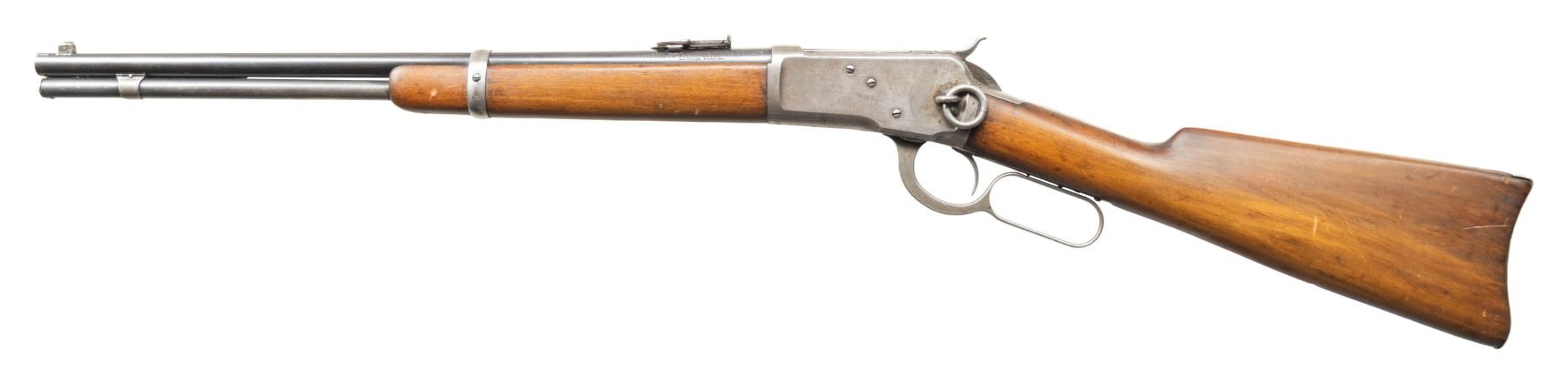 RIFLES. 1) WINCHESTER MODEL 92 LEVER ACTION SADDLE RING CARBINE. Cal. 25-20. S# 577592. Bbl. 18 1/2". Model 92 lever action saddle ring carbine mfg. by Winchester in 1910. Left side of the bbl. exhibits standard factory markings denoting the model and cal. designations, with Winchester's mfg. information marked on the right. Bbl. and mag. tube exhibit a blue finish overall. Sanded and refinished plain wood single band fastened forearm and straight grip stock with carbine buttplate. Ground blade front sight (base brazed into dovetail) and dovetail carbine ladder rear sight. Left side of receiver features a saddle ring staple and ring. CONDITION: receiver, lever, bbl. band, mag. tube band, and buttplate have been cleaned at one time, having faded to a mottled gray patina with scattered spots of light surface oxidation and pitting overall. Bbl. retains the majority of its original factory blue finish, showing some light wear and thinning fading to gray patina, as well as some scattered superficial handling marks and spots of light surface oxidation. Mag. tube shows streaks of wear fading to gray patina and scattered handling marks. Mirror bore, exhibiting some scattered spots of light pitting towards the muzzle, while retaining strong rifling throughout. Proper manual mechanics. Wood furniture shows scattered marks and impressions from handling and storage, but otherwise remains sound. (25-5341/MLW). 2) WINCHESTER MODEL 1892 LEVER ACTION RIFLE. Cal. 38 WCF. S# 286205. Bbl. 18 5/8". Model 1892 lever action rifle mfg. by Winchester in 1905. Top flat of the octagonal bbl. is marked with Winchester's 2-line mfg. and patent information, with the cal. designation marked towards the breech. Sanded and refinish plain wood forearm and straight grip buttstock with crescent steel buttplate. Aftermarket dovetailed blade front sight (bead absent) and dovetailed U-notch rear sight (elevation slide absent). Bbl. and mag. tube have been shortened, with the factory mag. tube band's dovetail having been filled in. Left side of the receiver exhibits an added hole. CONDITION: receiver has been heavily cleaned at one time, exhibiting a gray patina with cleaning striations and scattered spots/patches of light surface oxidation and pitting present overall. Remaining metal components have faded to a dark gray patina, exhibiting scattered spots and patches of dark oxidation. Bore exhibits scattered patches of dark mild to moderate pitting, while retaining fair to good rifling throughout. Proper manual mechanics. Wood furniture shows scattered marks and impressions from handling and storage, but otherwise remains sound. (25-5497/MLW). BOTH CURIO. $900-1,400.