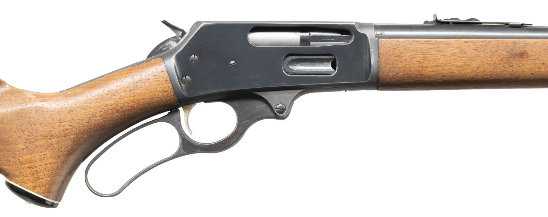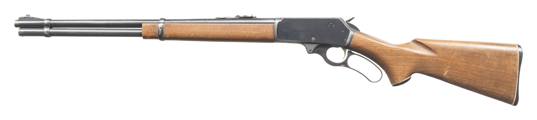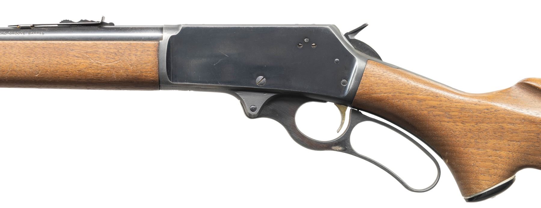 Cal. 30-30. S# T1088. Micro-groove 18" bbl. w/ sporting sights; replacement front sight. D&T pre-crossbolt safety action w/ gold washed trigger. Walnut stock set. CONDITION: good worn blue with scratches, 1 large dent right side action & muzzle wear. Fair worn wood finish with large gouge left side buttstock & numerous marks on forearm. Very good rifling with light residue. (25-6721/MD). CURIO. $400-600.