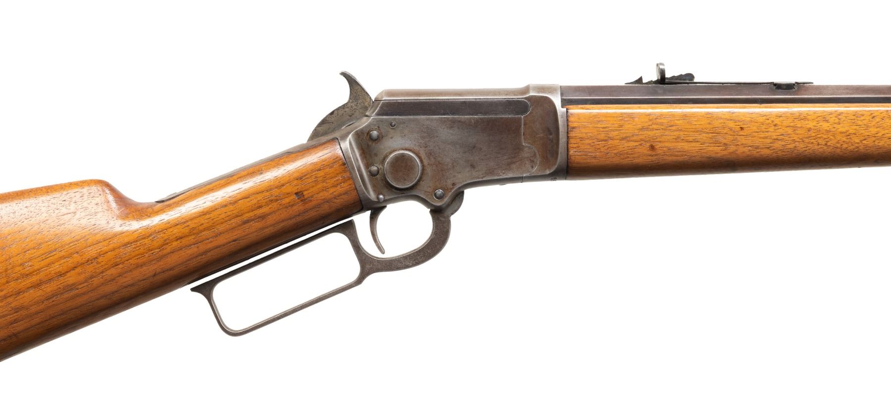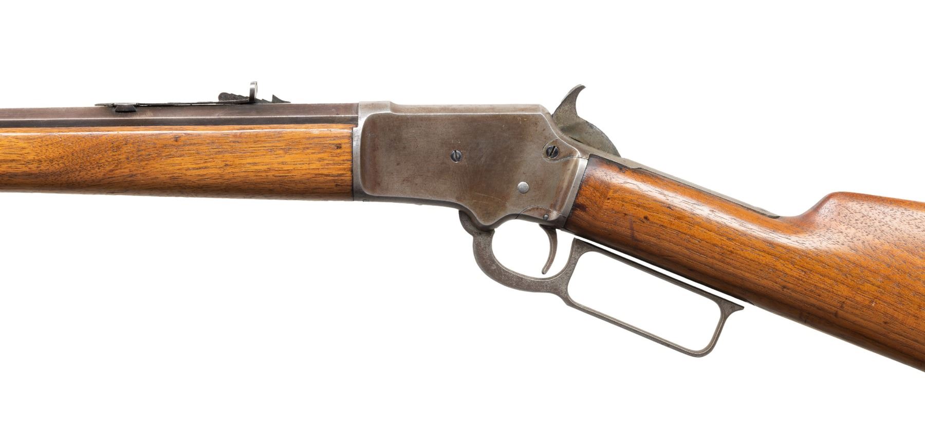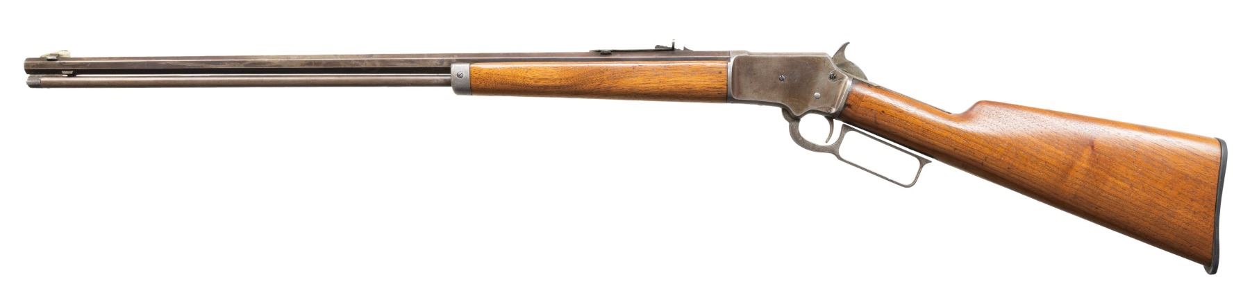 Cal. 22 S, L, LR. S# 262211 (mfg. 1902). Oct. 24". German silver blade front sight & elevator rear sight. Tubular mag. Round top receiver marked "MARLIN SAFETY". Walnut stock set w/ replacement oversized buttplate. CONDITION: metal has gray/brown patina with faint traces of blue & case colors showing spots of pitting & peppery oxidation. Sanded & refinished wood with light handling marks. Shiny rifling with fouling on lands. (25-5348/MD). CURIO. $500-750.