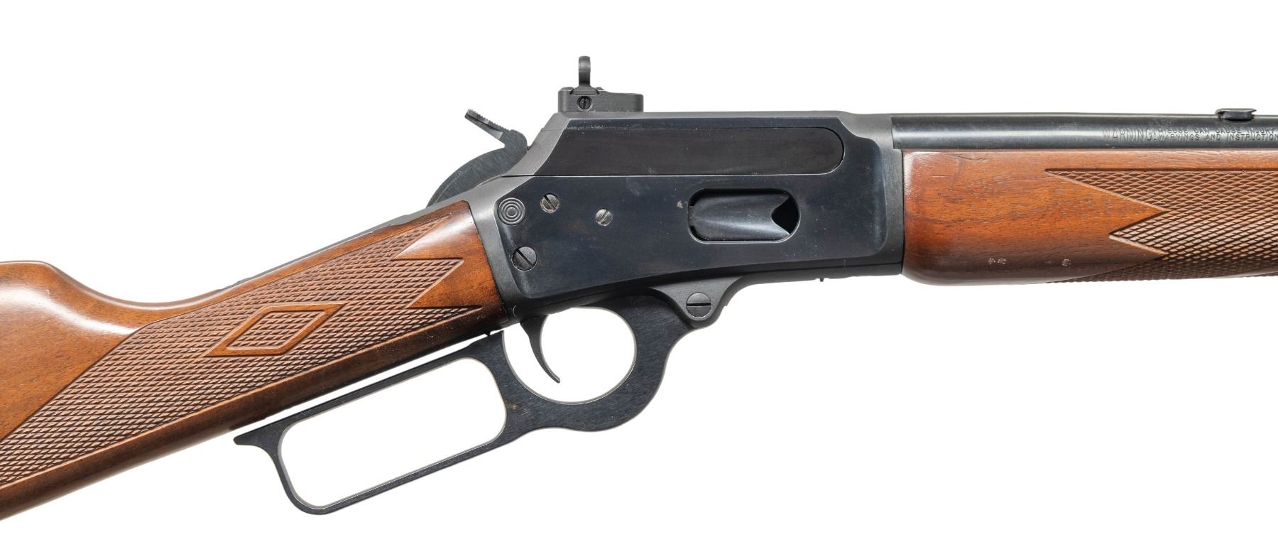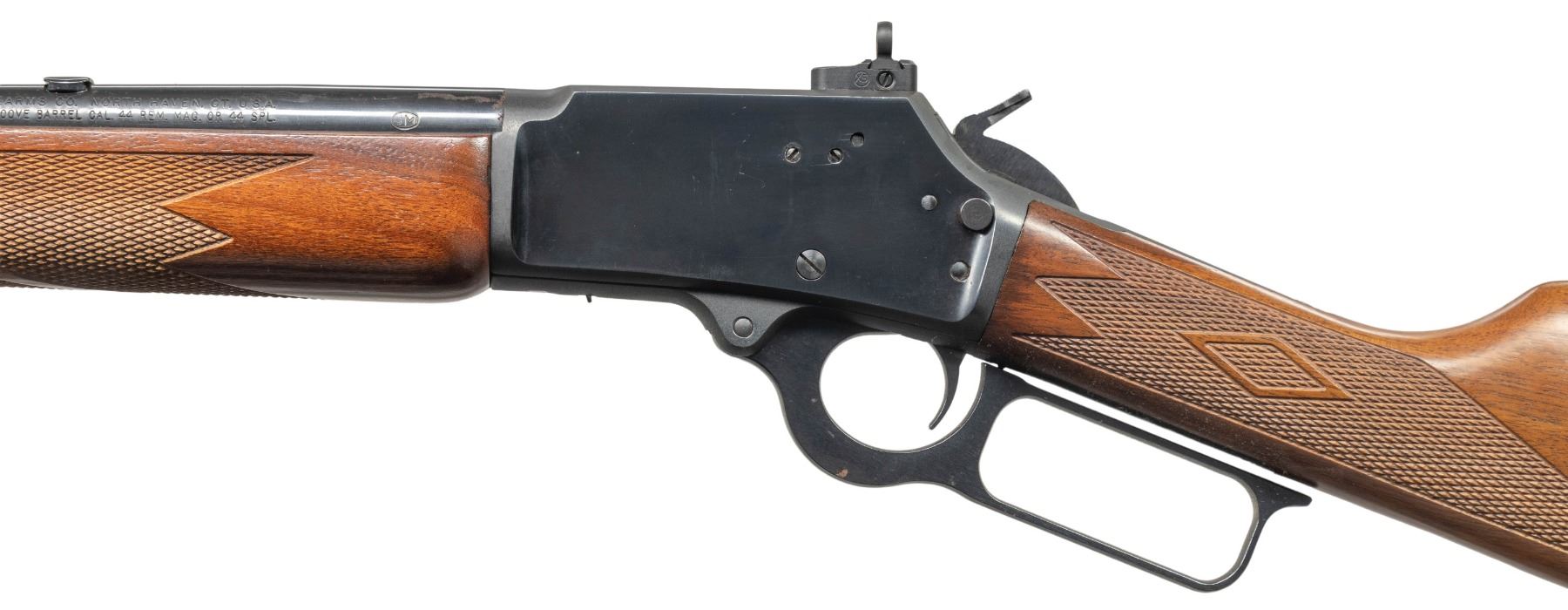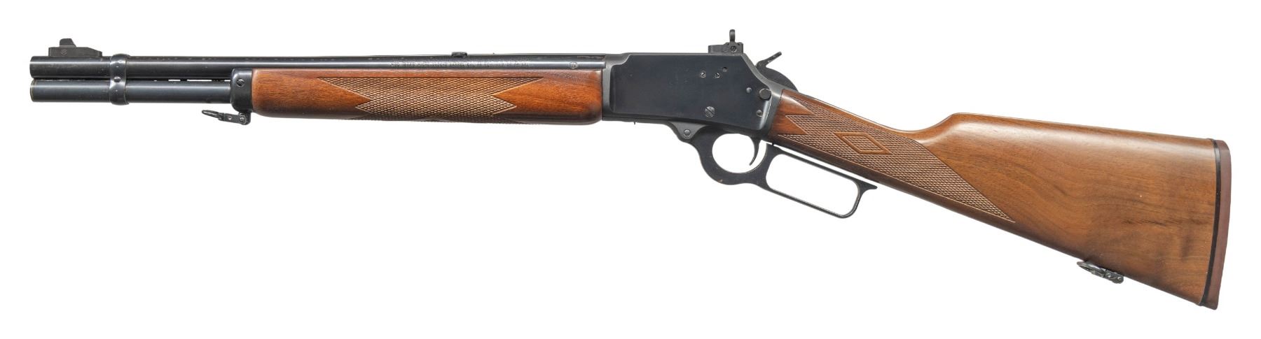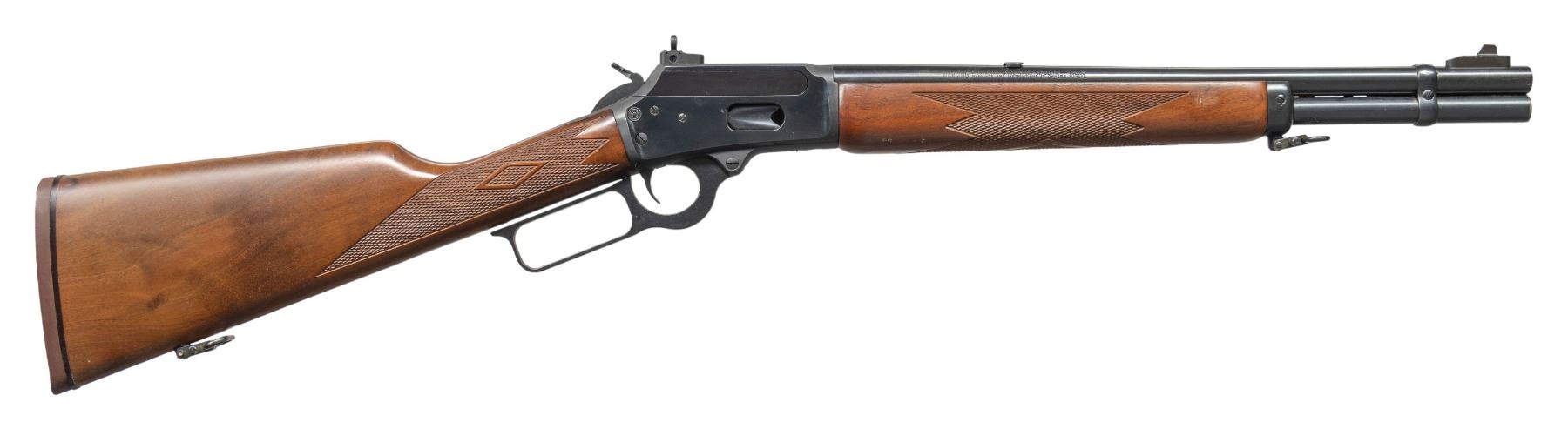 CAL. 44 Rem. Mag. or 44 Spl. S# 06038748. Mfg. 2004. Micro-groove 16.5" bbl. XS Ghost ring sights. Tubular mag. Crossbolt safety. Walnut stock set w/ Marlin pad & sling swivels. CONDITION: all aspects appear very good to near excellent with a few spots of oxidation on barrel & scattered light handling marks. Very good rifling. (25-4786/MD). MODERN. $500-750.