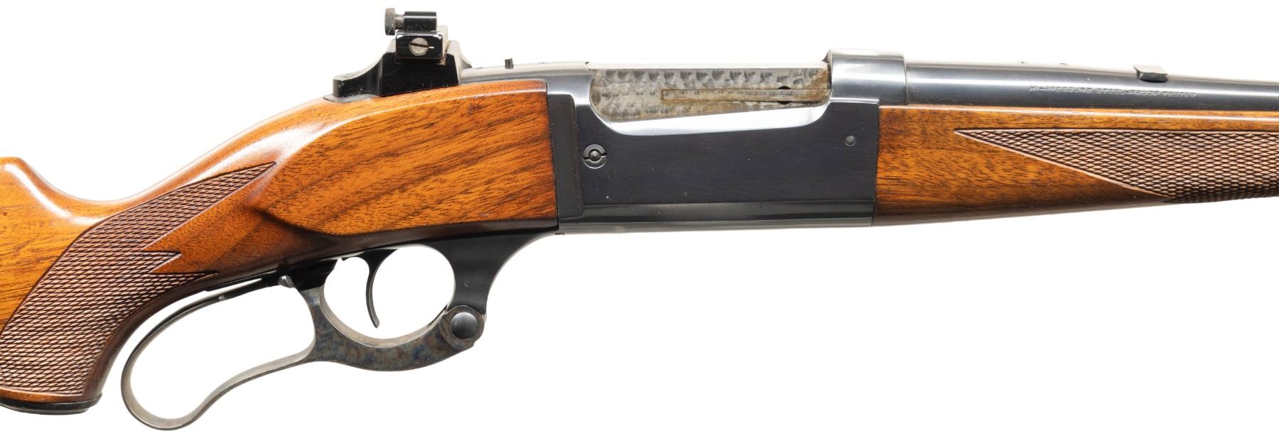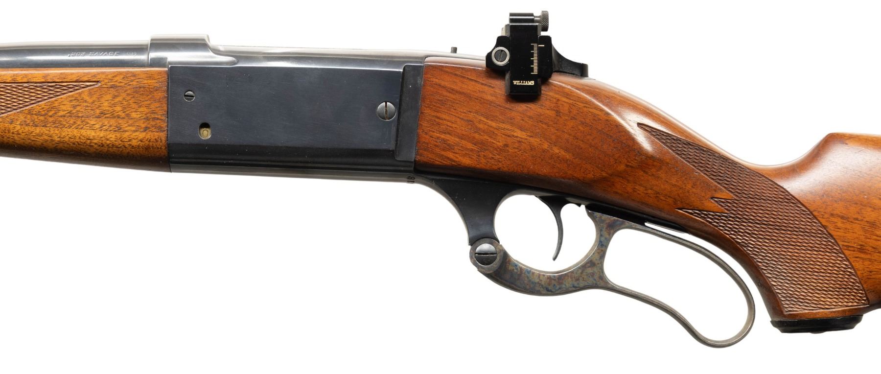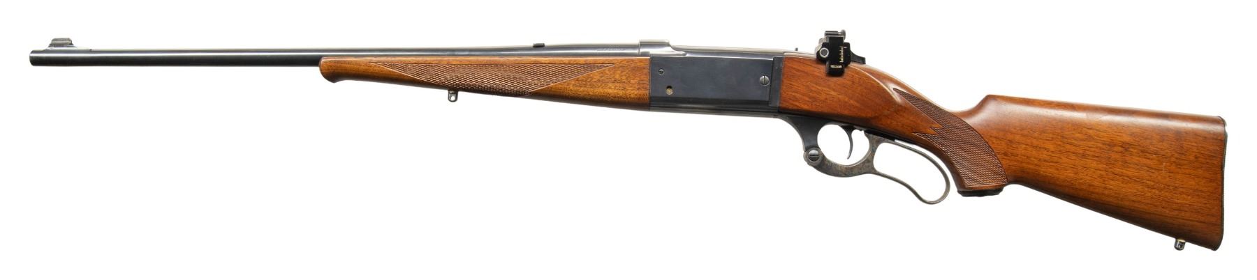 Cal. 303 Sav. S# 371418 (Mfg. 1938). Appears to be a 99EG w/ 22" lightweight bbl. Replacement insert blade front, filler in rear sight & Williams receiver sight; D&T on barrel & receiver for bases. Rotary mag. action w/ brass cartridge counter, sliding lever safety, jeweled bolt & cocking indicator. Walnut stock set w/ added checkering, added sling studs, schnabel forearm tip, black plastic pistol grip & grooved Savage shotgun style buttplate. CONDITION: very good reblued finish & re-case colored lever. Sanded & refinished wood has very good appearance with added cut checkering. Very good rifling with fouling on lands. PROVENANCE: Estate of Groves Herrick. (25-5733/MD). CURIO. $300-500.