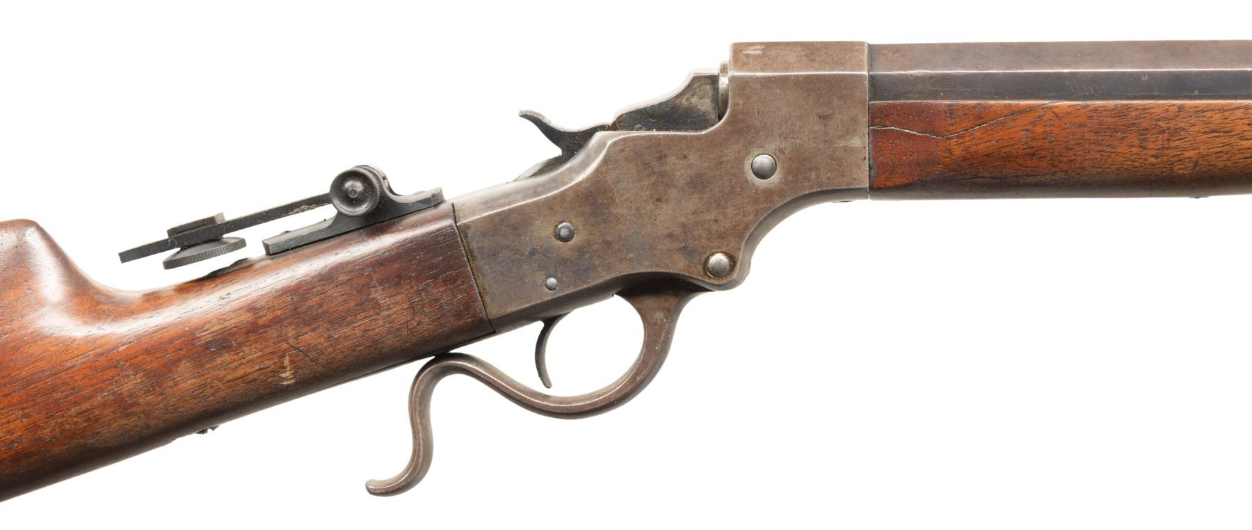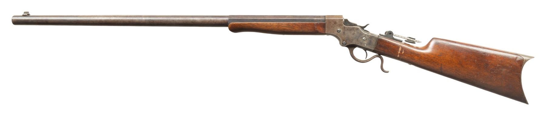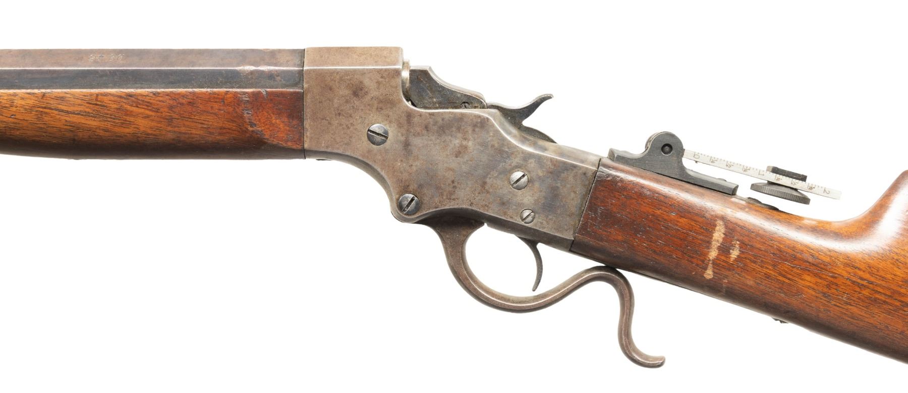 Cal. 28-30 (28-30-120 Stevens). S# 9060. The 28-30 was a special order cartridge by Stevens starting in 1900. Half oct., half rnd. 28" bbl.; 4 holes for scope base. Blade front sight & Modern vernier tang sight. Walnut stock set w/ crescent buttplate. CONDITION: fair fading blue with streaks of brown & gray patina showing peppery oxidation throughout & deep marks on barrel flats. Fair fading case colored with brown patina & scratches. Wood shows large cracks, scuffs on wrist & deep gouges. Good rifling. PROVENANCE: Estate of Groves Herrick. (26-1125/MD). CURIO. $300-600.