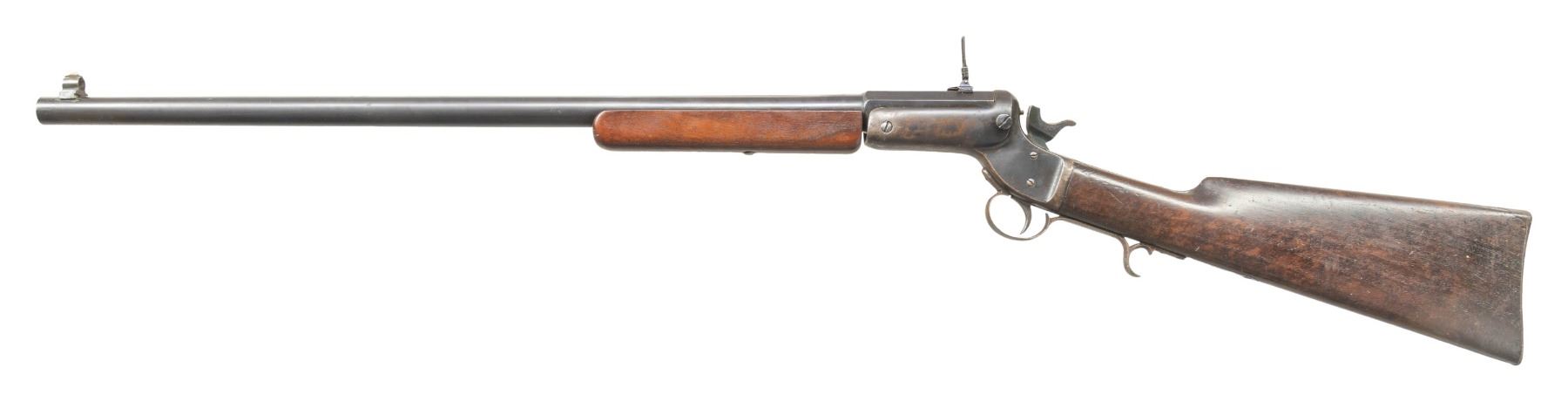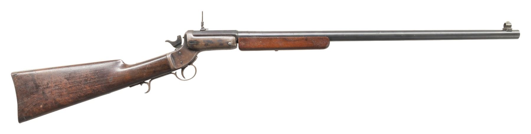 Cal. 44 Long CF. S# 4879. Bbl. 26" w/ walnut forearm. Combination globe front sight & ladder rear sight. Tip-up action w/ mushroom button opening & finger curl triggerguard. Walnut buttstock w/ crescent buttplate. CONDITION: reblued metal finish shows wear & patina on bottom of receiver along with spots of oxidation. Fair worn wood finish with numerous light dings. Good strong rifling with shine & scattered spots of light pitting.
