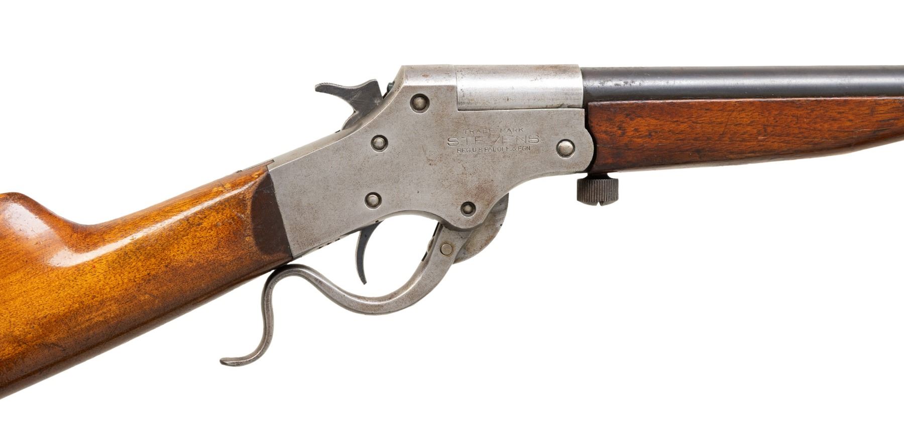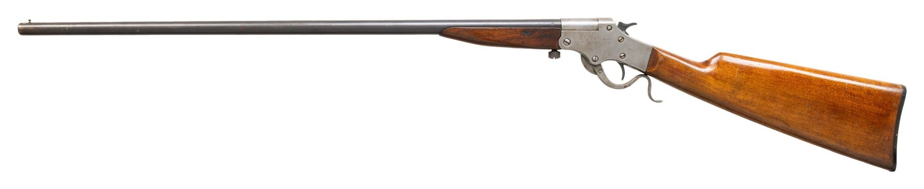 Cal. 44 Shot. S# I244. Mfg. 1914-1920 on a No. 12 Marksman frame as a smoothbore rifle for the 44 XL Shot cartridge. Bbl. 26" w/ brass bead. Tip Up action w/ takedown screw for barrel. Walnut stock set w/ curved buttplate. CONDITION: fair fading barrel blue mixing with brown patina. Receiver has cleaned gray appearance re-acquiring patina. Wood has old added finish w/ peeling along edges, cracks & marks. Bore shows light pitting forward of chamber. PROVENANCE: Estate of Groves Herrick. (25-5668/MD). CURIO. $200-300.