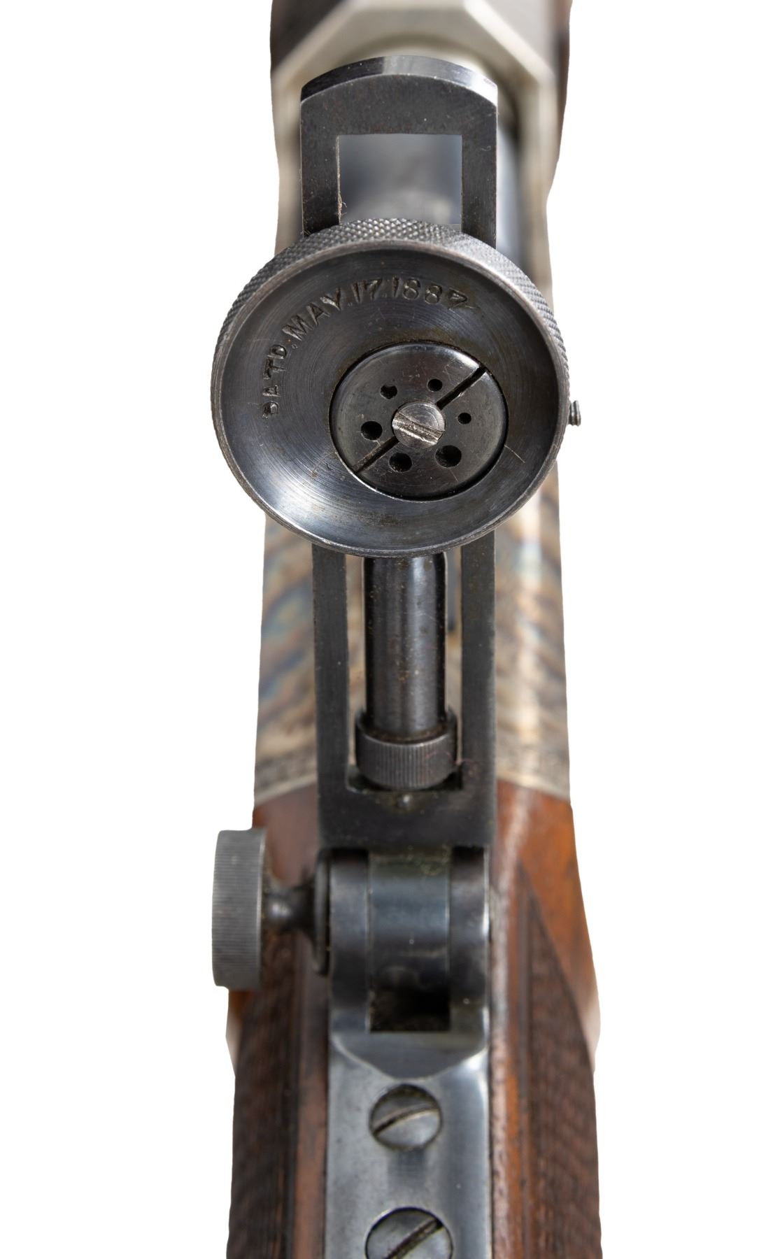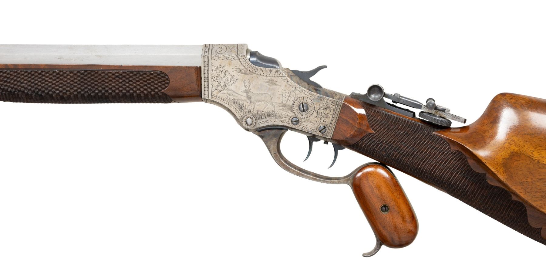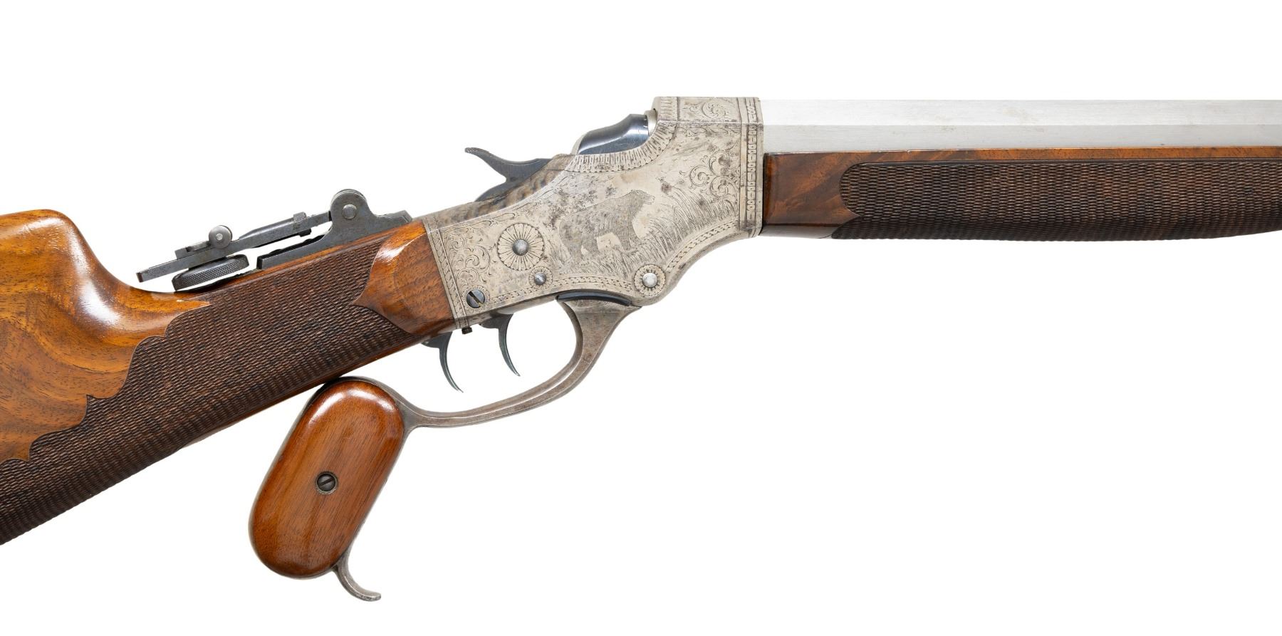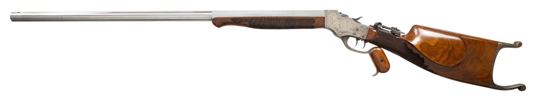 Cal.33-47 CF., using a .333 diameter bullet. S#. 2680. Bbl. 30 7/16" octagon round unmarked replacement style. Open dovetail for the front sight with a Stevens Wind Gauge Vernier tang sight having a No. 104 combination eye cup. No. 44 1/2 falling block action has a drop forged receiver for smokeless powder pressures. Features include: double set triggers, No. 6 Schuetzen Special lever with wood grip inserts and ripple pattern case colors. The Model 54 was Stevens highest grade featuring scroll engraving with game scenes having a bear on the right & a bull elk on the left. Perch belly cheekpiece stock & schnable tip forearm of fancy black walnut w/ elaborate hand checkering. Schuetzen style buttplate is case-colored. CONDITION: the receiver retains lightly visible case colors on protected top & bottom areas. Right side of receiver shows spots of light pitting. The original wood finish shows light wear w/ scattered scratches & marks. The checkering shows some chipped diamonds. The action has a stiff operation when opened & closed. Properly functioning triggers. The replacement style barrel is polished in the white retaining a near excellent bore with non-pope style rifling. (25-6628/DS). CURIO. $1,500-2,000.