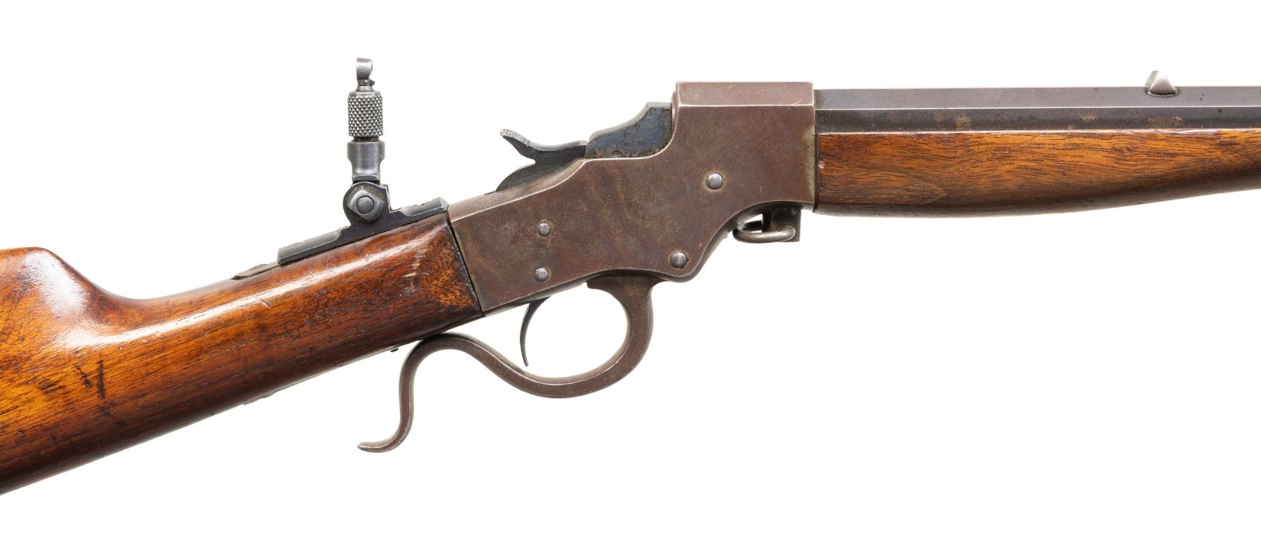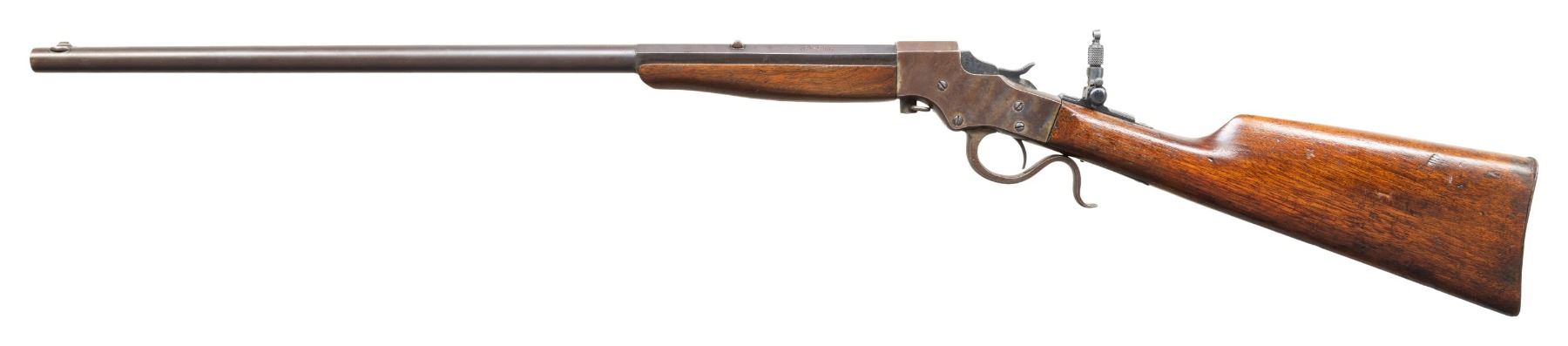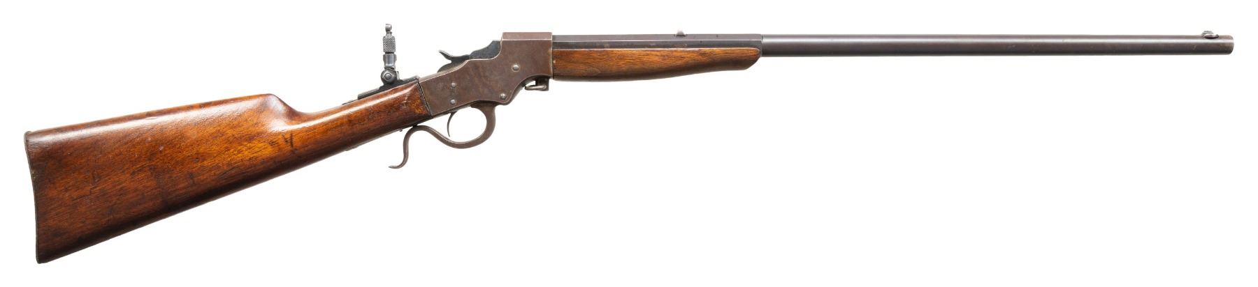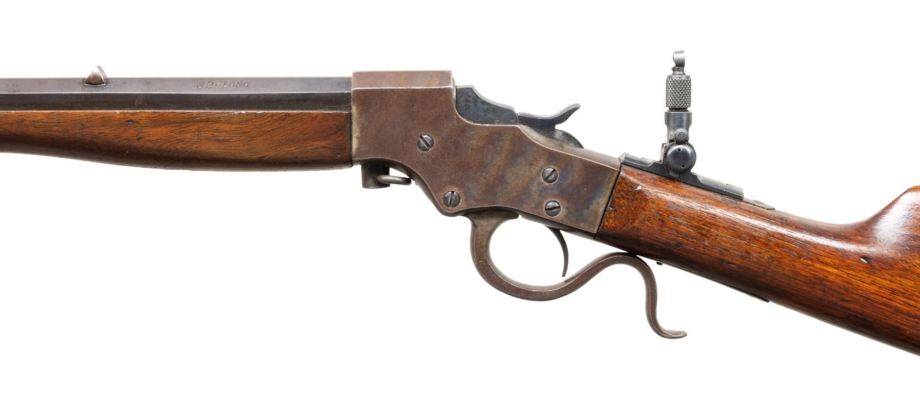 Cal. 32 L (32 Long). S# N60. Bbl. 22" part-rnd. part-oct. Blade front sight. Fixed rear sight. Tang mounted folding aperture rear sight that appears newer than rifle. Tang sight does not fold rearward. Blued bbl. Case colored action. Hardwood stock set. CONDITION: stock appears sanded with added finish, a crack on top of wrist behind upper tang, some chipping around buttplate, scattered dings & handling marks. Metal shows overall fading to gray with strong traces of case colors, bluing, scattered oxidation & edge wear. Action functions properly when hand cycled. Bore shows some light pitting but strong rifling. PROVENANCE: Estate of Groves Herrick. (25-6151/MJC). CURIO. $200-300.