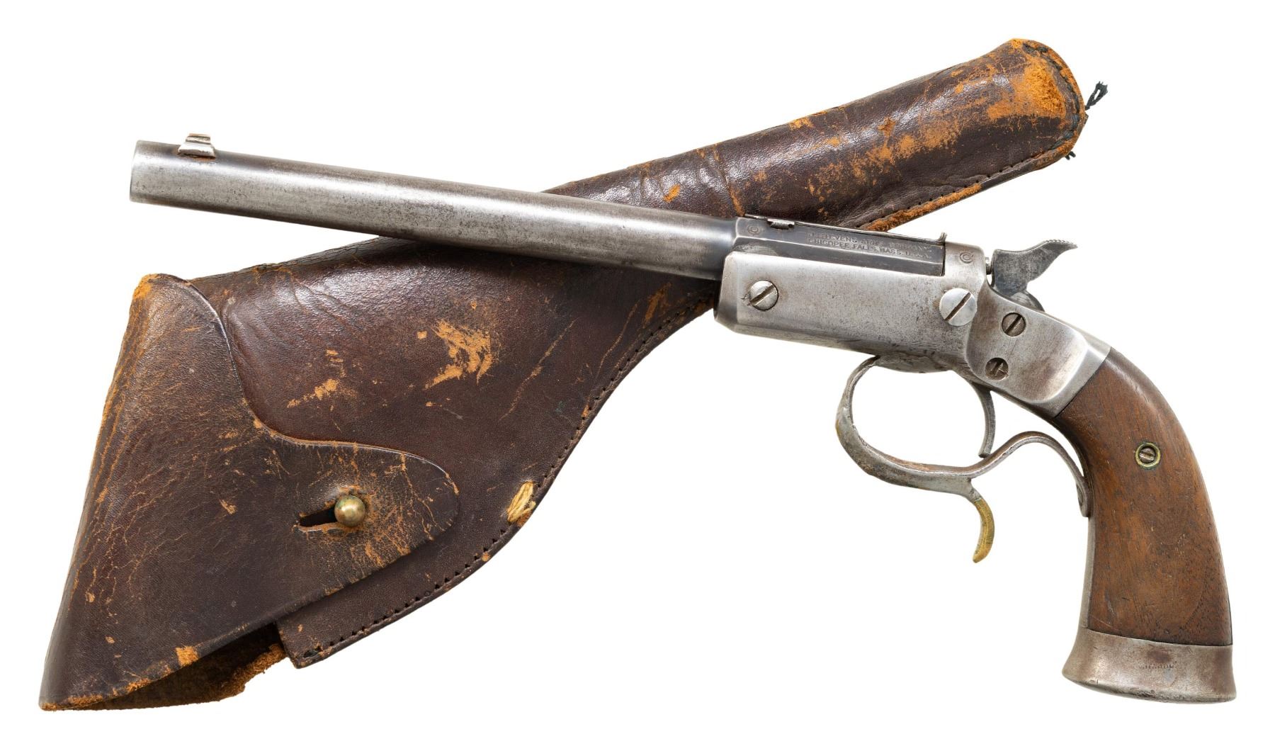 Cal. 22 LR. S# 20376. Matching numbered 8" barrel. Blade front sight & rear sight missing elevator. Iron frame with walnut grips; triggerguard has solder attachment with added brass finger curl that was soldered to bow. Back of left panel has hand scratched "AL5". UNATTACHED ACCESSORIES: fair brown leather holster w/ replacement belt loop. CONDITION: barrel has traces of blue with balance being gray patina with oxidation & marks. Frame has gray appearance with deep strike marks & light pitting. Fair worn grips w/ marks. Heavily worn rifling. PROVENANCE: Estate of Groves Herrick. (25-5689/MD). CURIO. $300-400.
