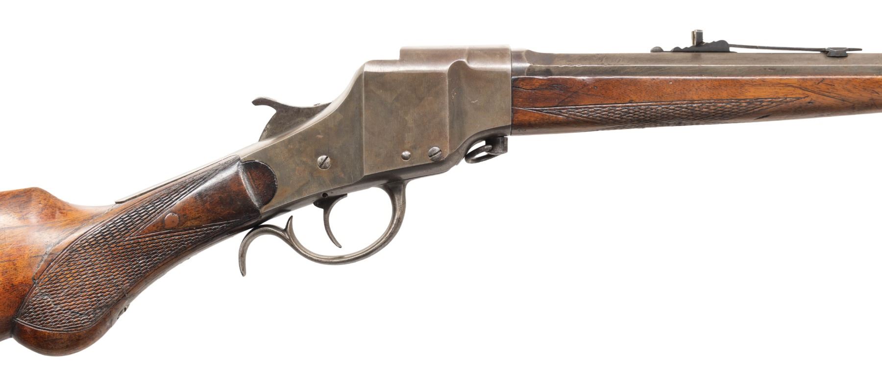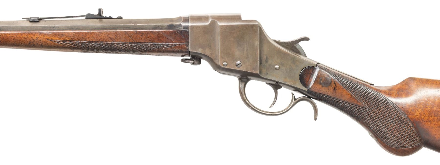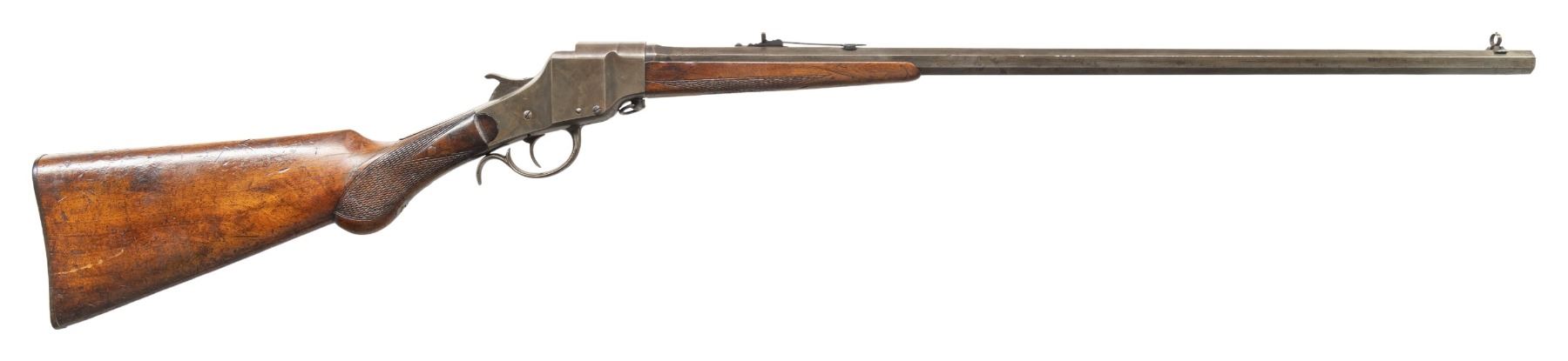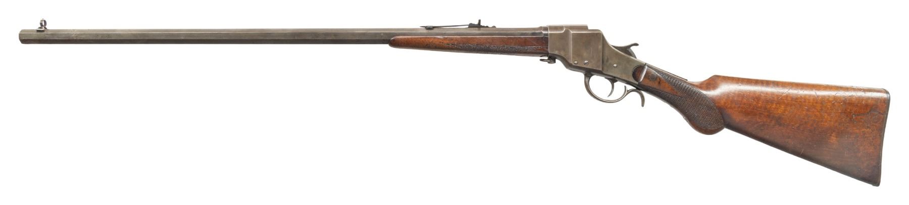 DOWN RIFLE. Cal. 32-20. S# 164. Single shot falling block with rebounding hammer, 26" octagonal barrel marked "MADE BY THE HOPKINS & ALLEN ARMS CO. NORWICH, CONN. U.S.A.". Marbles adjustable sights, checkered walnut stock and forearm, hard rubber Hopkins & Allen logo buttplate. CONDITION: very good, traces of blue & case colors, stock has pinned repair rear of frame, mechanics fine, bright shiny rifled bore. PROVENANCE: Estate of Groves Herrick. (01-28364/JS). ANTIQUE. $300-500.