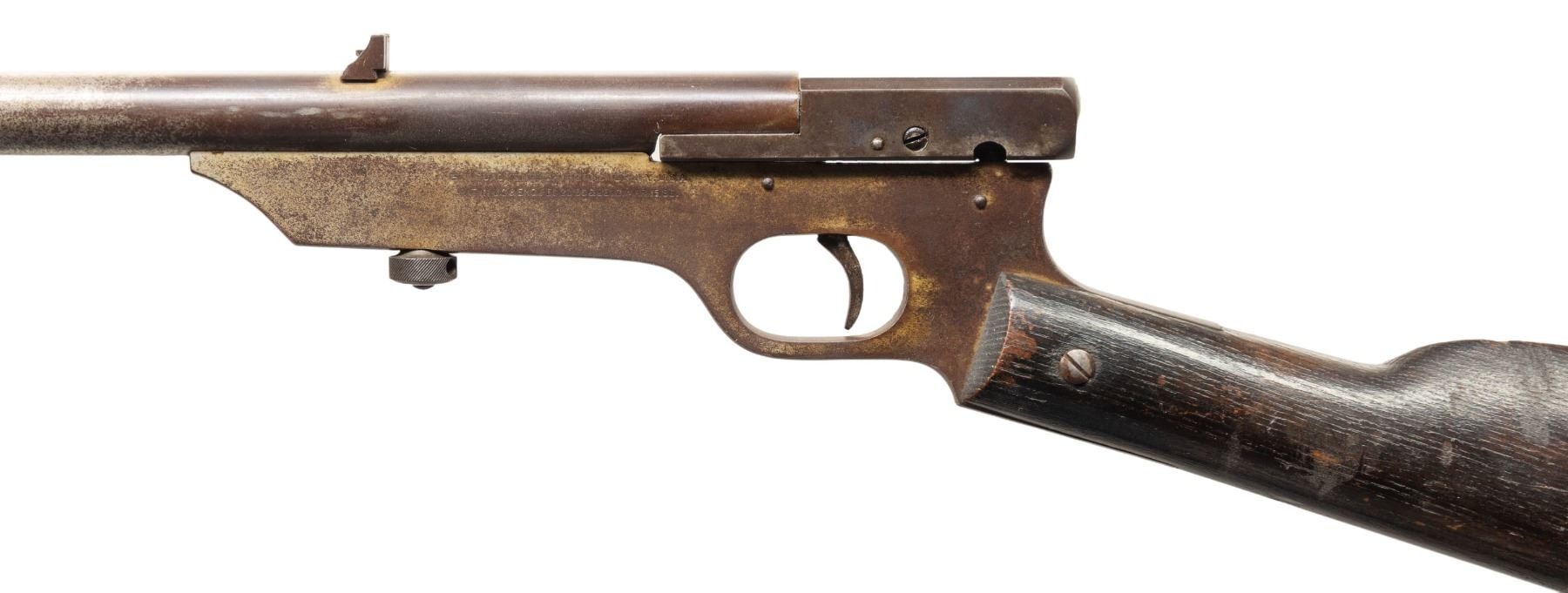 Cal. 22 S, L, BB. NSN. Mfg. 1890-1896. Nickel finished 18" bbl. Post front sight & adj. rear sight. Swivel breech. Nickel finished receiver. Walnut straight grip buttstock w/ iron crescent buttplate. CONDITION: large portions of frame & barrel has faded to brown patina with marks. Good appearing wood finish with large marks. Bore shows strong rifling with pitting. PROVENANCE: Estate of Groves Herrick. (01-28897/MD). ANTIQUE. $200-300.