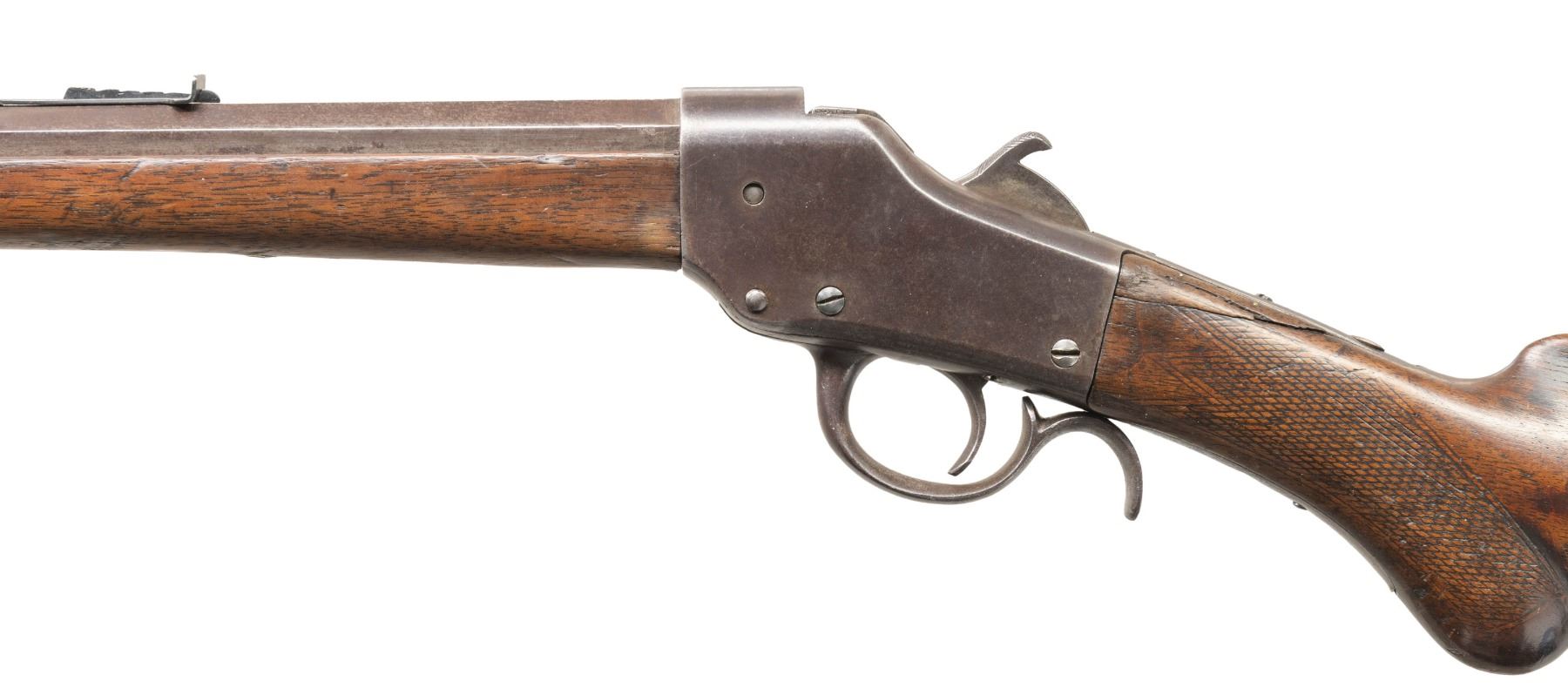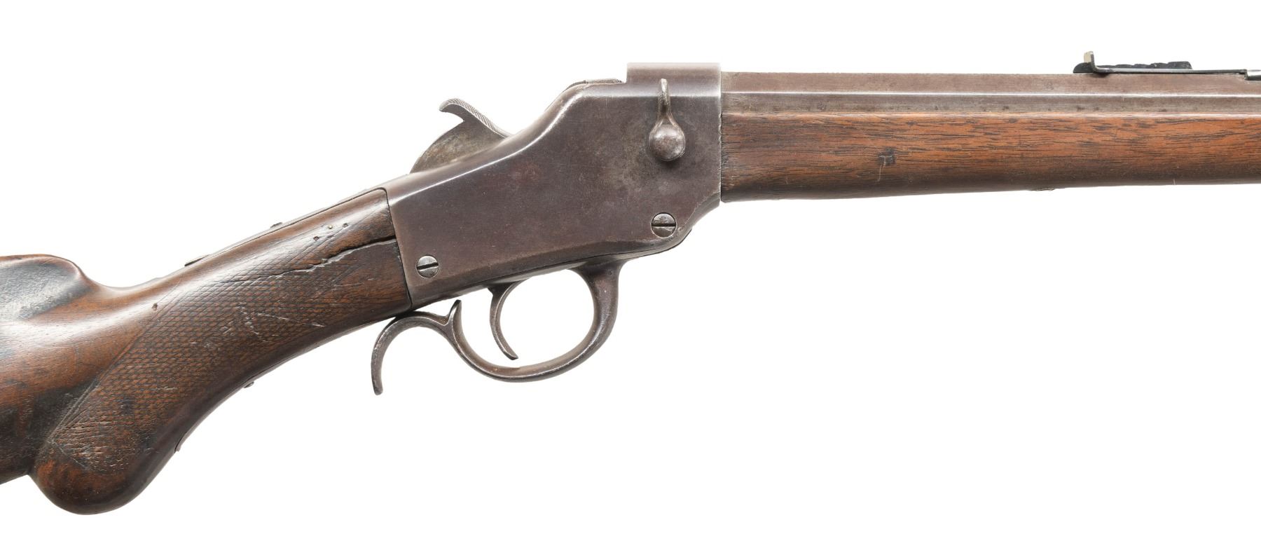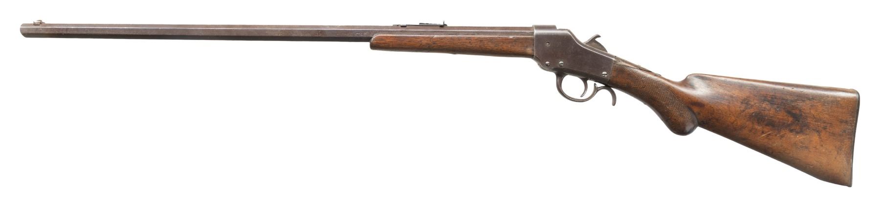 SINGLE SHOT FALLING BLOCK RIFLE. Cal. appears to be 32 RF. S# 406 (on face under forearm). Mfg. 1886 before the company moved to Norwich, CT. Oct. 26.25" bbl. Blade front sight & replacement elevator rear sight. Falling block single shot action w/ unique sliding breech face allowing conversion between rimfire & centerfire. Walnut stock set w/ hard rubber buttplate. CONDITION: metal has brown/gray patina appearance with corrosion & marks. Fair worn wood finish with deep marks,missing piece at toe & repaired break at wrist. Pitted rifling. PROVENANCE: Estate of Groves Herrick. (01-28312/MD). ANTIQUE. $300-400.