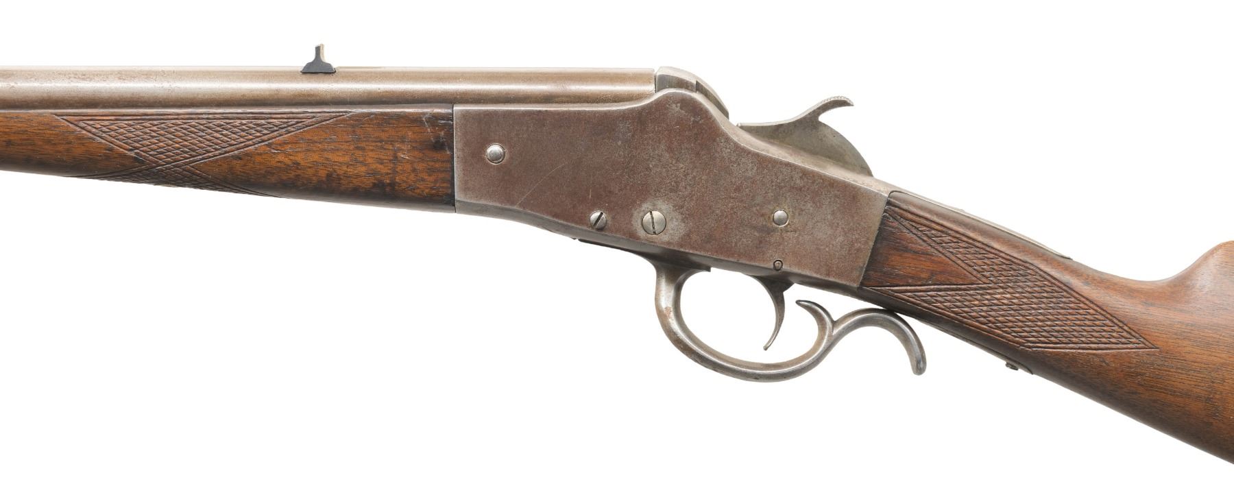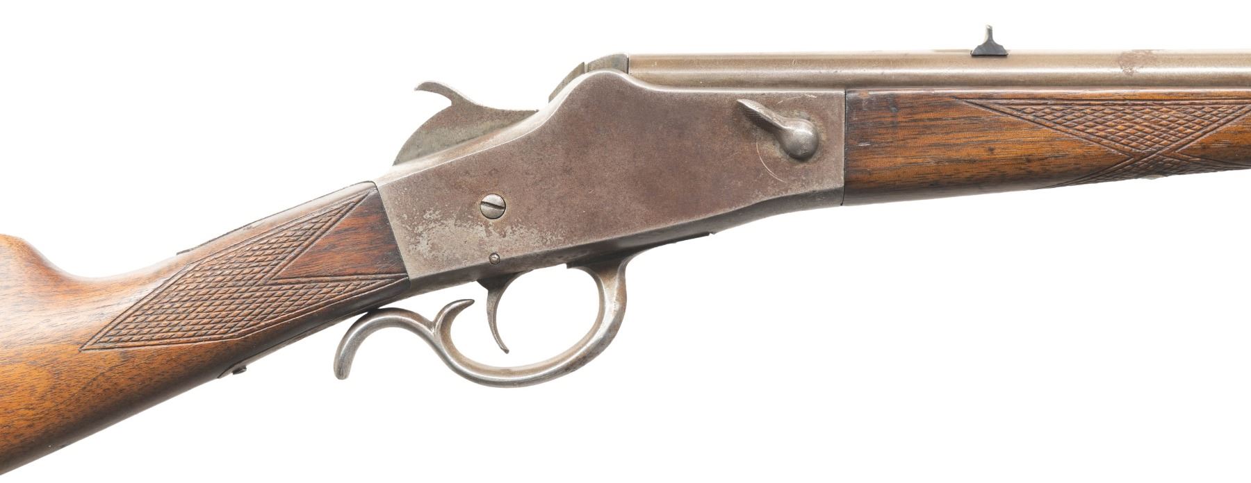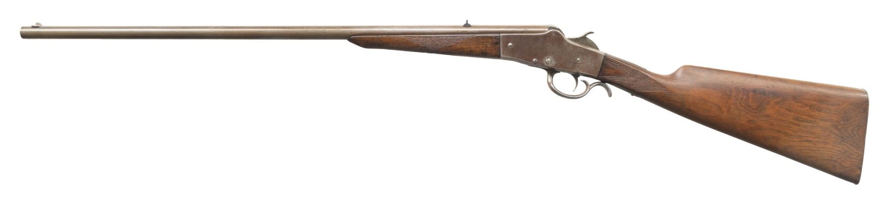 RIFLE. Cal. 32 RF. S# 6469 (on face of frame under forearm). Mfg. 1890-1896. Rnd. 24.25" w/ sporting sights. Takedown falling block action. Walnut stock set w/ sheet metal buttplate. CONDITION: metal has gray/brown patina appearance with areas of prior pitting & spots of corrosion. Sanded & lightly refinished wood has re-cut checkering & numerous marks. Fair worn rifling with pitting. PROVENANCE: Estate of Groves Herrick. (01-28344/MD). ANTIQUE. $100-200.